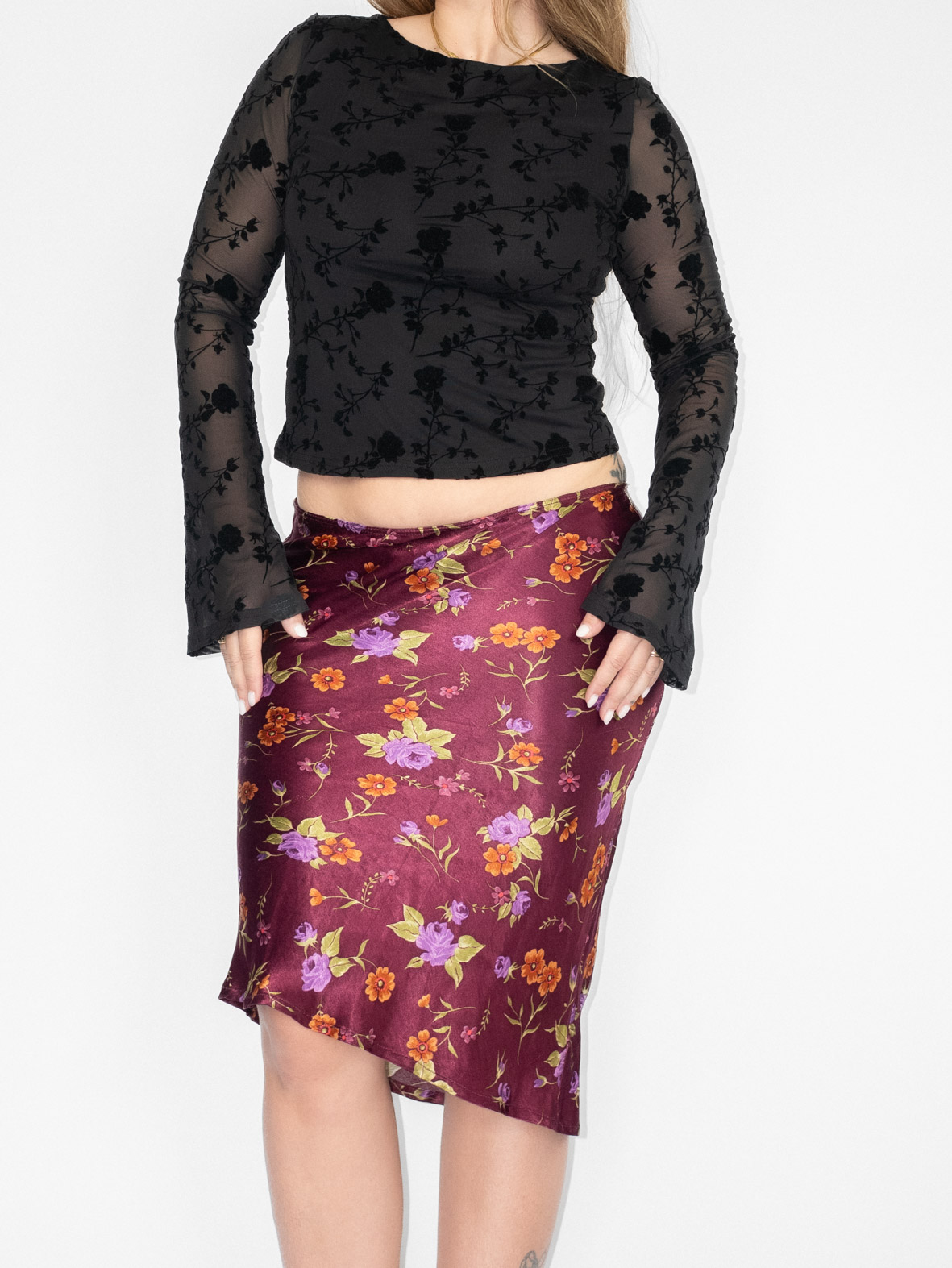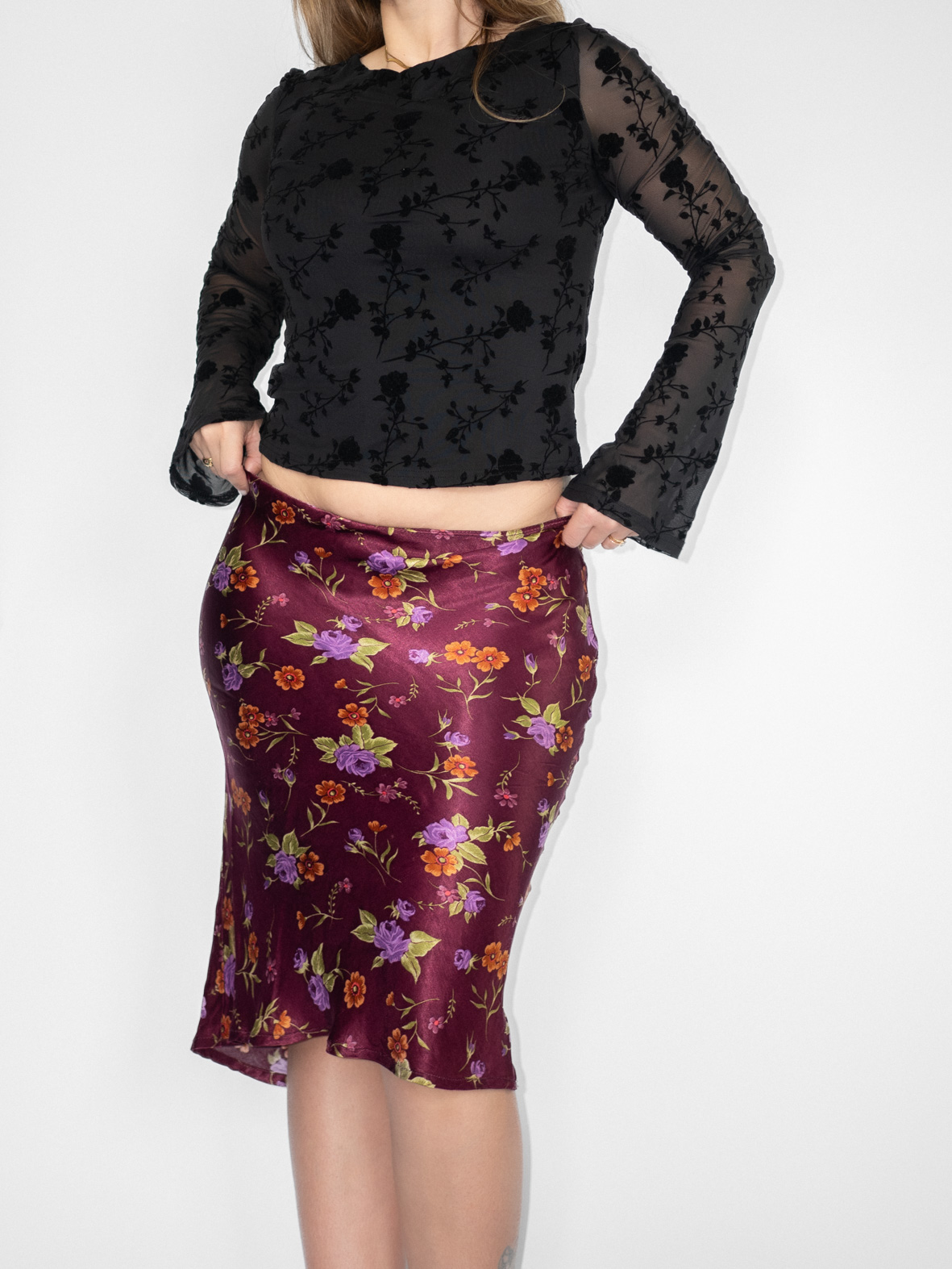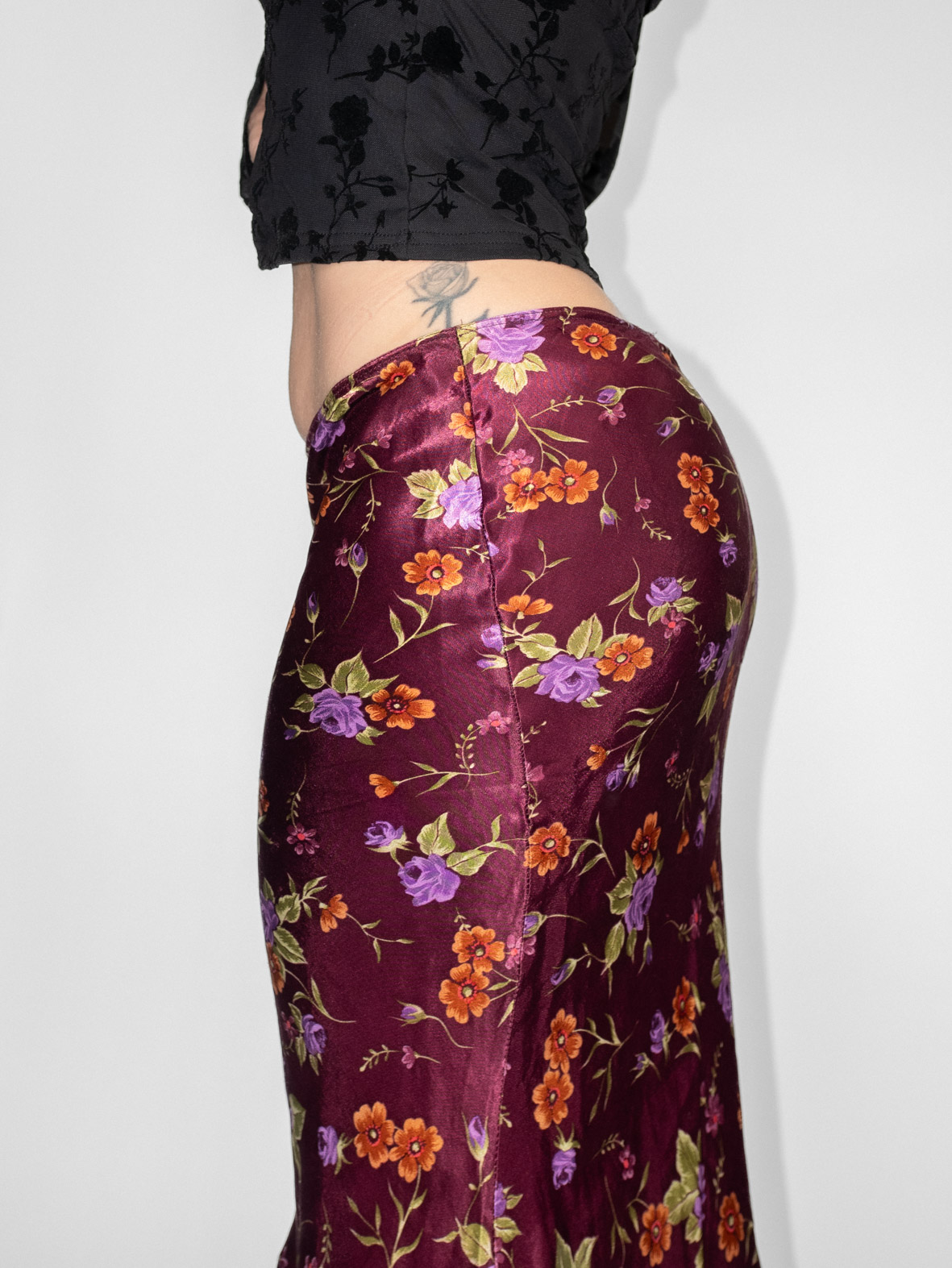 Satin midi skirt in a deep burgundy tone with a soft flowy silhouette. Classic 00s vibe.
