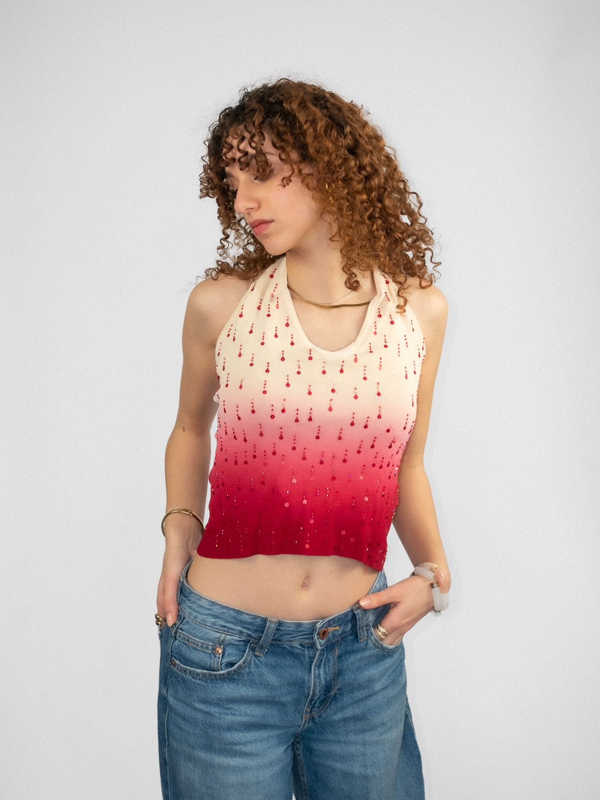 Playful vintage halter neck top featuring an all-over cherry print. Cropped length with a stretchy fit that hugs the body beautifully. The halter neckline highlights the shoulders and gives classic flirty 2000s summer energy.