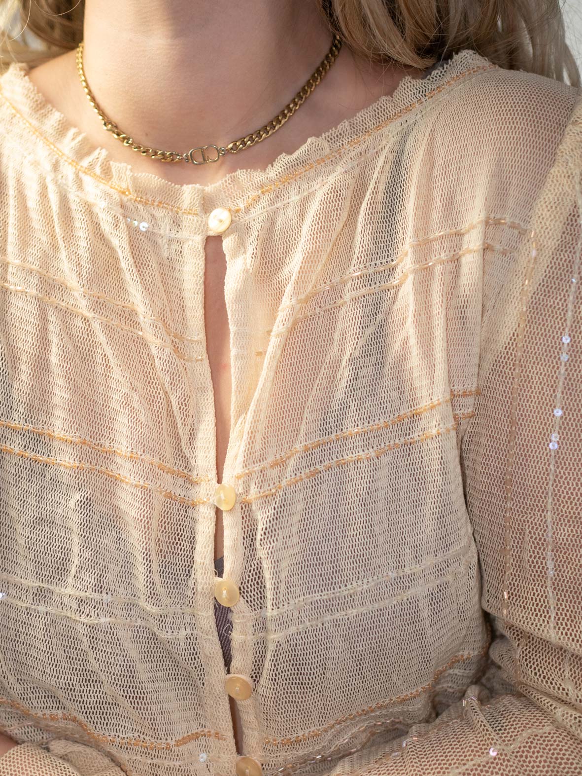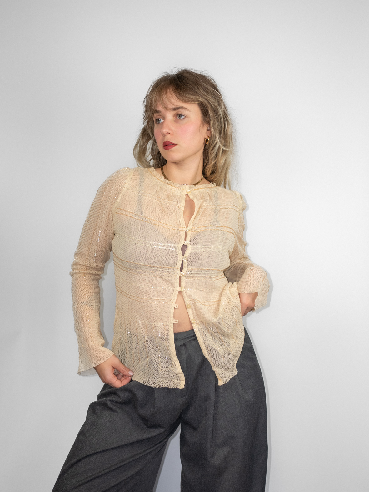 Elegance meets detail in this beige cardigan adorned with glass beads. A perfect piece for layering, it elevates any outfit with its refined style. Carefully sourced by Evita for sustainable fashion lovers.