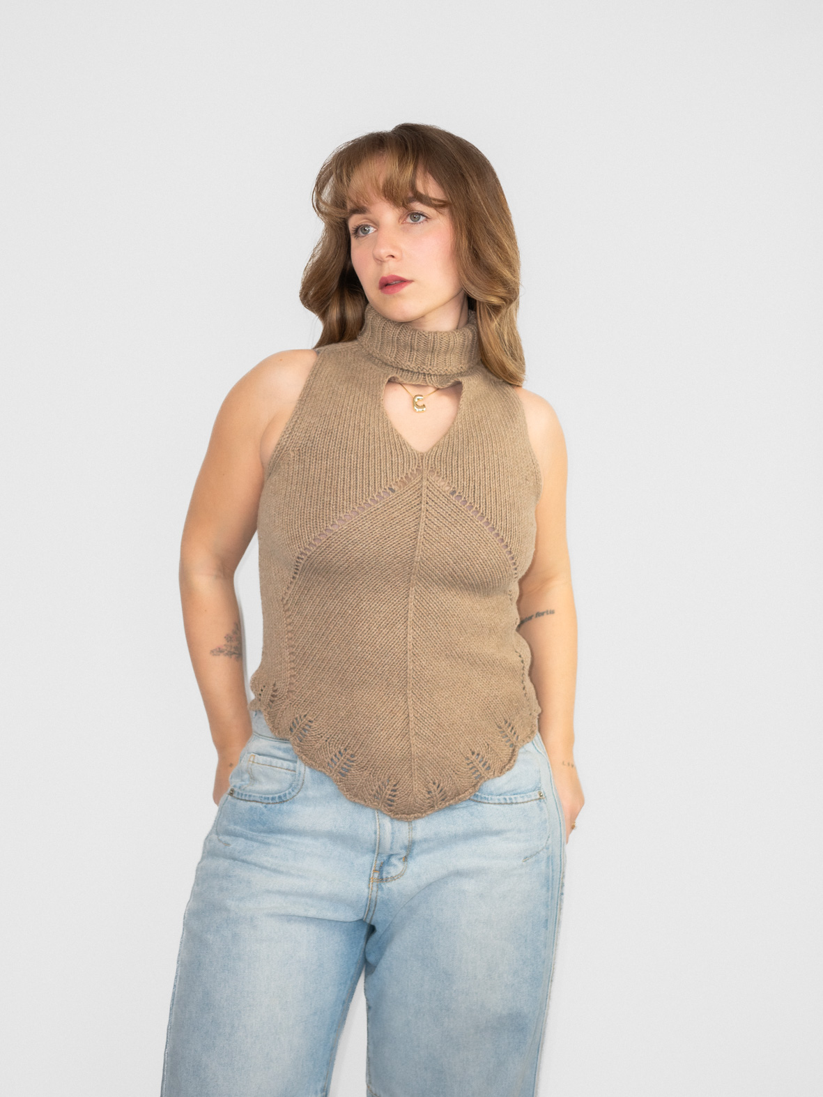 Soft beige knit top with a clean V-shaped neckline and a flattering fitted cut. Understated 90s minimal aesthetic.