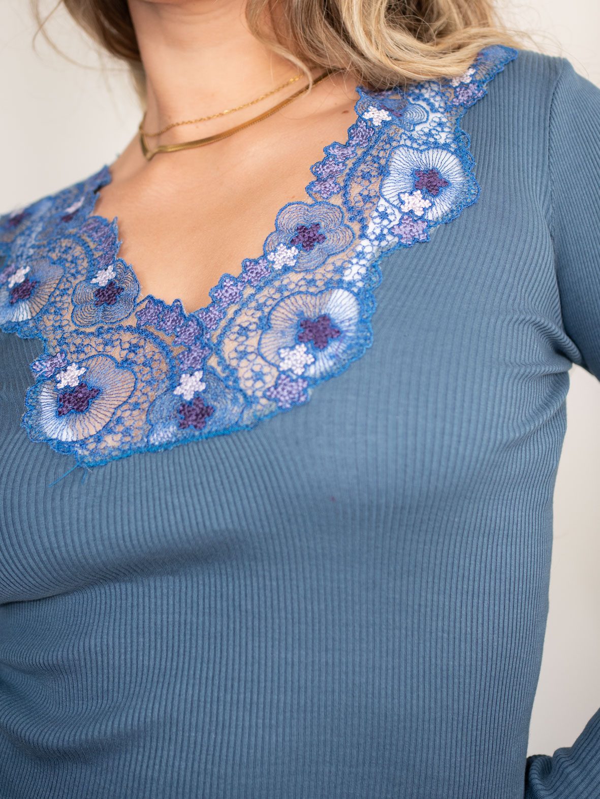 This slate blue long-sleeve top features a deep lace V-neckline with intricate lilac and blue floral embroidery. Feminine yet sleek. Soft, stretchy and flattering.