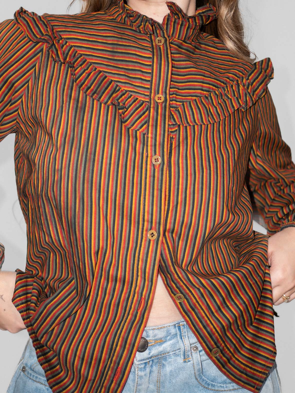 Vintage blouse in a rich brown shade with delicate ruffle details and front button closure. Lightweight fabric with a romantic 90s silhouette.