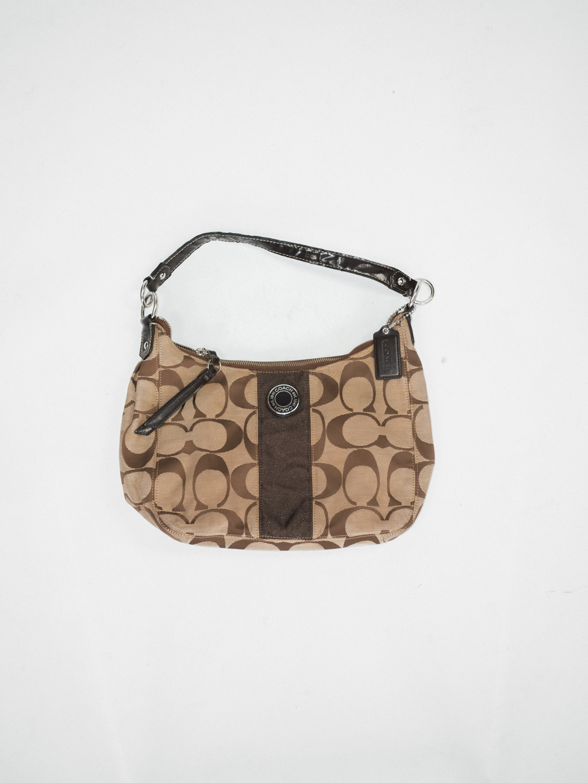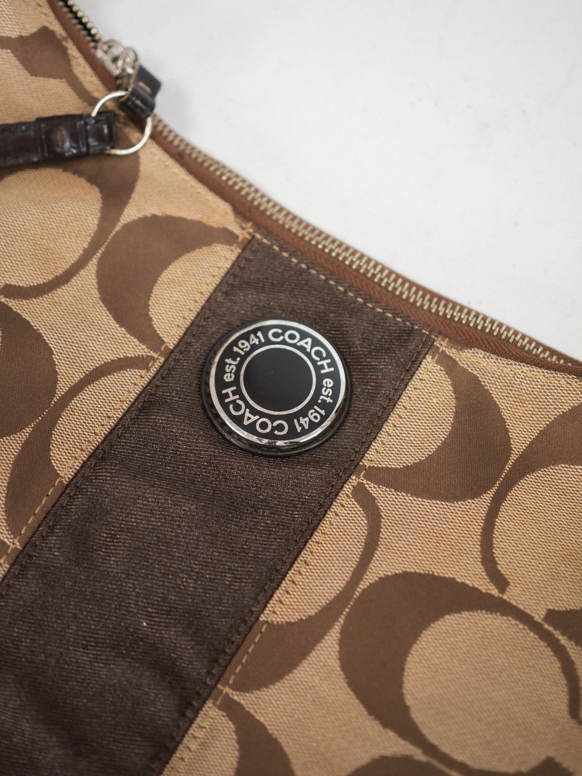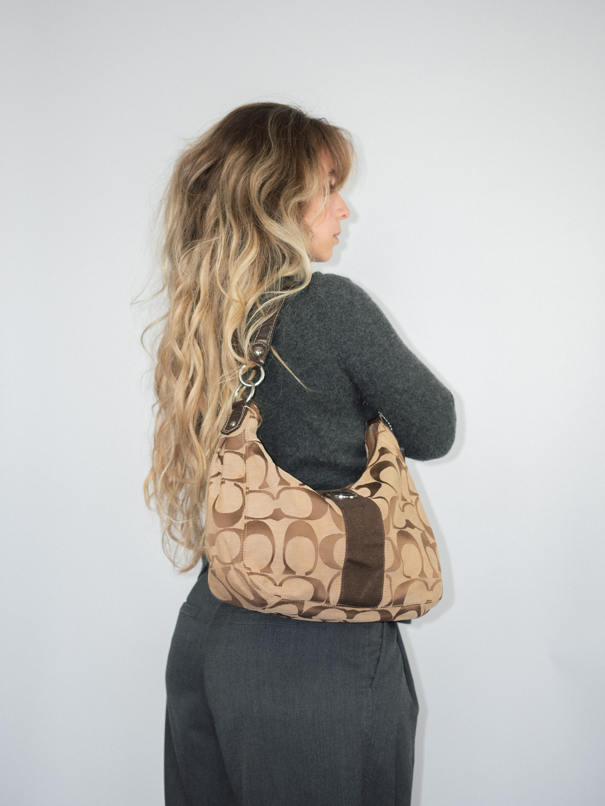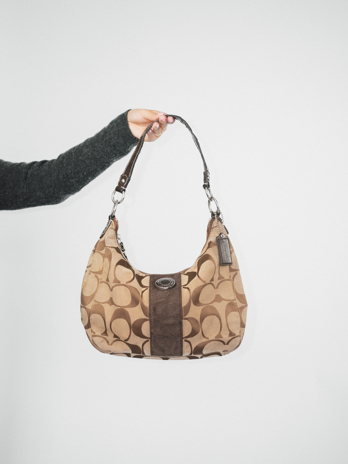 This classic Coach shoulder bag features the signature monogram print in warm brown tones, suede accents, and iconic hardware. Y2K luxury with every stitch.