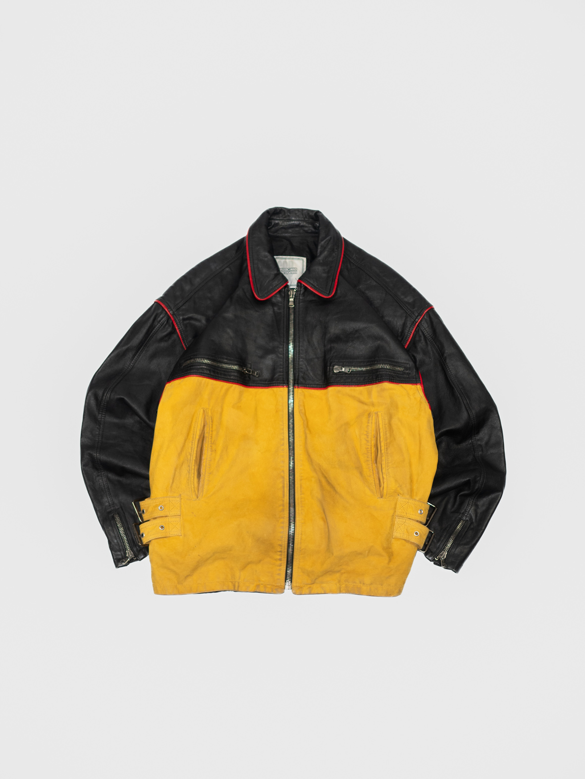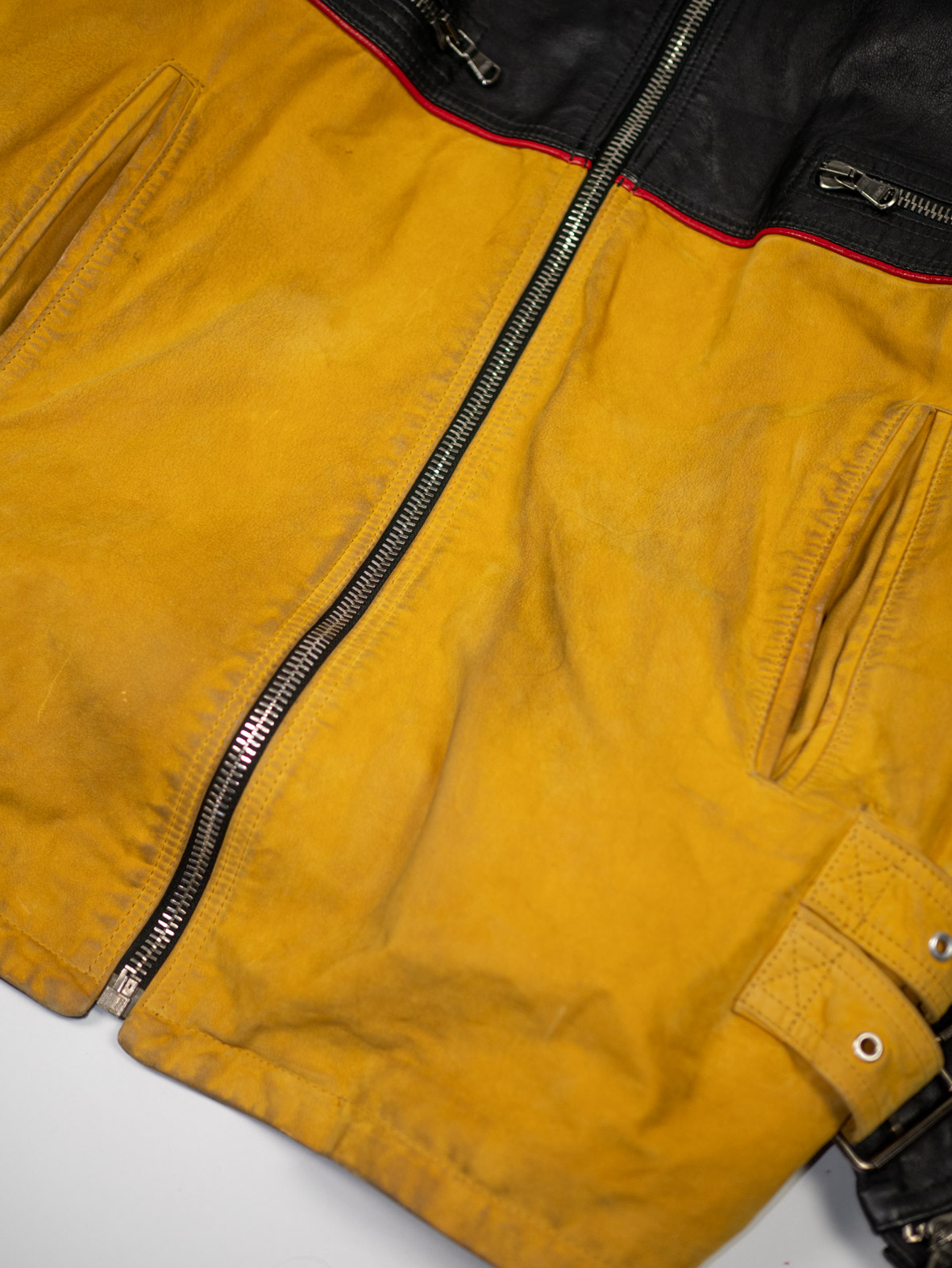 The upper part comes in smooth black leather, while the lower half is soft mustard-yellow suede, giving the jacket that iconic vintage moto look. Adjustable side buckles, metal zippers, and a boxy silhouette complete the aesthetic.