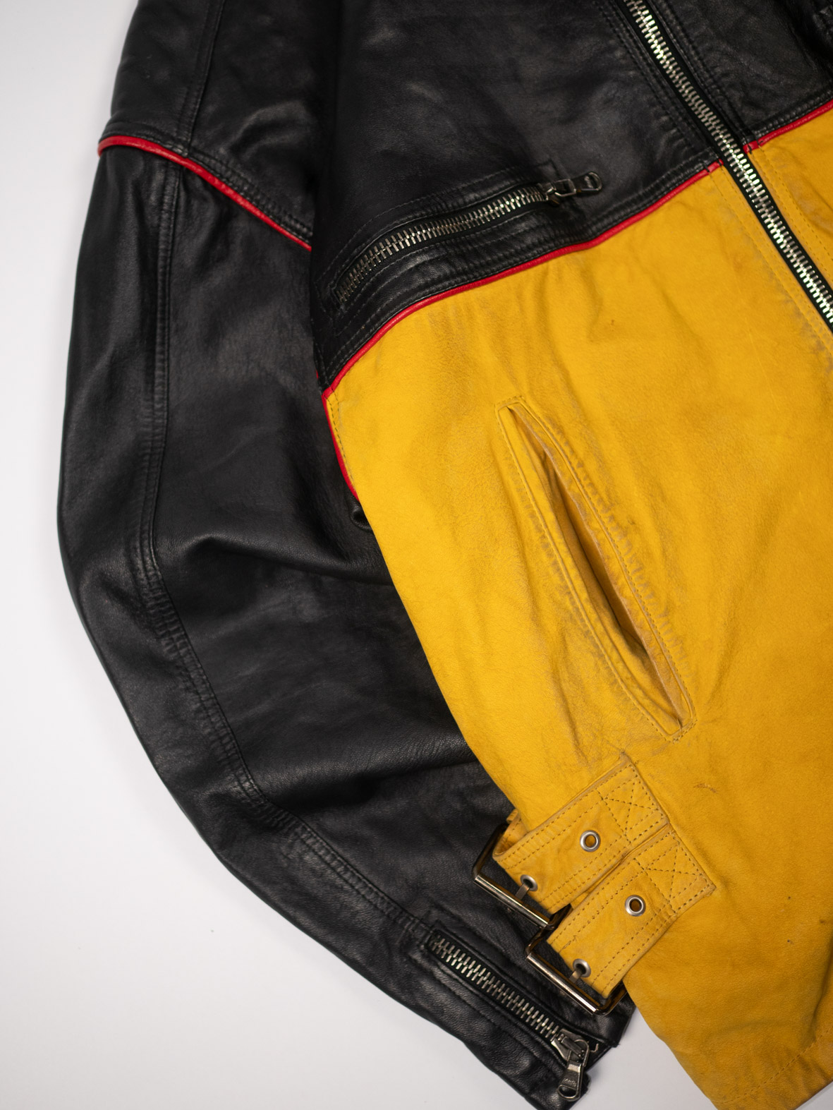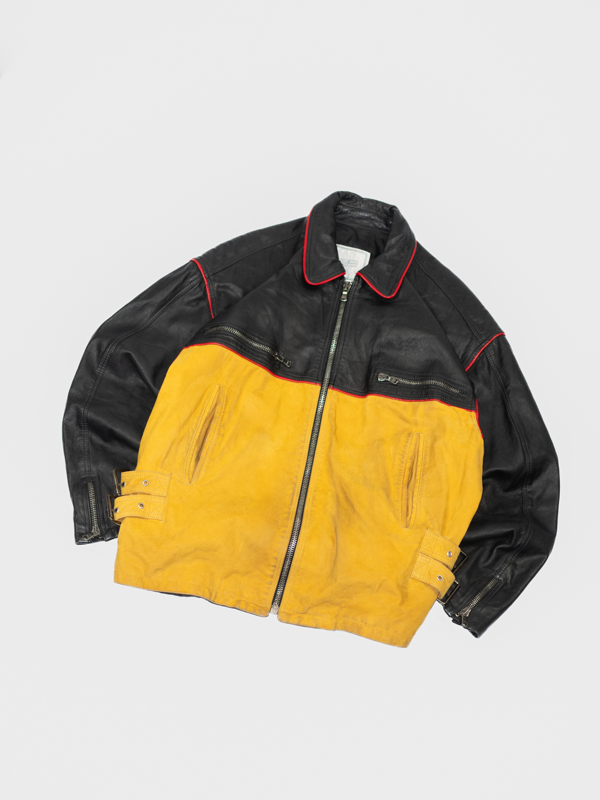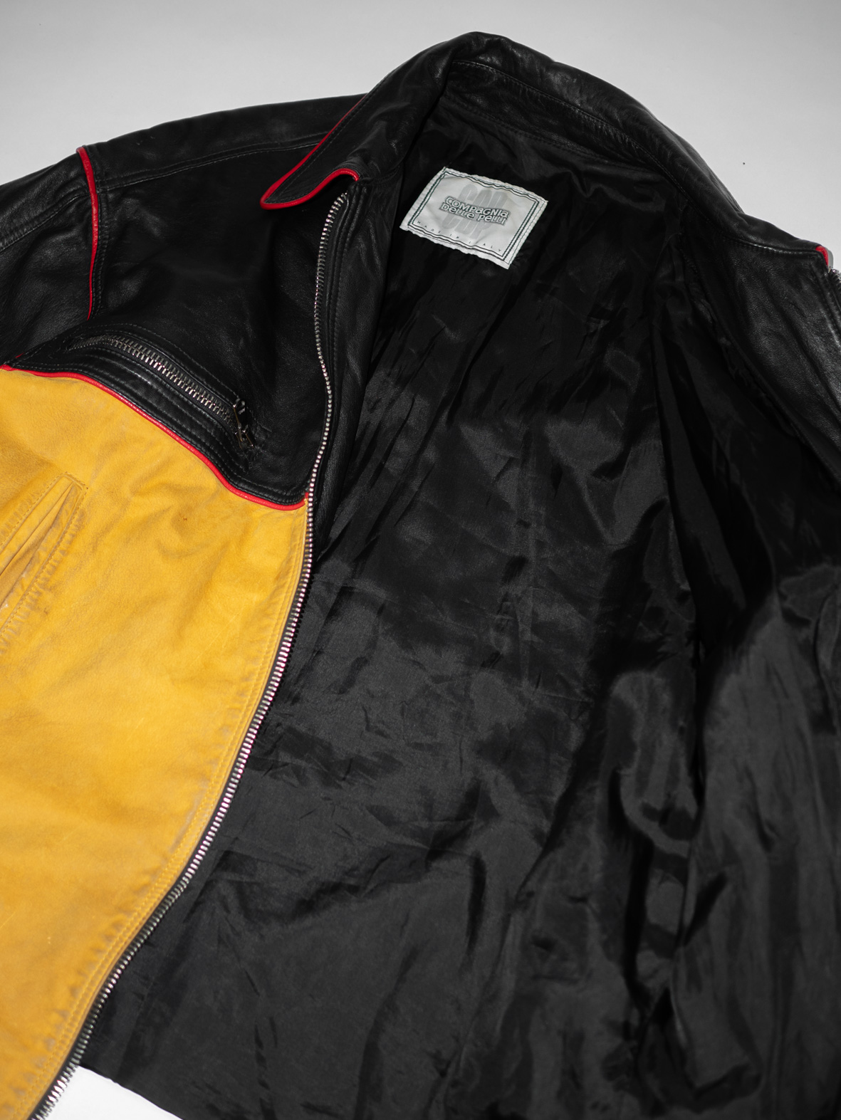 A rare Italian leather statement piece, crafted in the 80s/90s by Compagnia Delle Pelli. Made from genuine Vera Pelleleather, featuring a bold black-and-yellow colorblock design with signature red piping — the kind of piece you don’t come across twice.