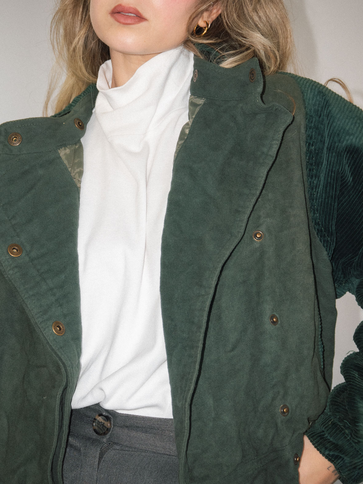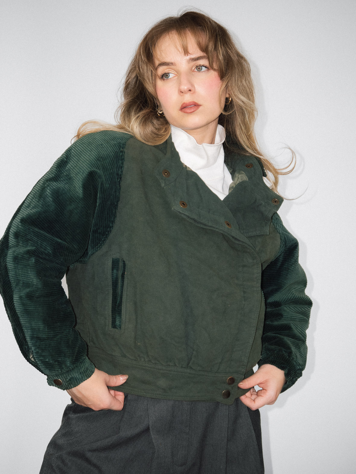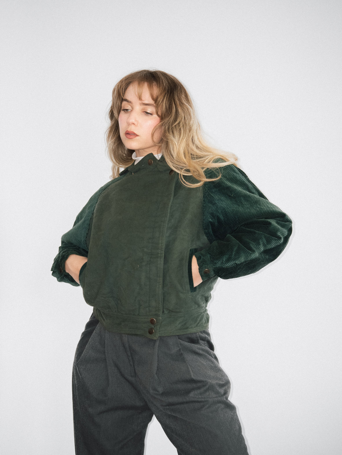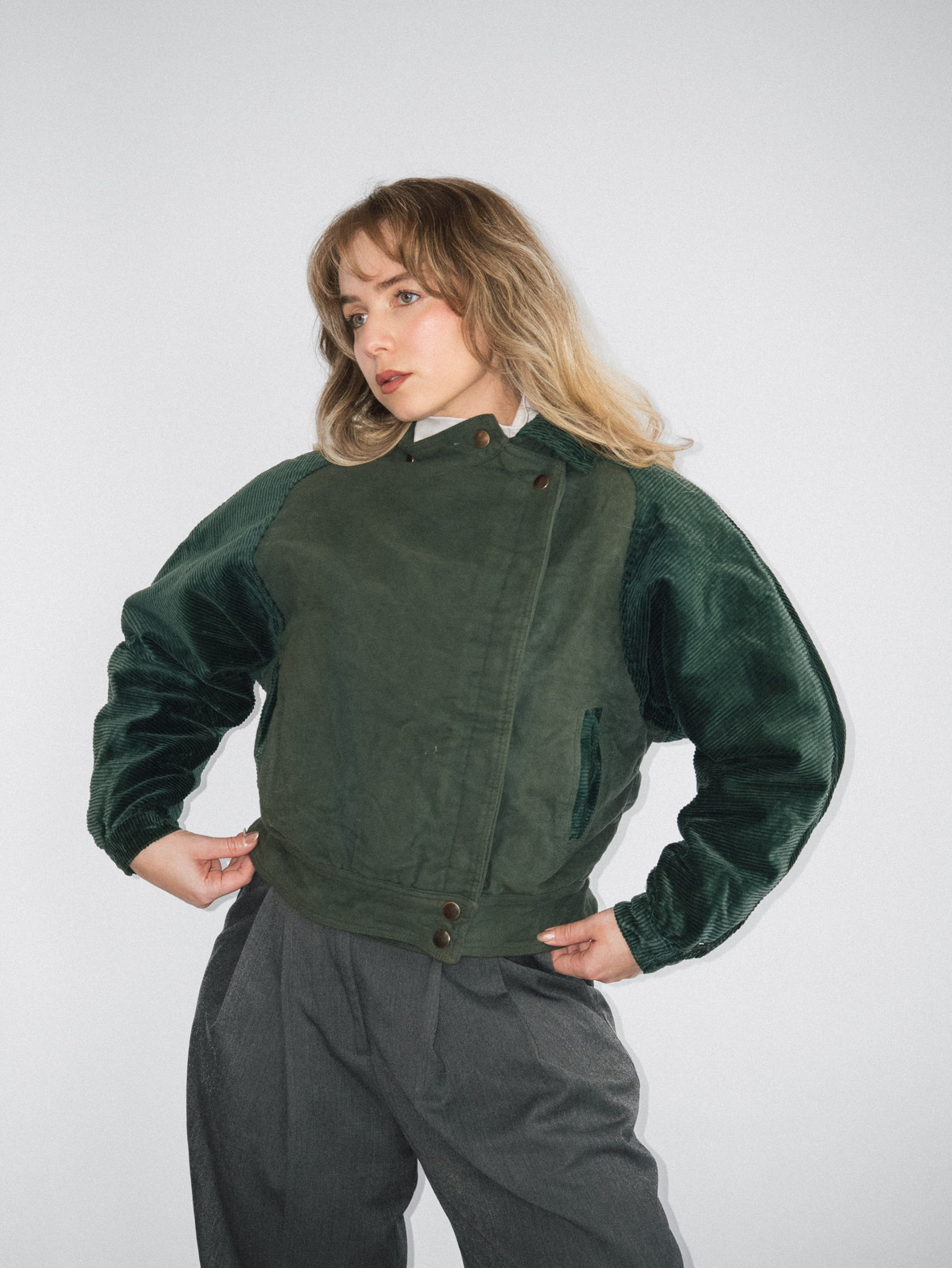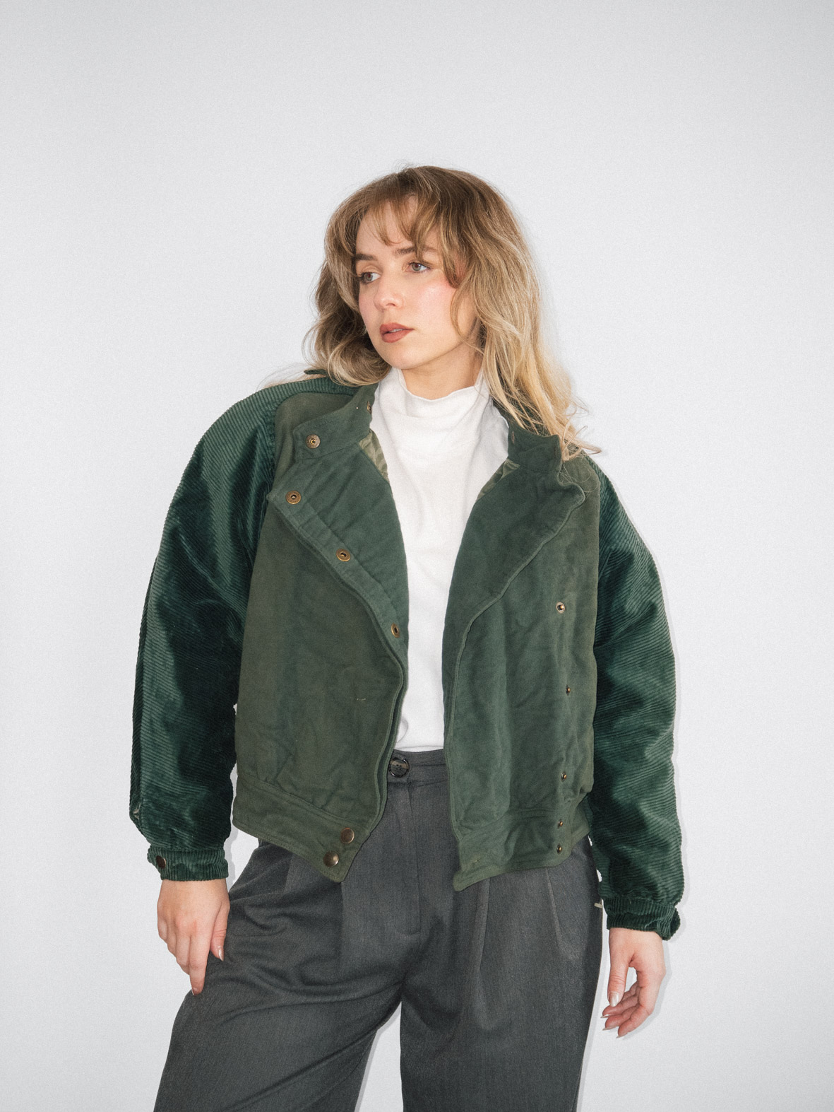Crafted from heavy green corduroy, this vintage bomber jacket is cozy and full of character. Perfect for layering during colder months.