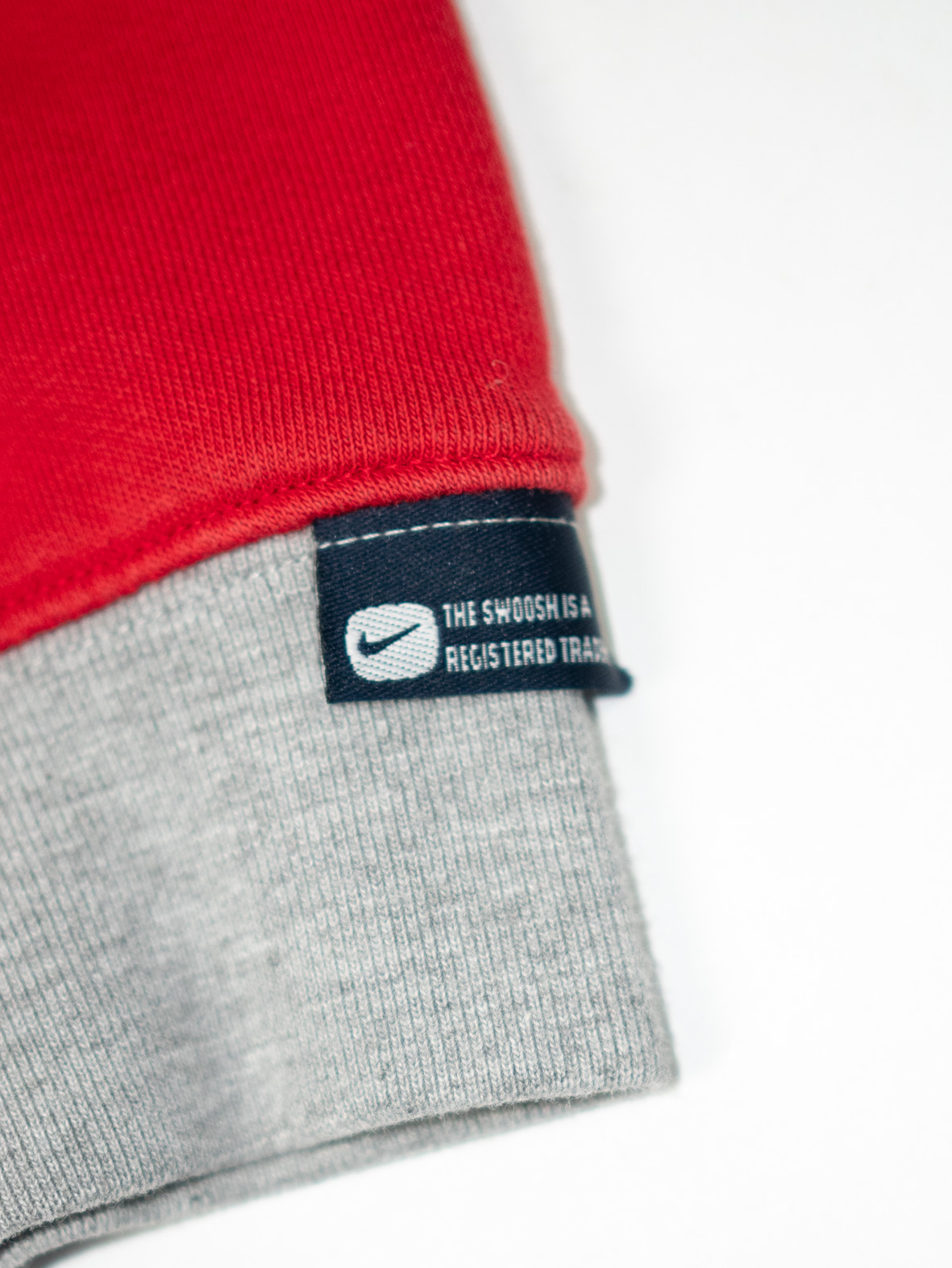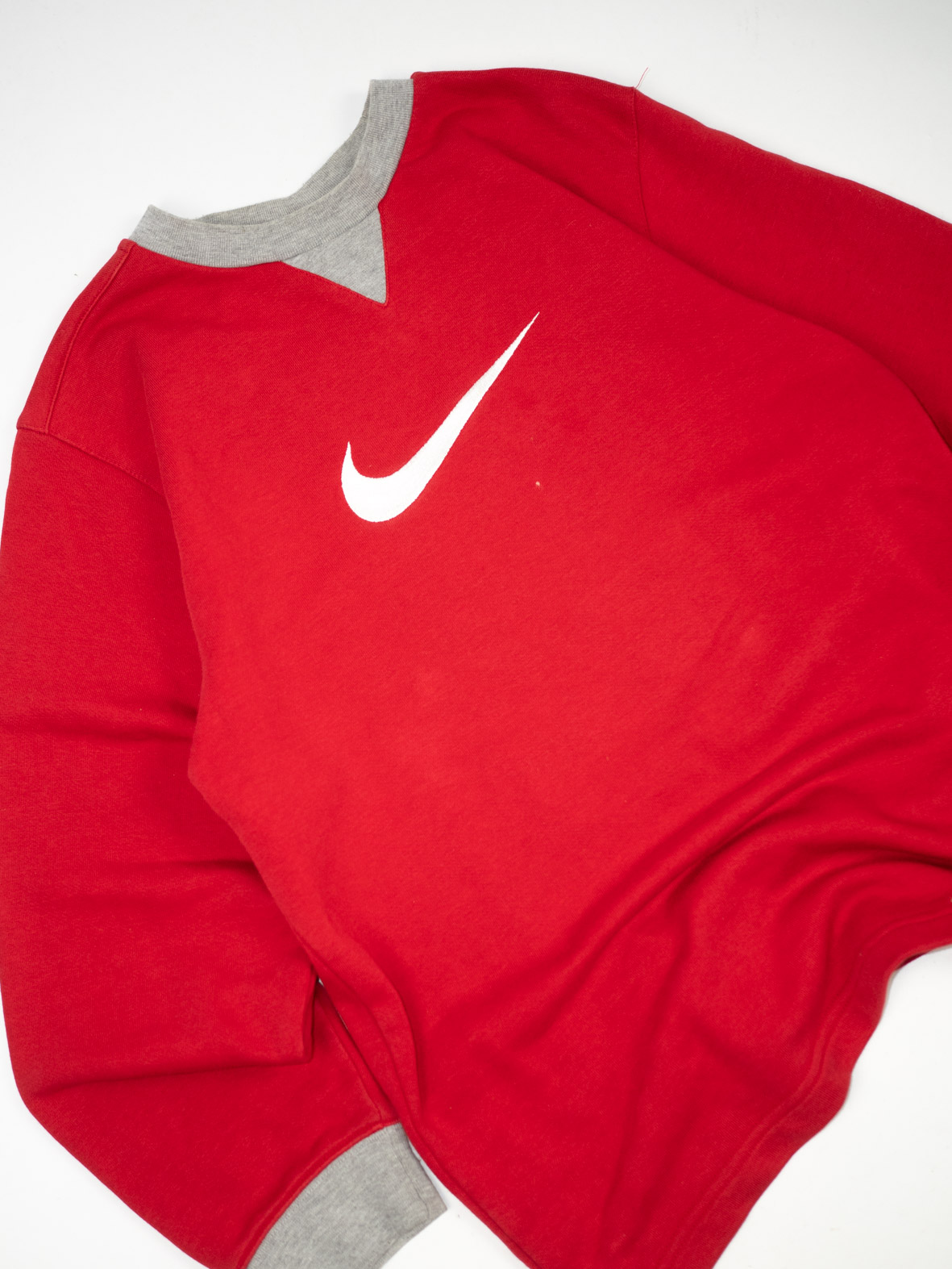 Bright red crew neck with bold white swoosh across the chest. Sporty and iconic.