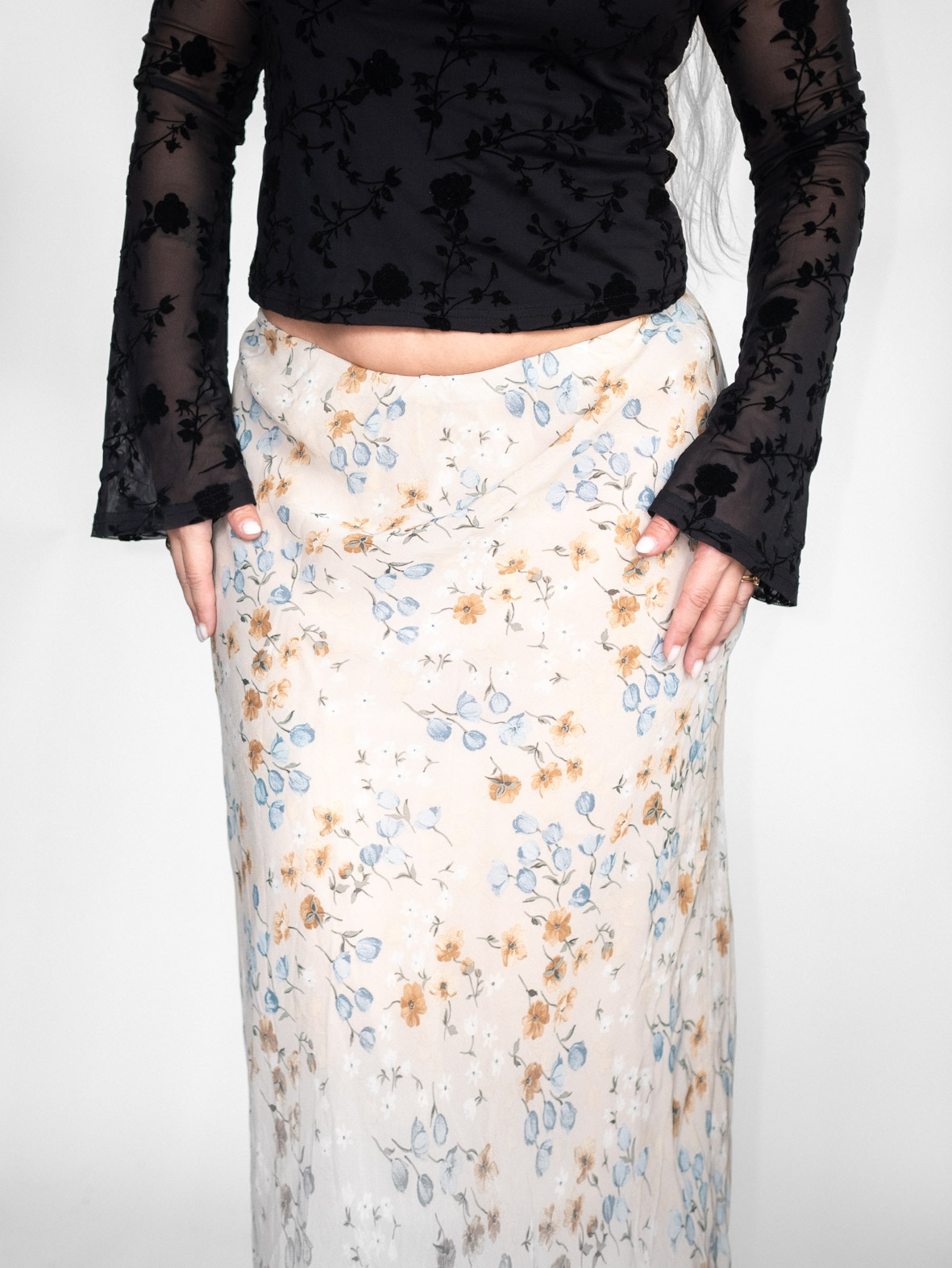 Flowy maxi skirt in a soft mesh fabric featuring a delicate floral print and stretchy waistband for comfort.