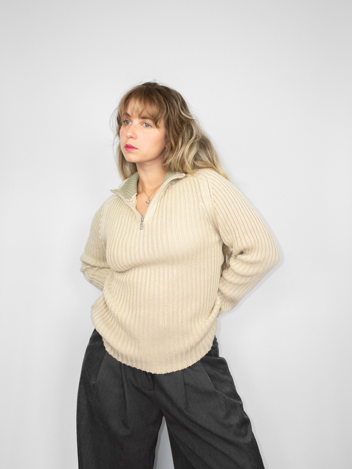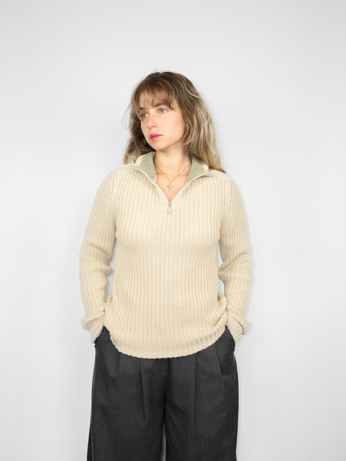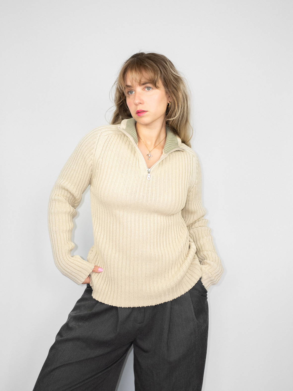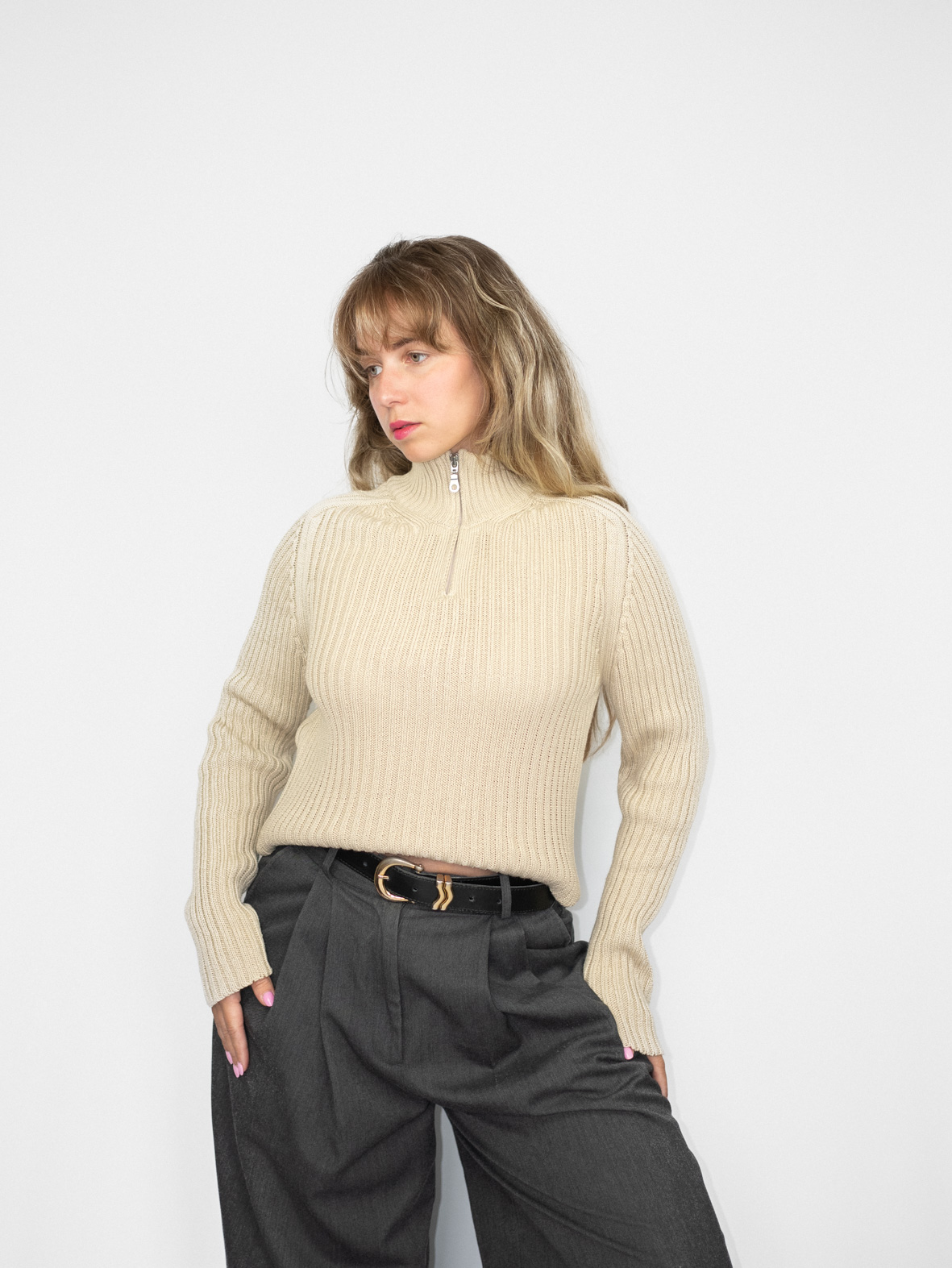 Timeless texture. This ribbed knit henley sweater in soft beige is a versatile layering piece you’ll reach for on repeat. Features half-zip closure and flattering fit. Style with pleated pants or wide jeans. One-of-one. Curated by Evita. Pre-loved. Ships free.