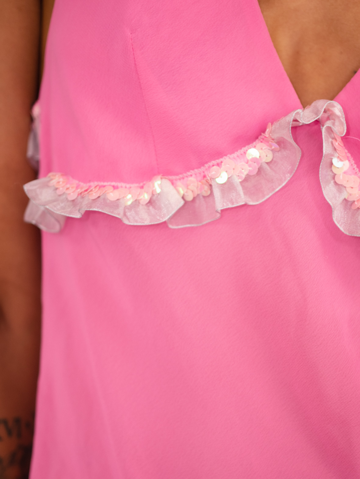 Hot Pink Mini Halter Mini Dress – Sequin Ruffle Vibes – M