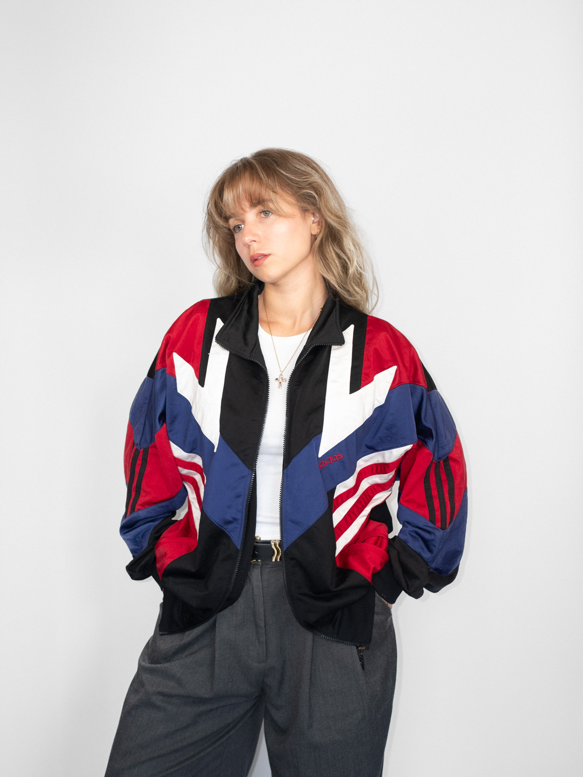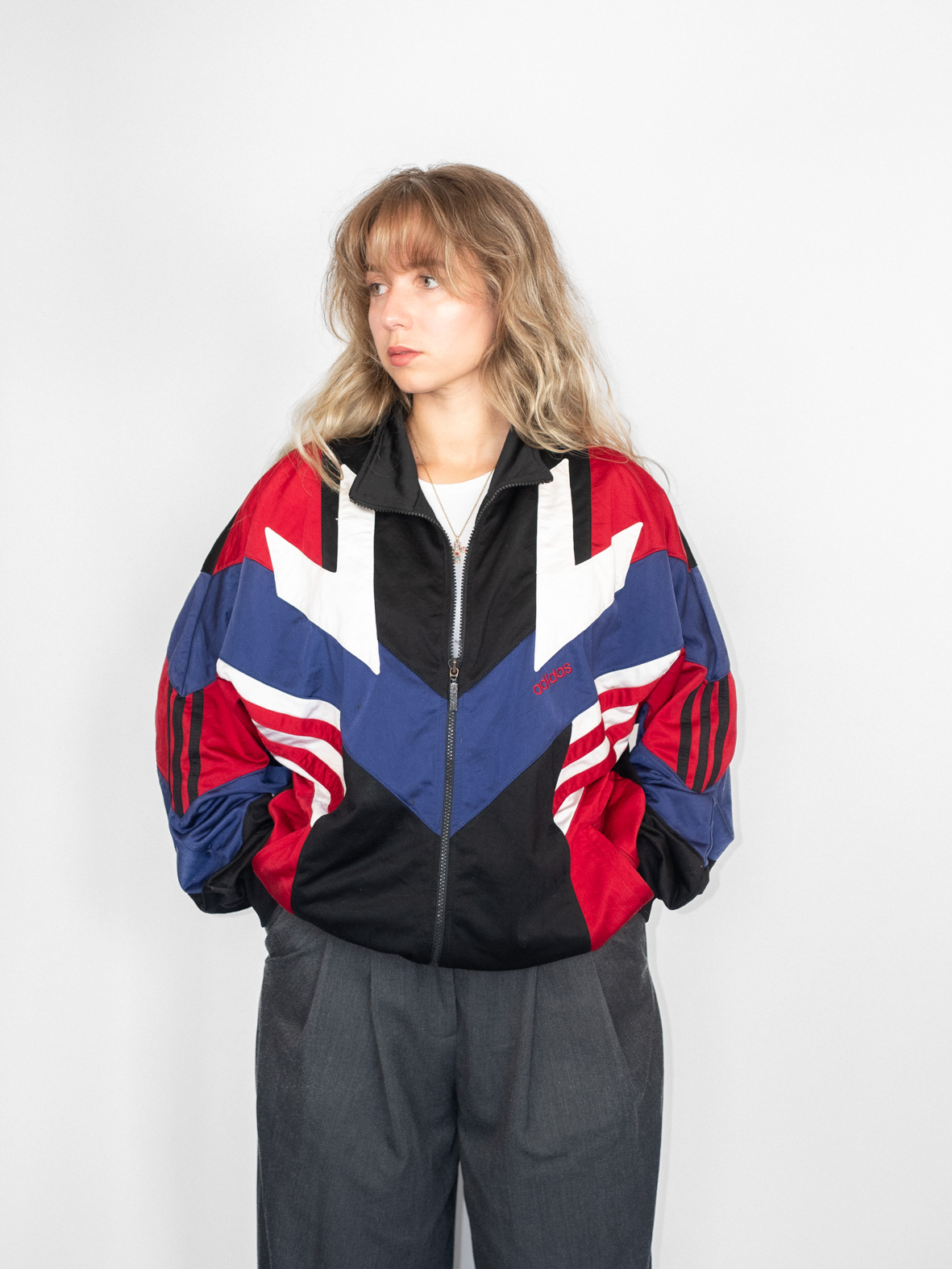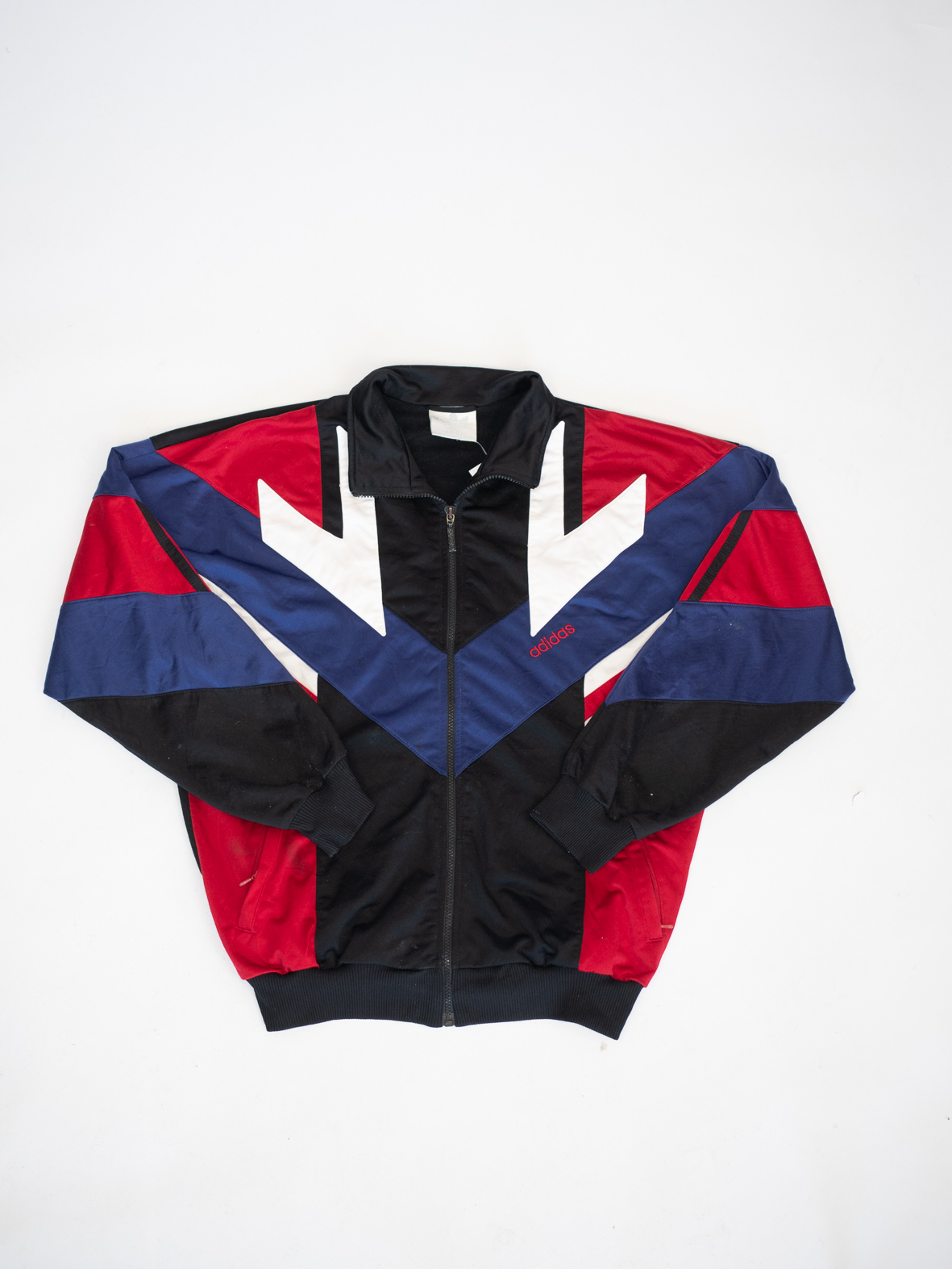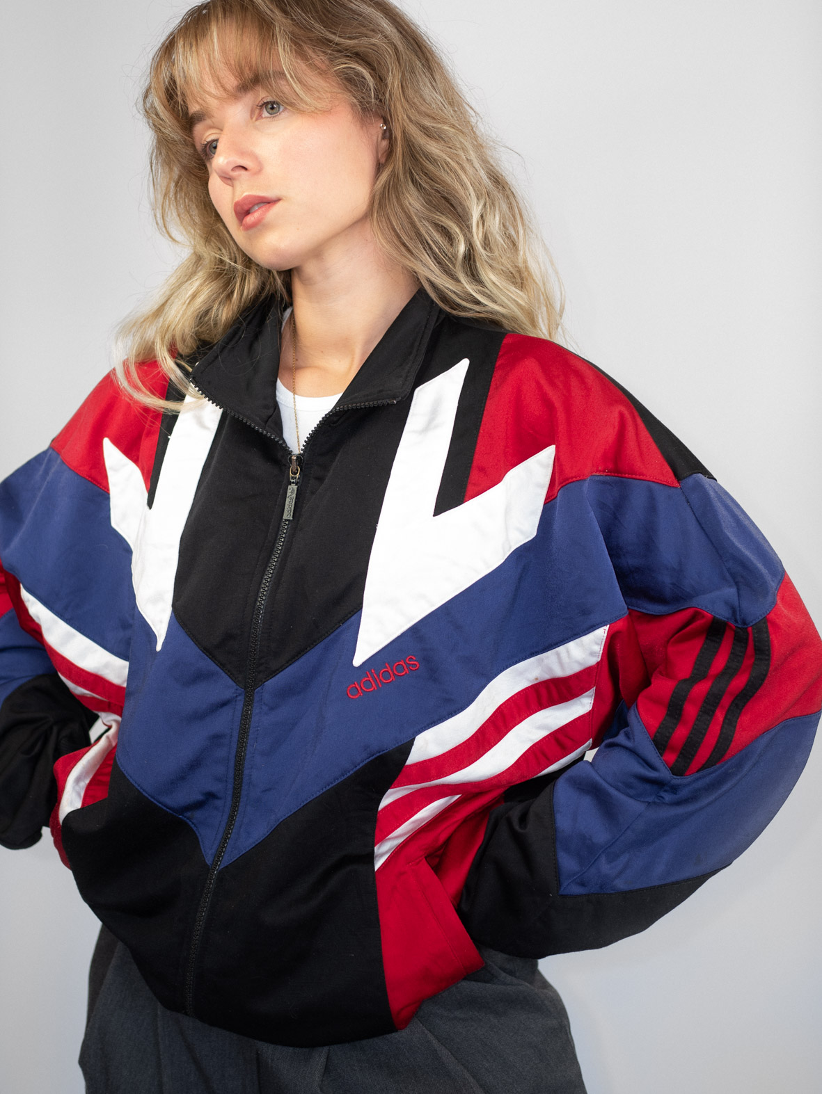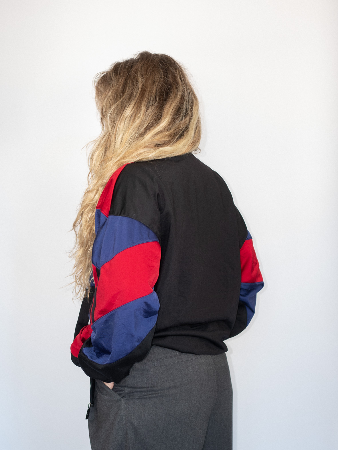 Embody ‘80s energy with this rare colorblock jacket in vivid red, white, blue, and black. Featuring puffed sleeves, chevron panels, and an oversized fit, it’s a statement piece like no other.