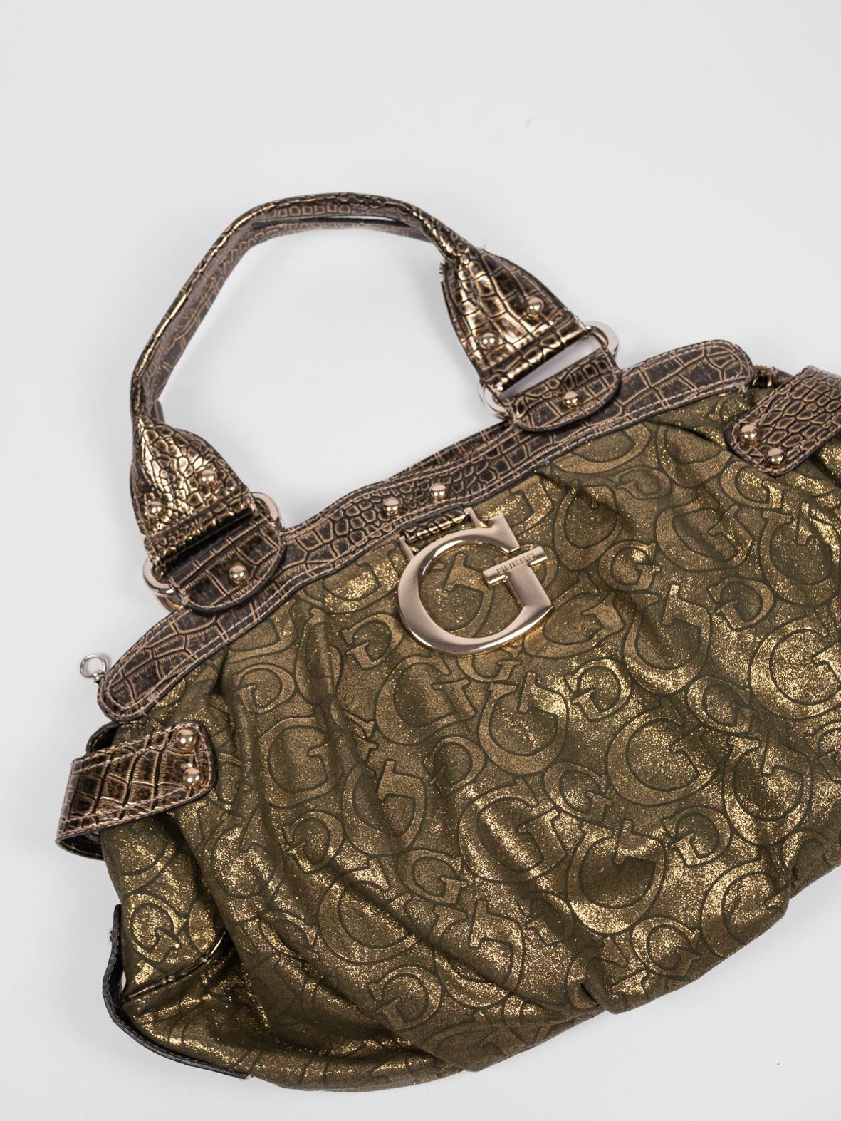 Iconic early 2000s Guess statement bag in a rare olive-gold tone with embossed logo pattern and croc-effect details.