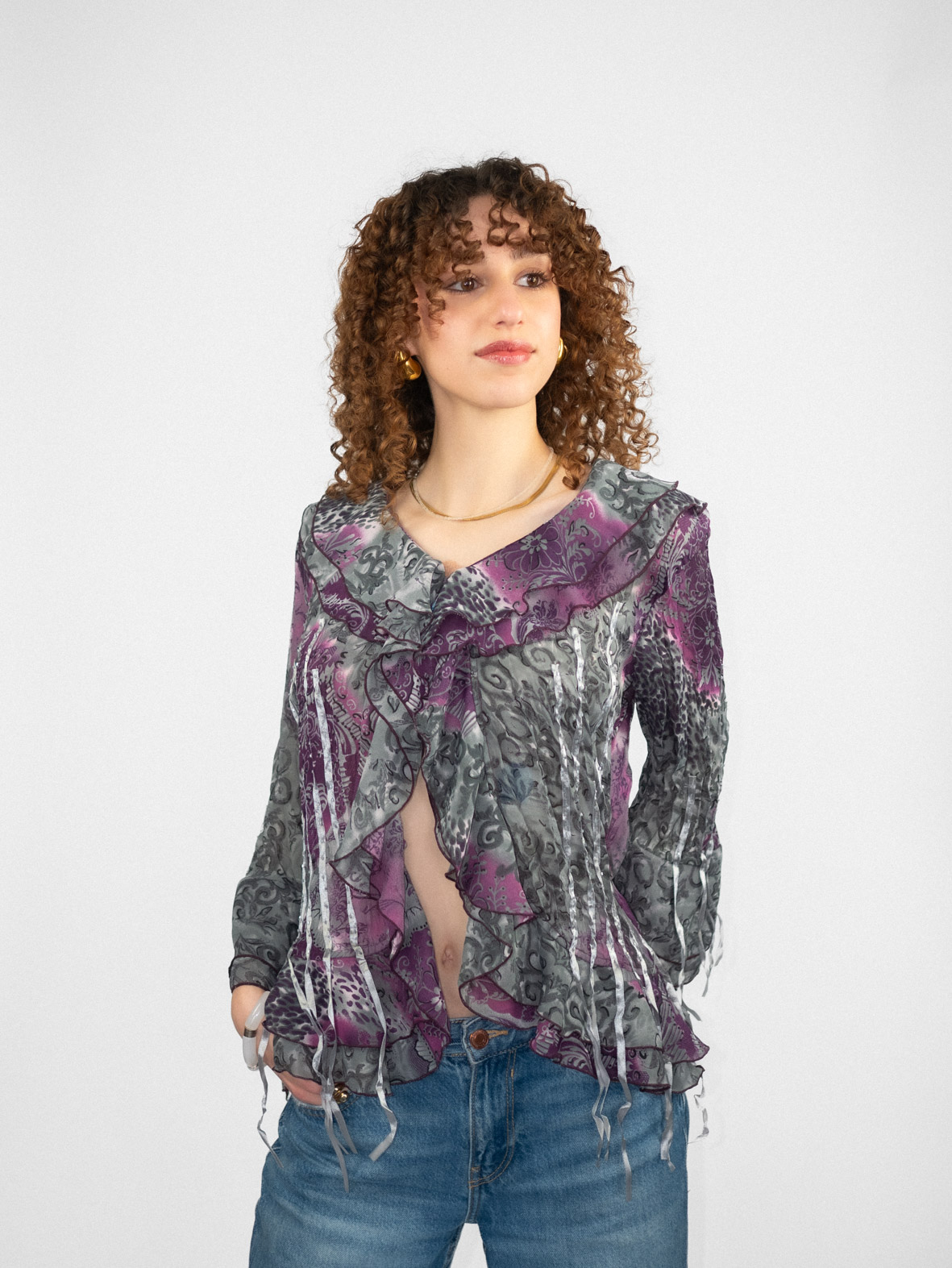Incredible vintage button-up top in deep purple and grey tones with ruffle details and decorative ribbon accents. Semi-sheer fabric, long sleeves and an open front silhouette create a dramatic yet wearable piece with strong early 2000s energy.