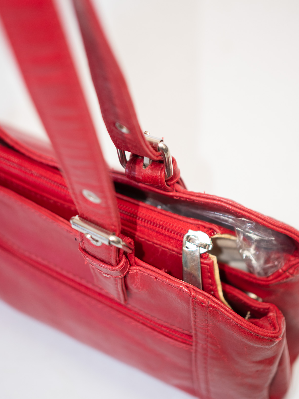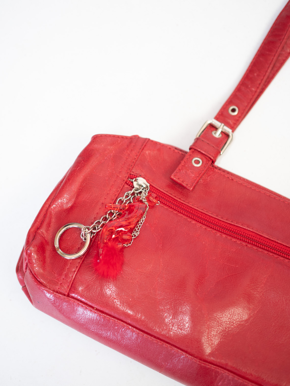 Made in Italy – striking red bag with long straps, silver hardware and playful keychain charm. Comes with three inner bags (note: one shows light stains).