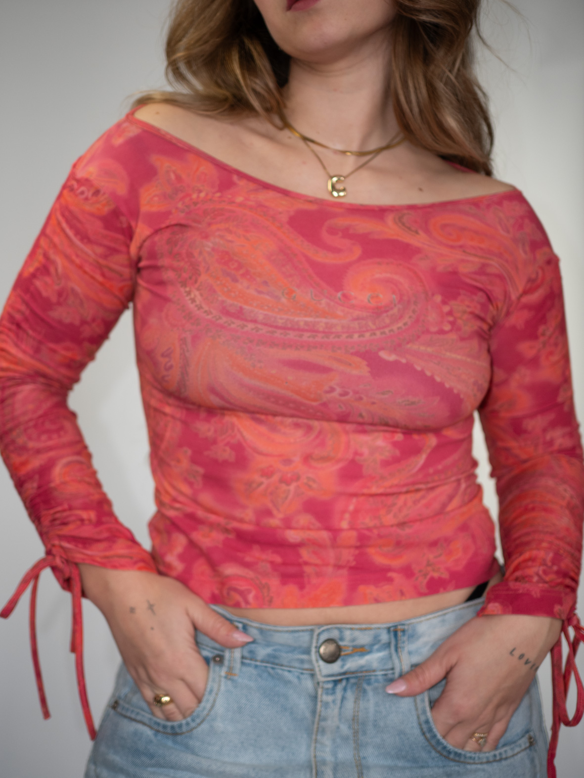 Sheer stretchy mesh top in warm red and orange tones with bold paisley print. Made in Italy with ruched sleeve details and a strong early 2000s aesthetic.