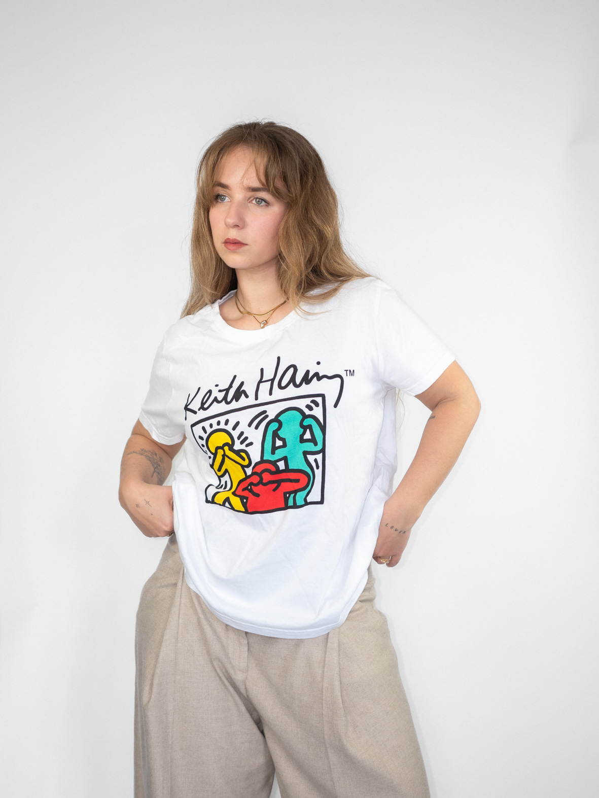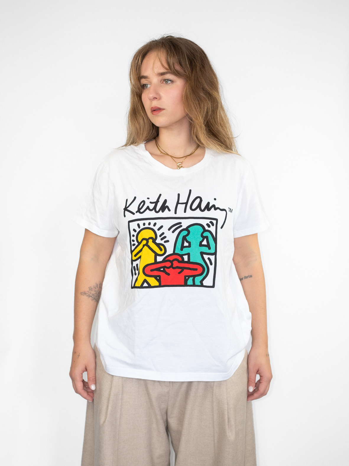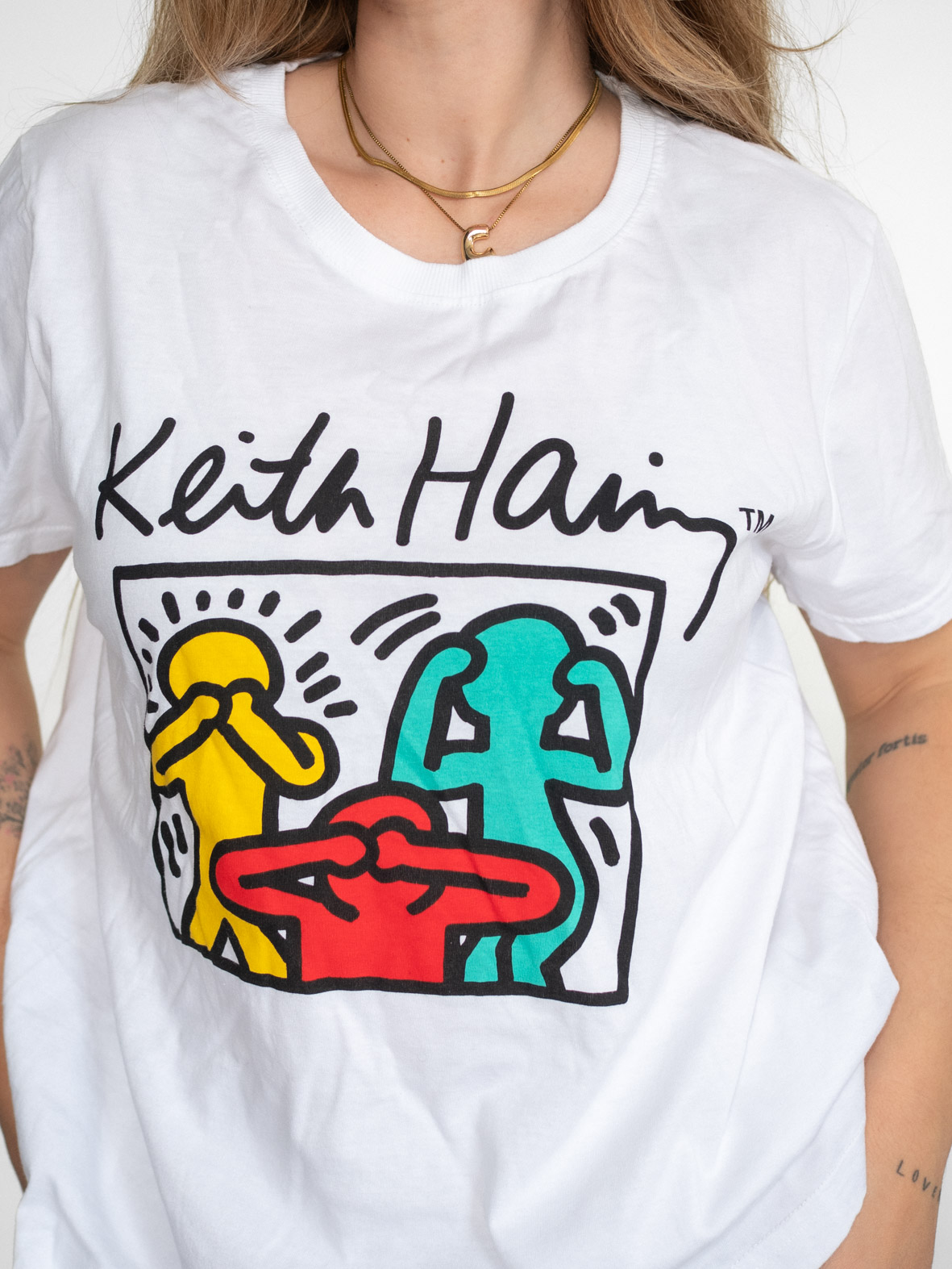 White cotton tee featuring iconic Keith Haring artwork in bold colors. A statement piece that brings personality into any outfit.
