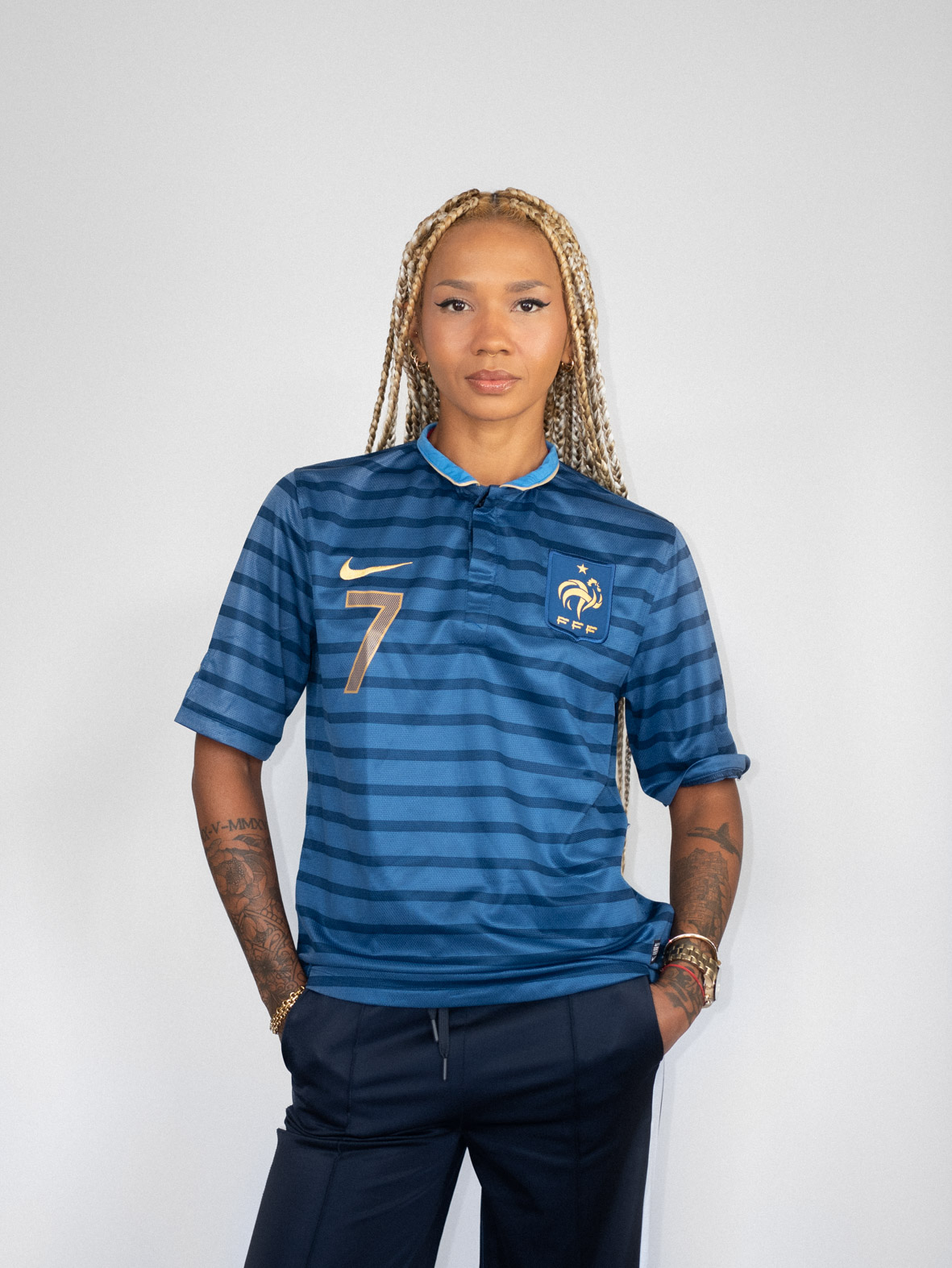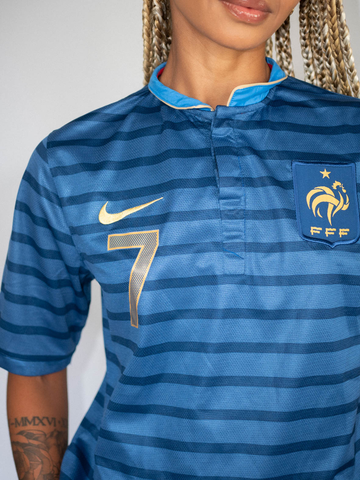 Deep midnight blue stripes, embroidered Nike logo and classic French elegance. Pair with slouchy jeans, loafers and a low-rise belt for the ultimate vintage football edit.