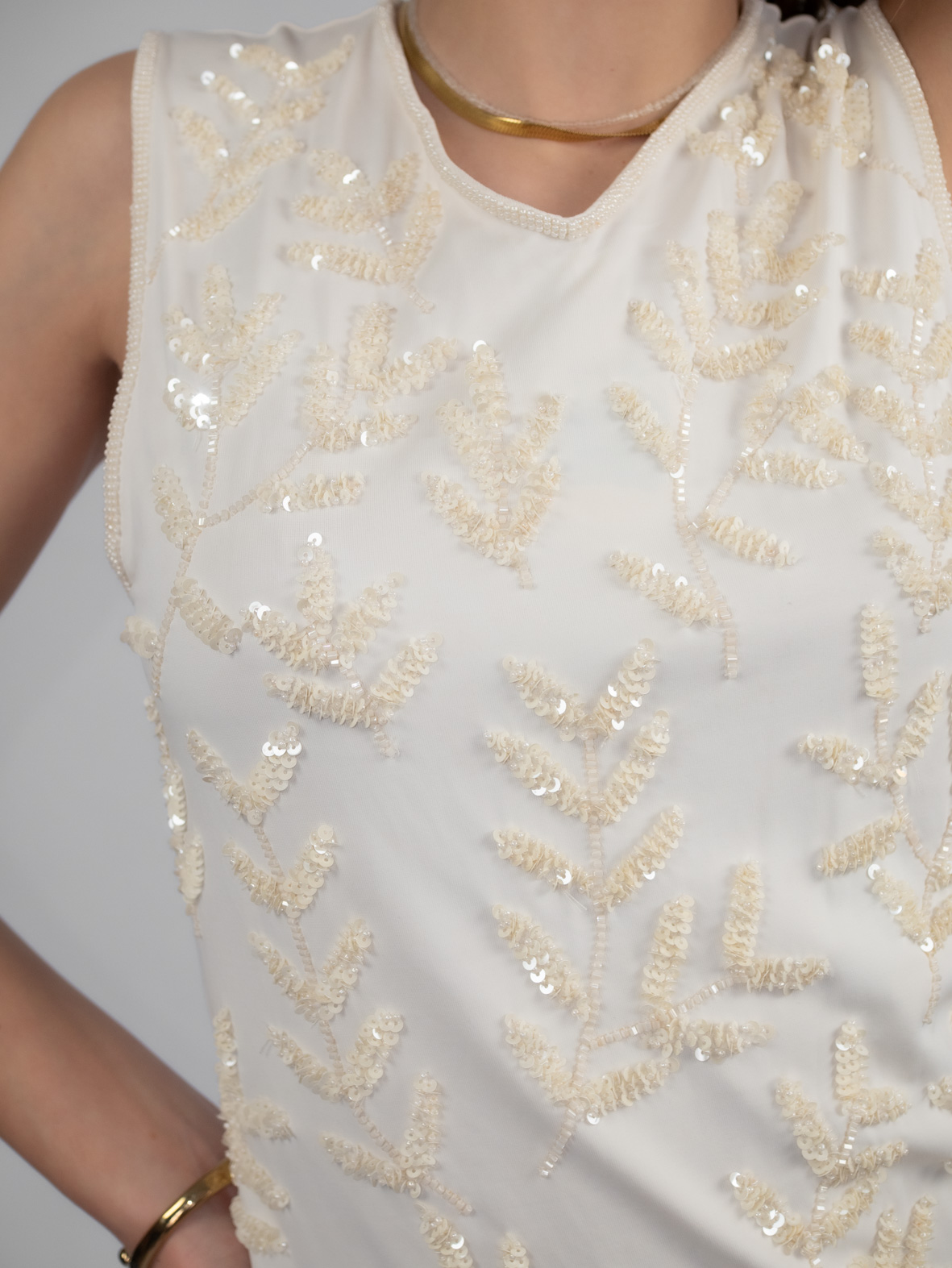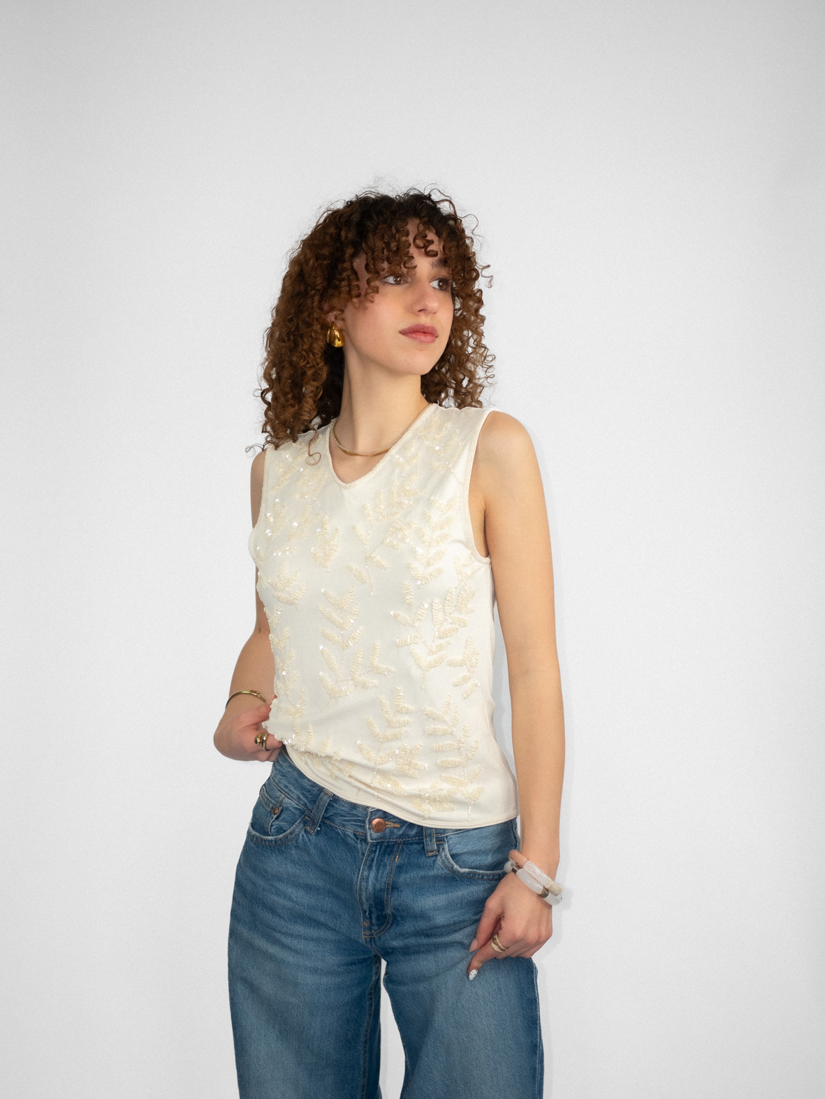 Elegant off-white vintage top with delicate all-over embroidery. Sleeveless cut with a softly fitted shape that sits close to the body without feeling restrictive. The embroidered leaf pattern adds texture and subtle shine, making it a refined statement piece.