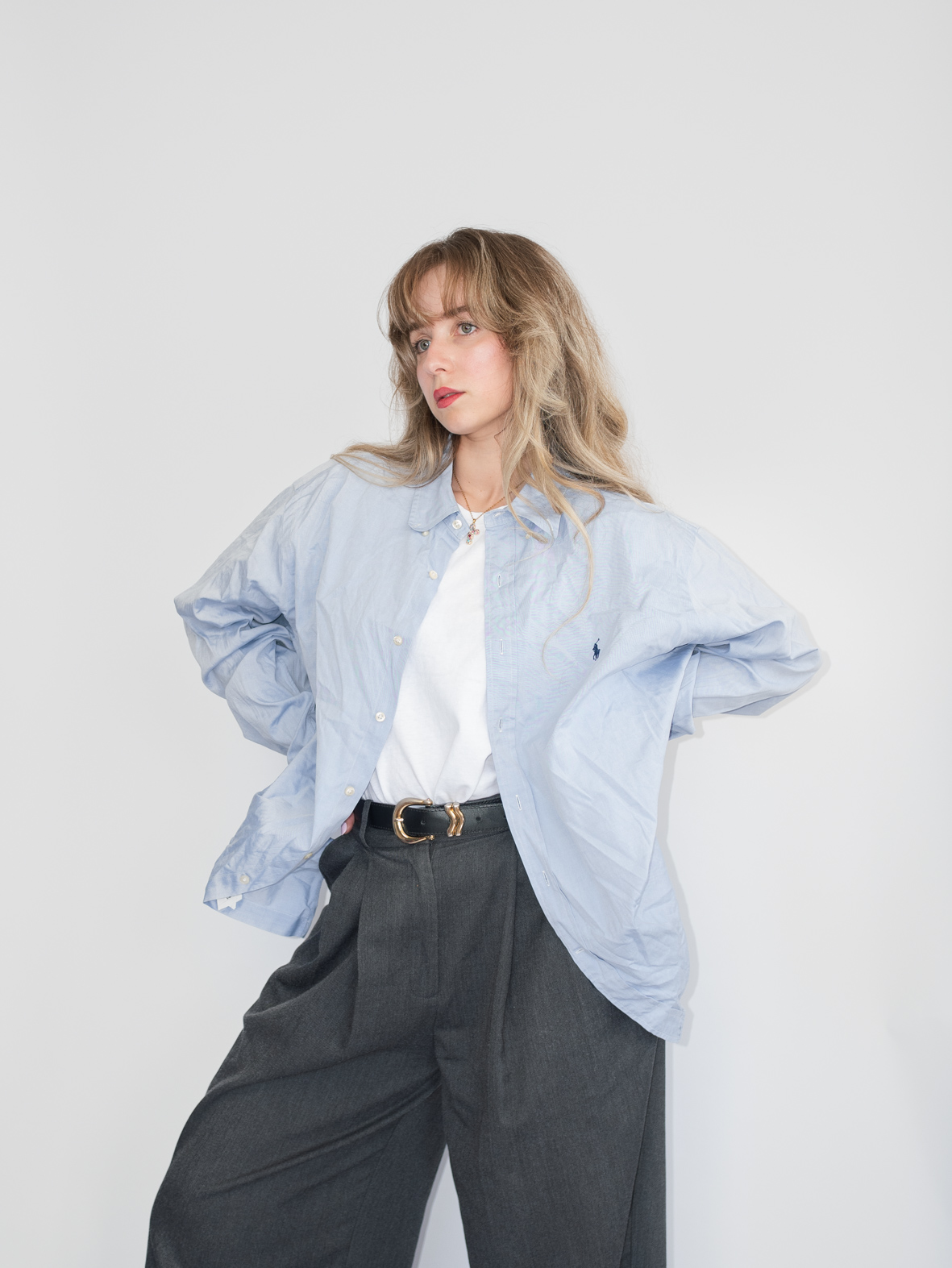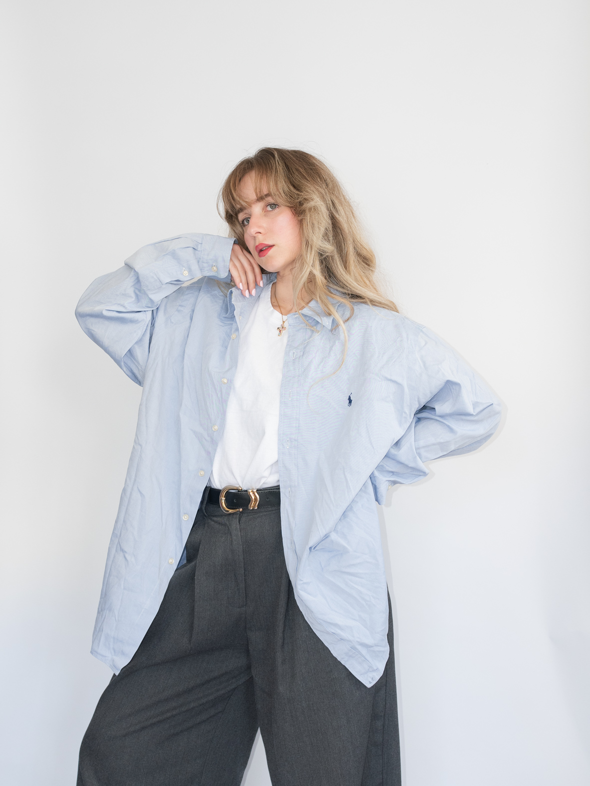 A classic button-down branded Polo Ralph Lauren Shirt in soft light blue, perfectly oversized fora effortless vibe.