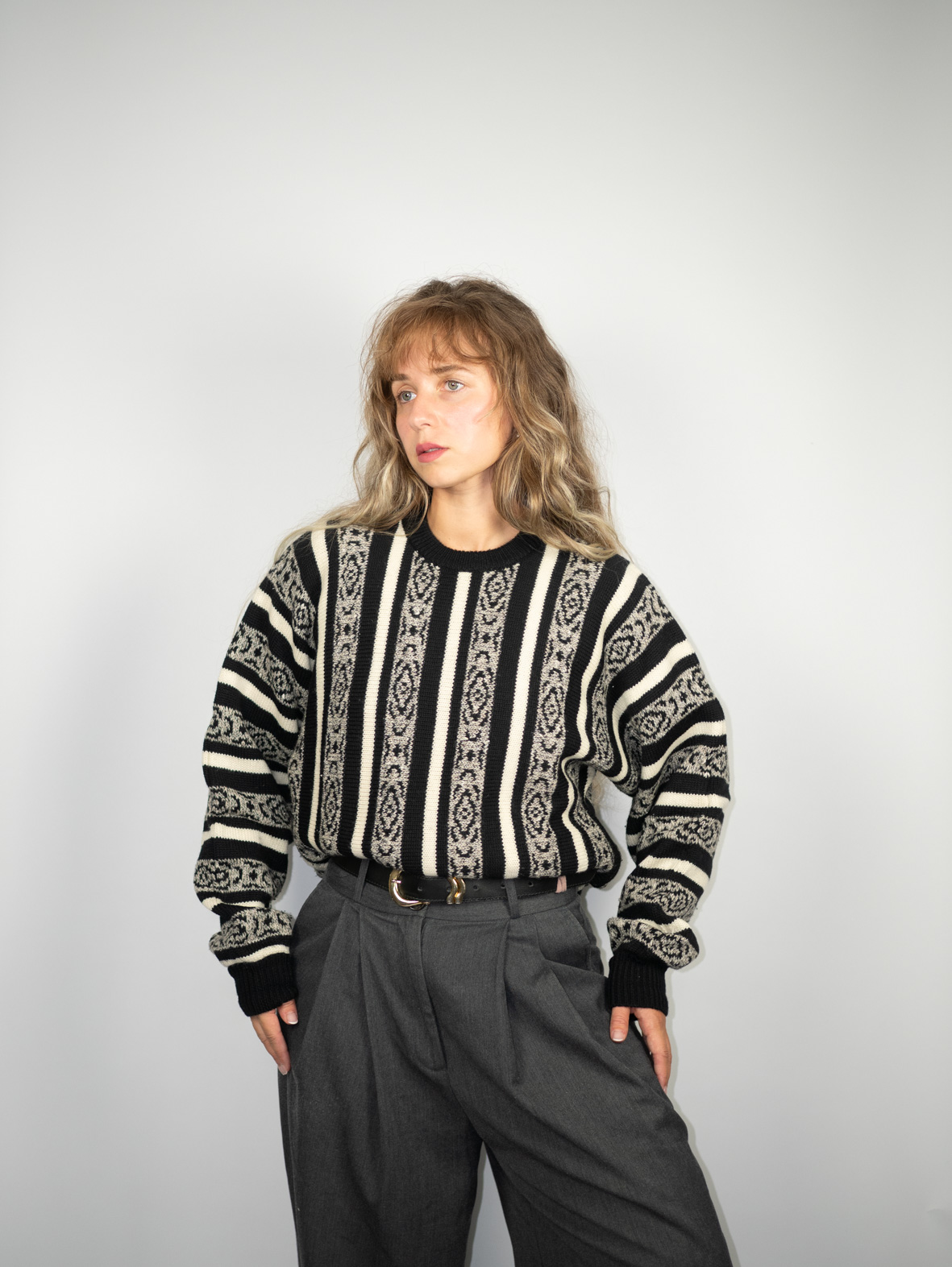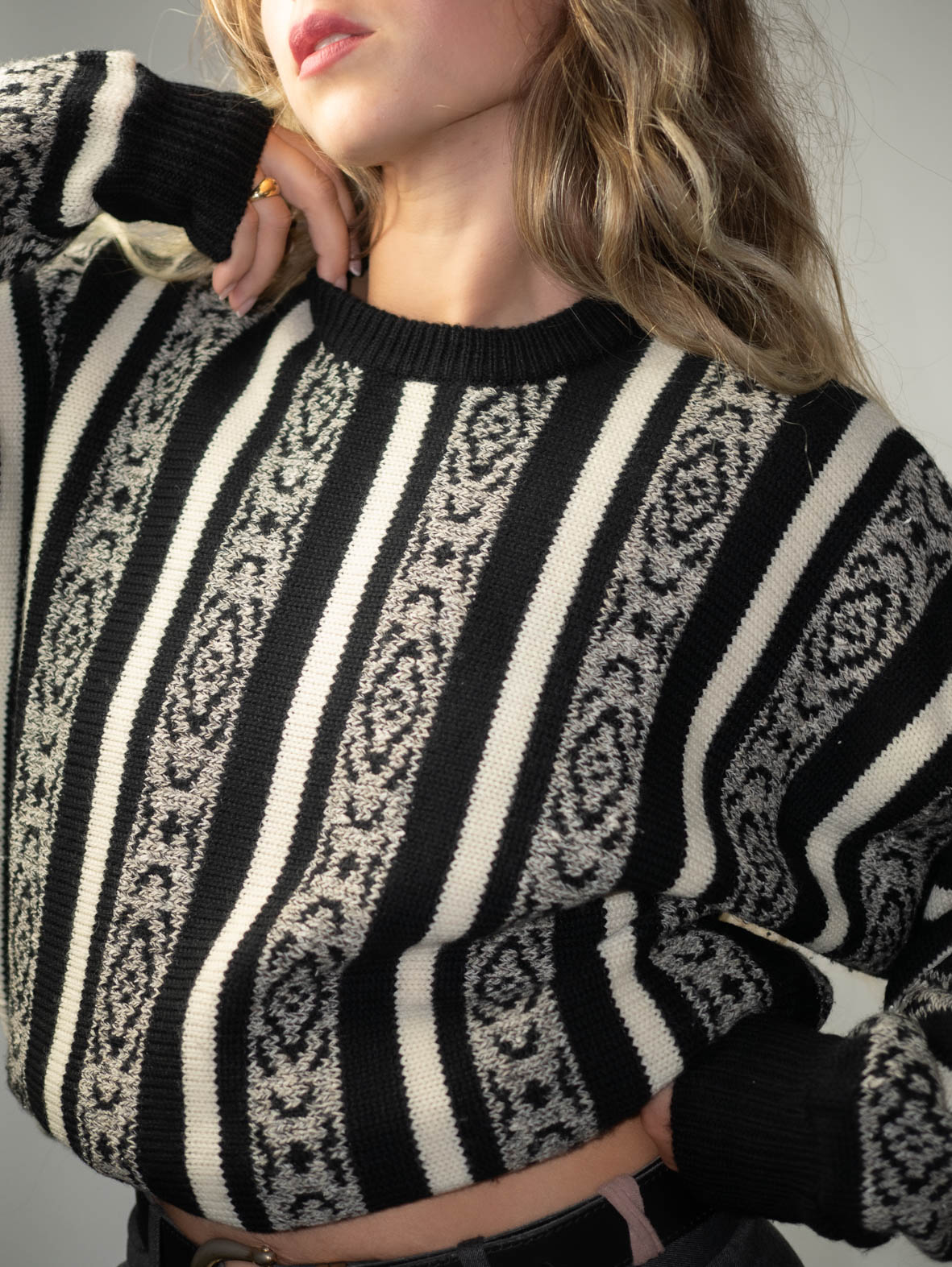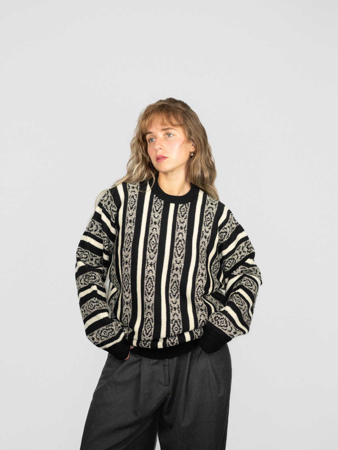 Black-and-cream striped crew neck with bold patterned panels. Oversized fit, thick knit, and striking 80s feel.