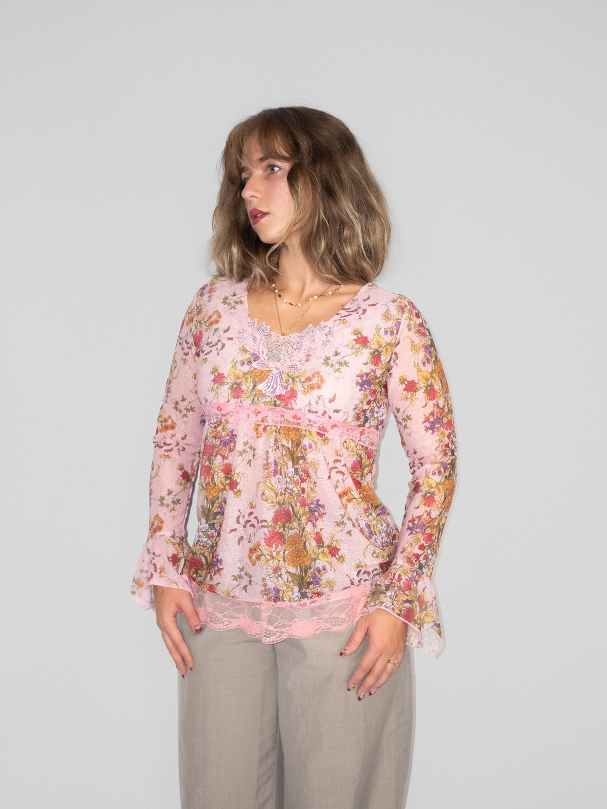A floral fairytale piece with lace trim, soft sequins, and cottage-romantic nostalgia. Lightweight, airy, and full of movement — a wearable piece of poetry.