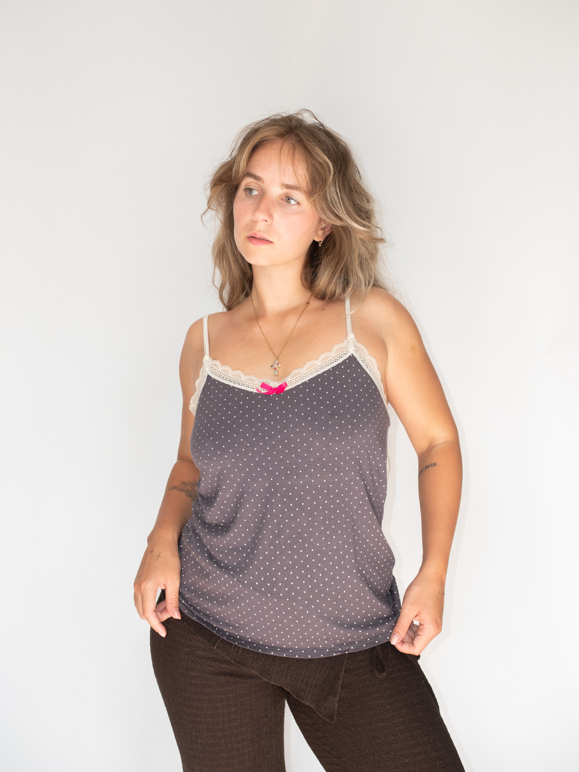 Dark grey base with white mini dots, trimmed in lace and topped with a hot pink bow. Soft, flirty, and super cute.