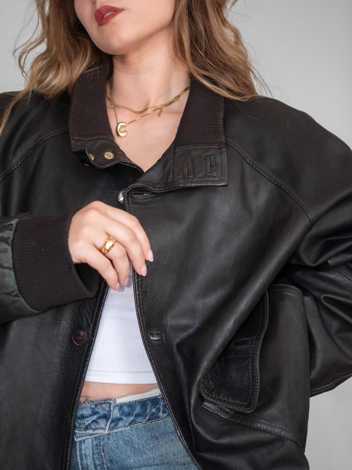 This vintage black leather jacket features a softly oversized silhouette with dropped shoulders and a clean, minimal finish. The leather is smooth and lightweight enough for spring, making it the ideal throw-on piece for everyday wear.