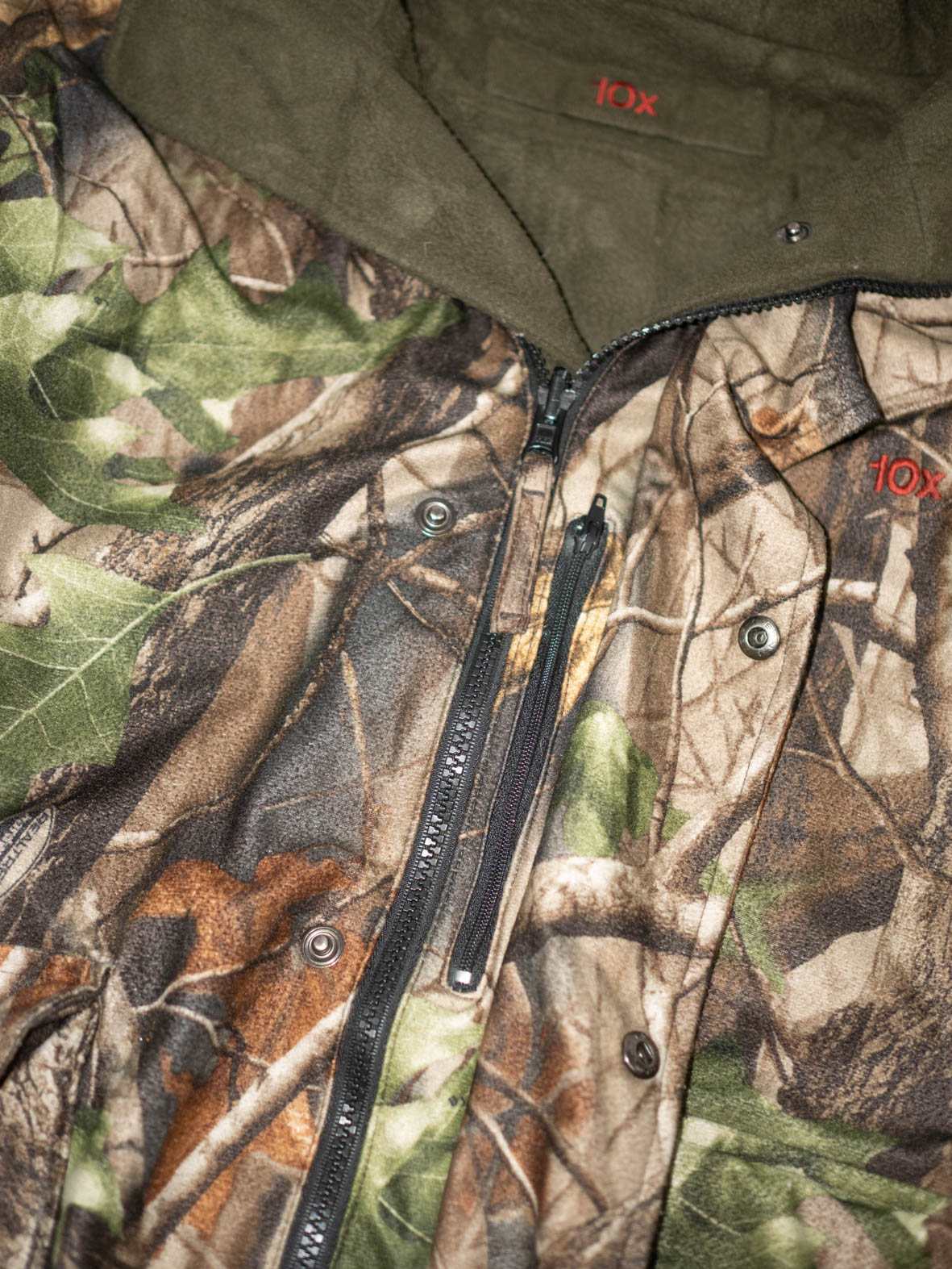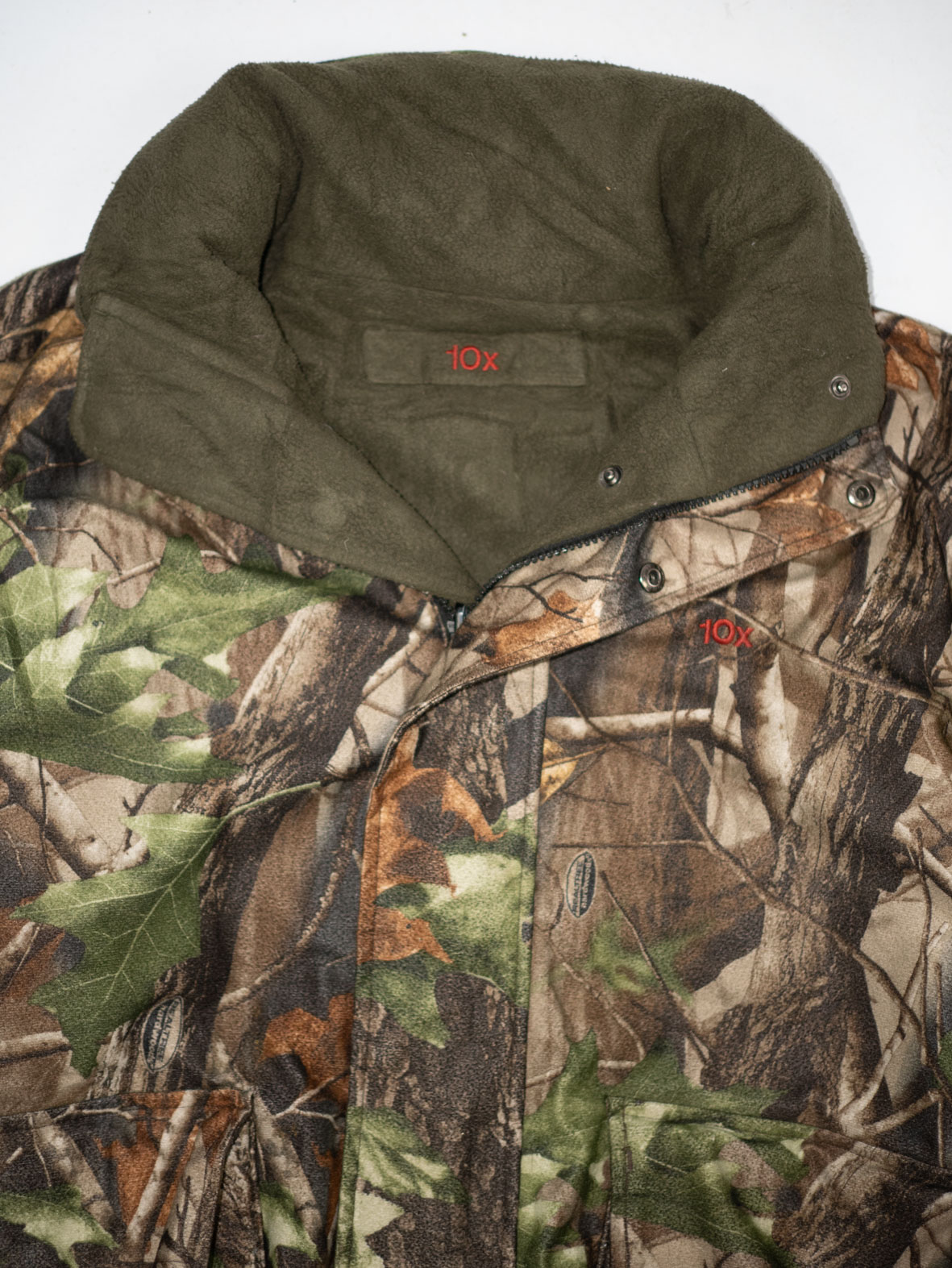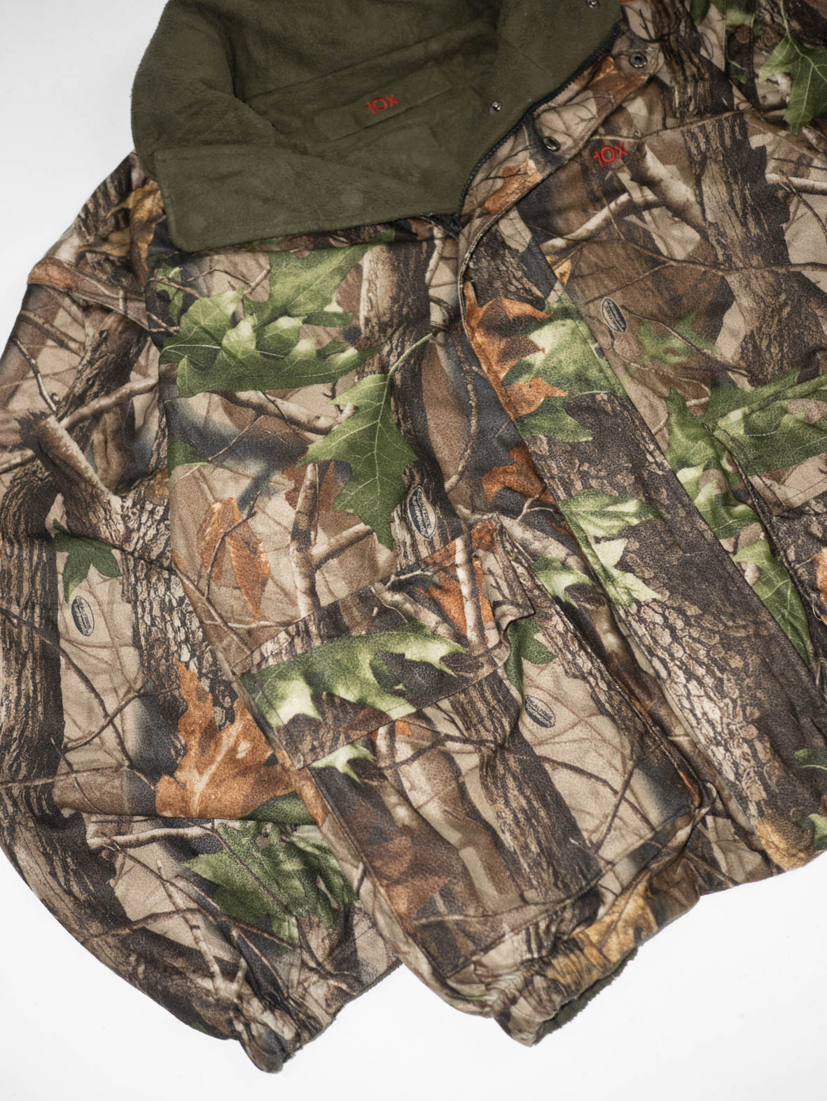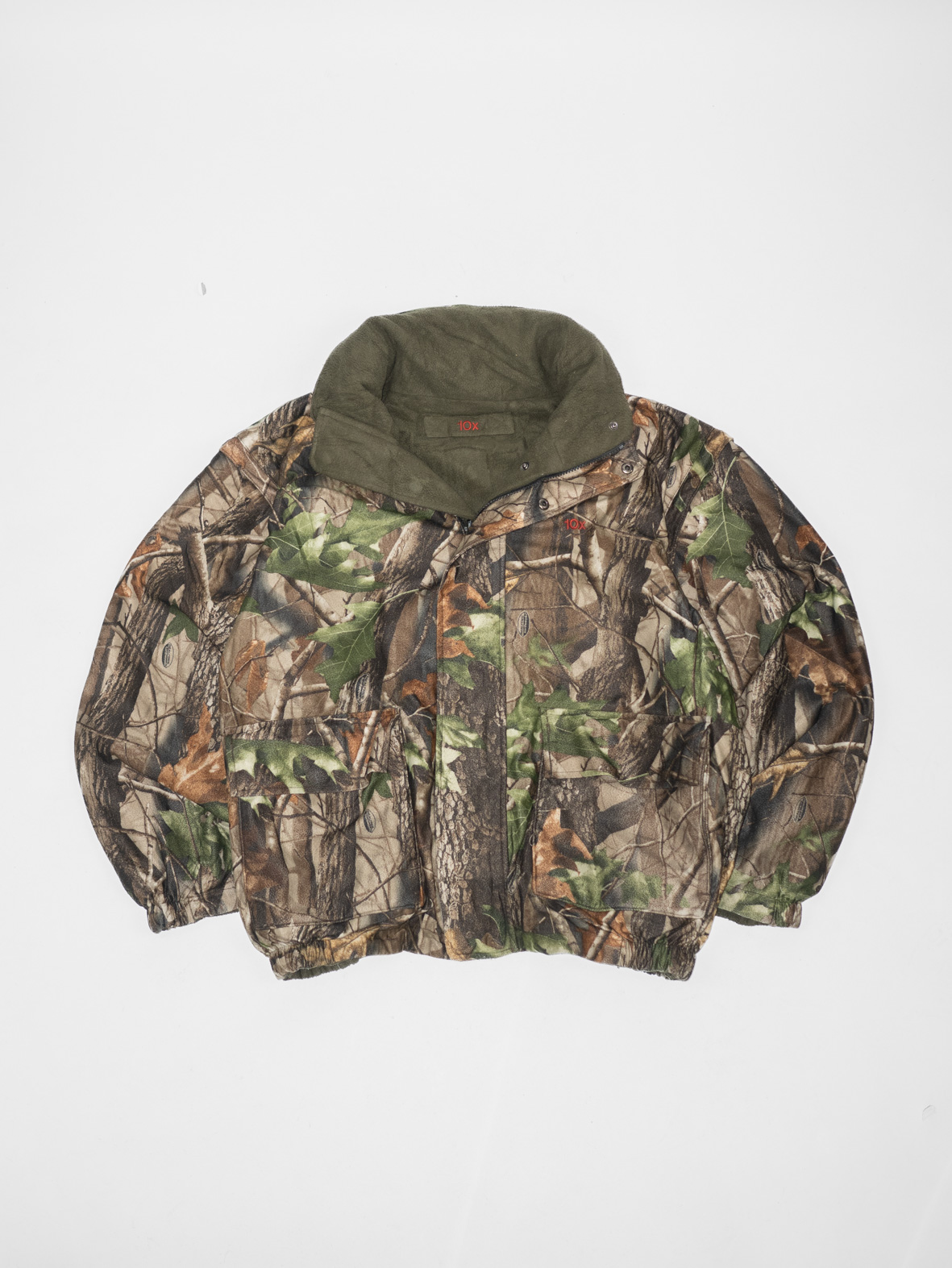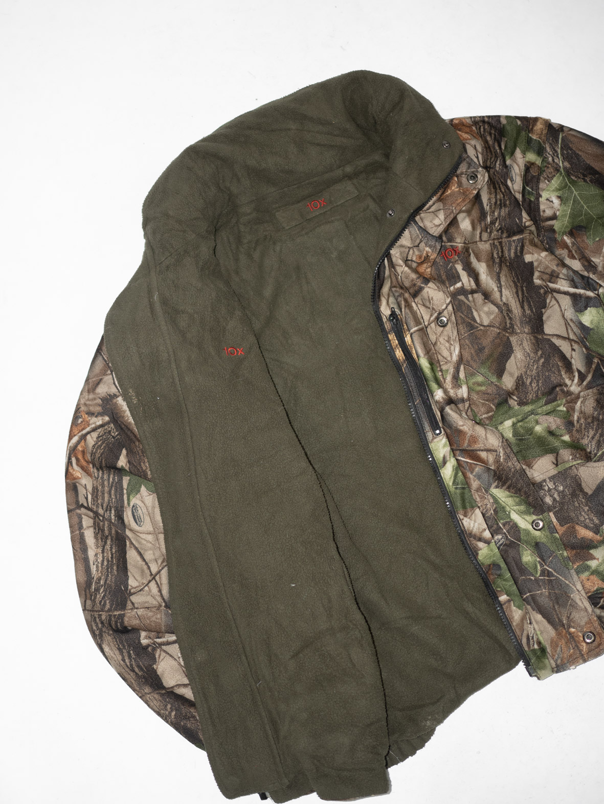 This original 90s 10X hunting jacket is fully reversible: one side in classic woodland camo, the other in soft olive fleece – extra cozy and seriously warm. 10X is a heritage US hunting brand known for durable outdoor gear, so this piece was made to last.
