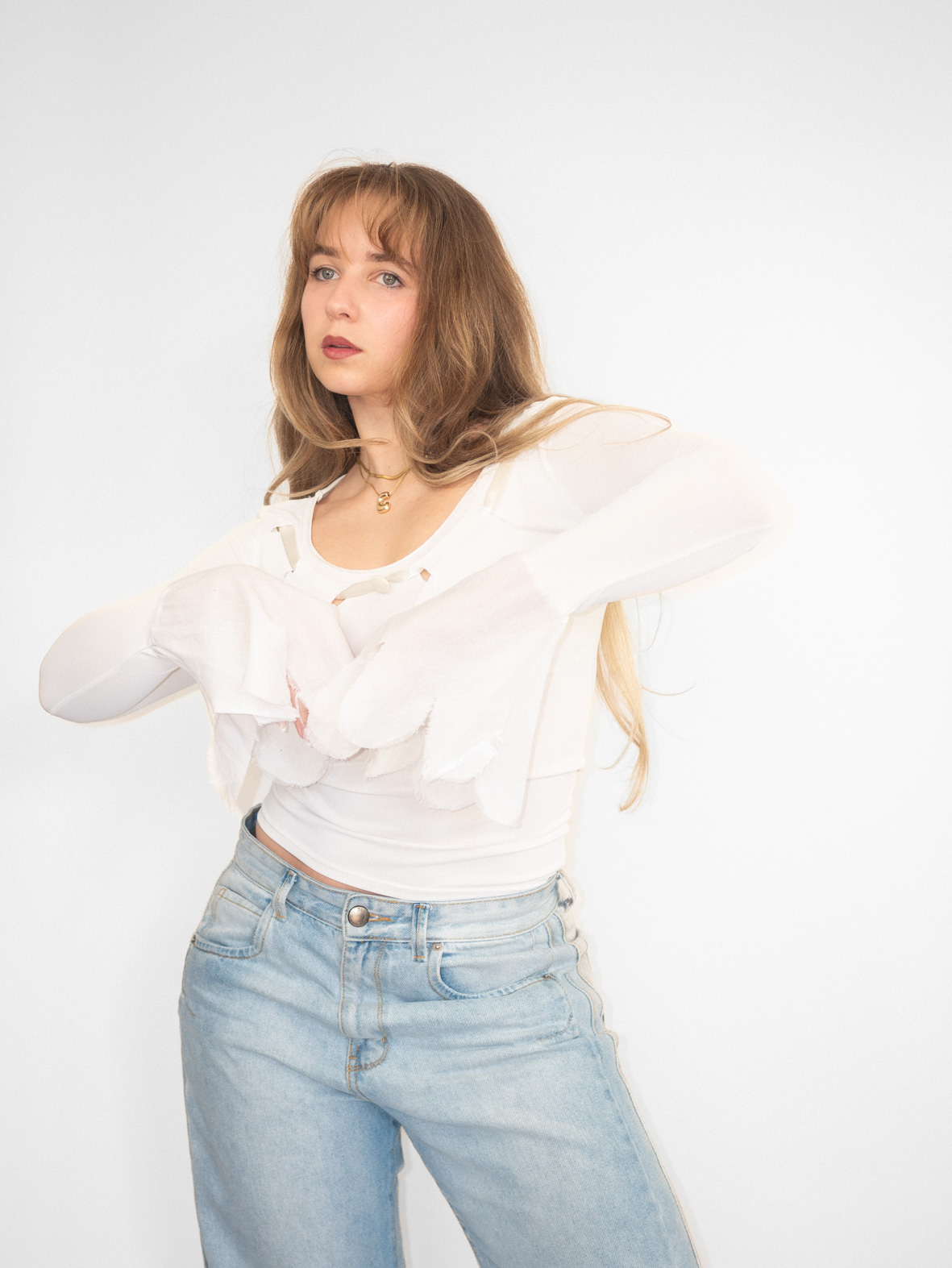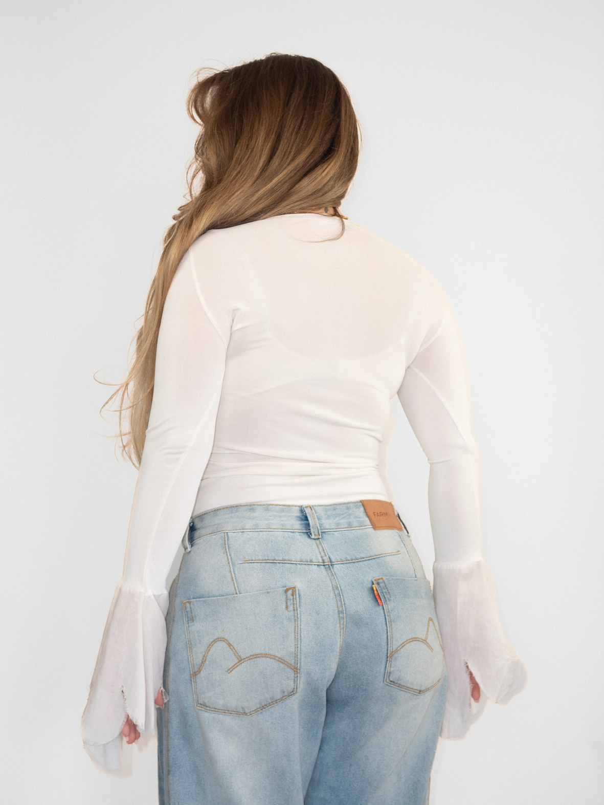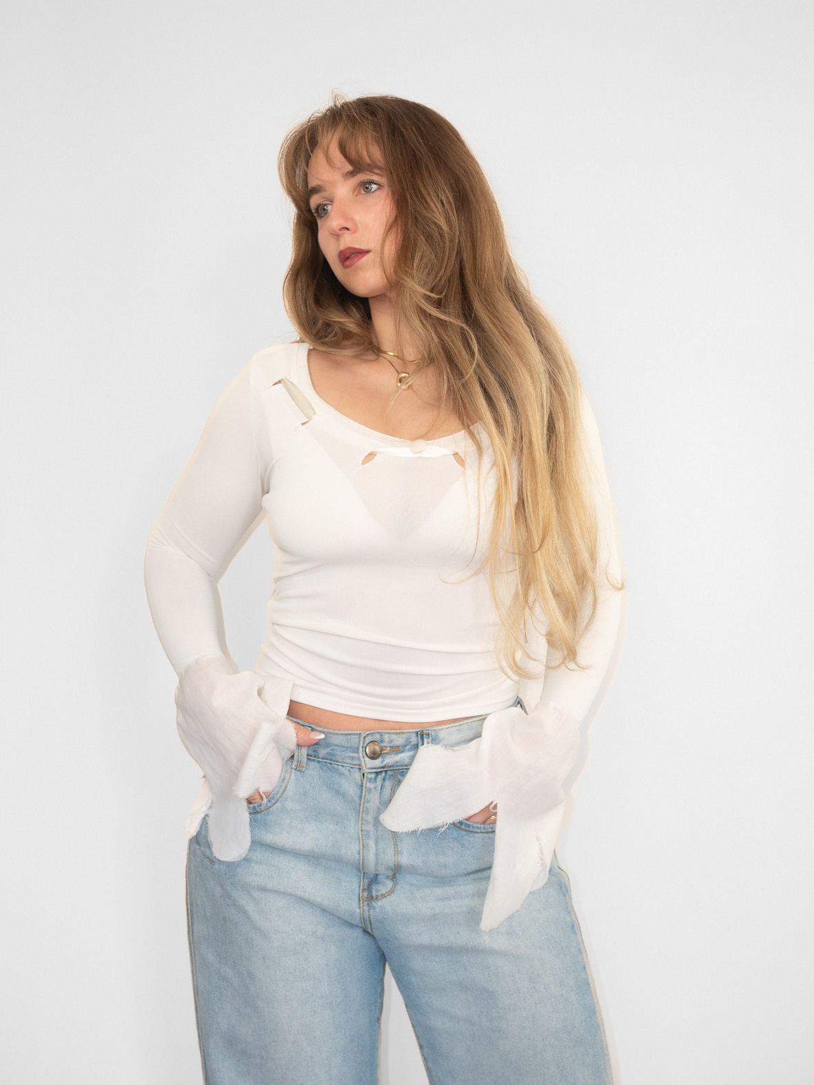 Lightweight off-white long sleeve with distressed cut details around the neckline and soft flared sleeves. Slightly sheer fabric creates a layered, edgy early 2000s vibe.