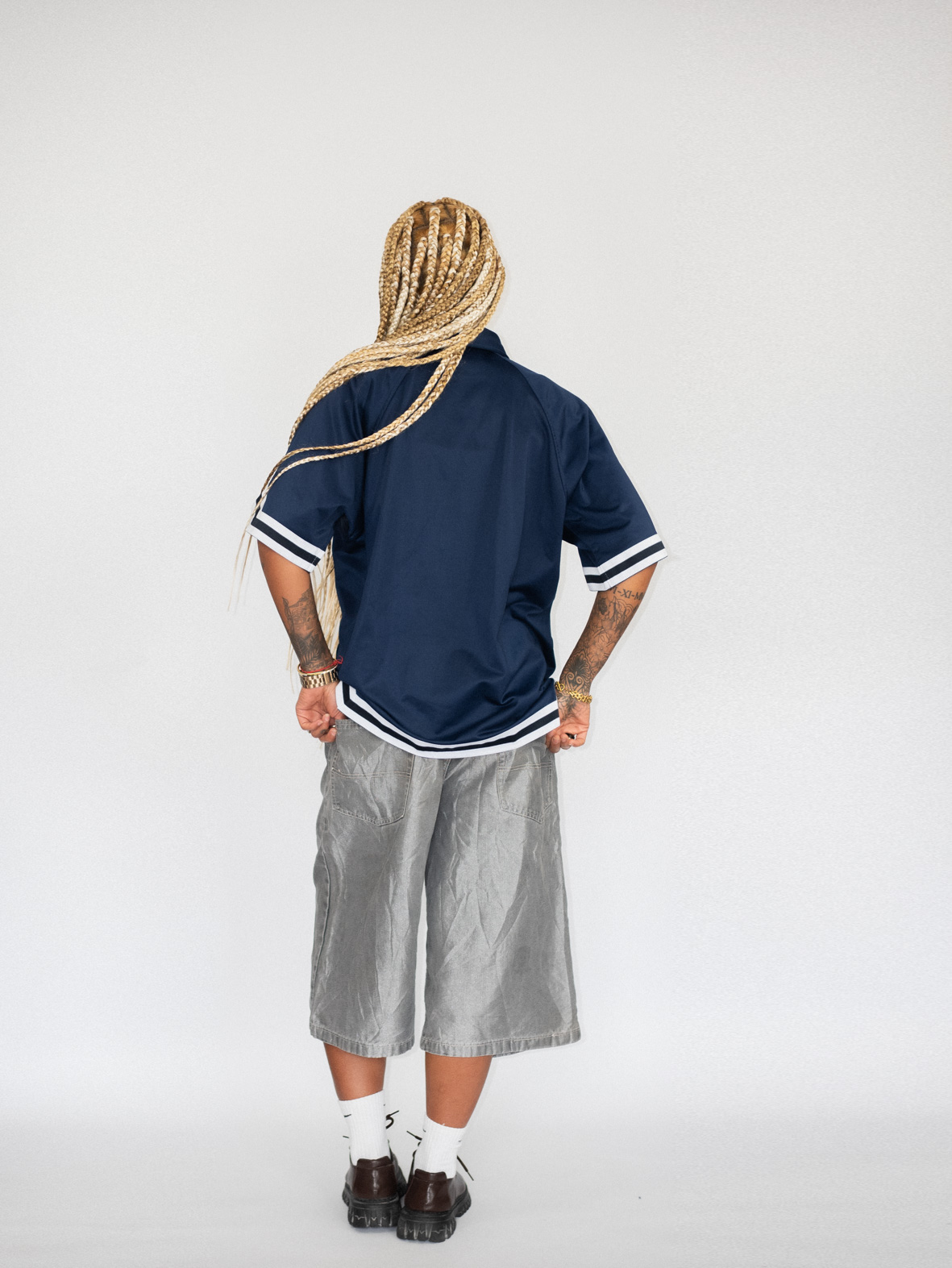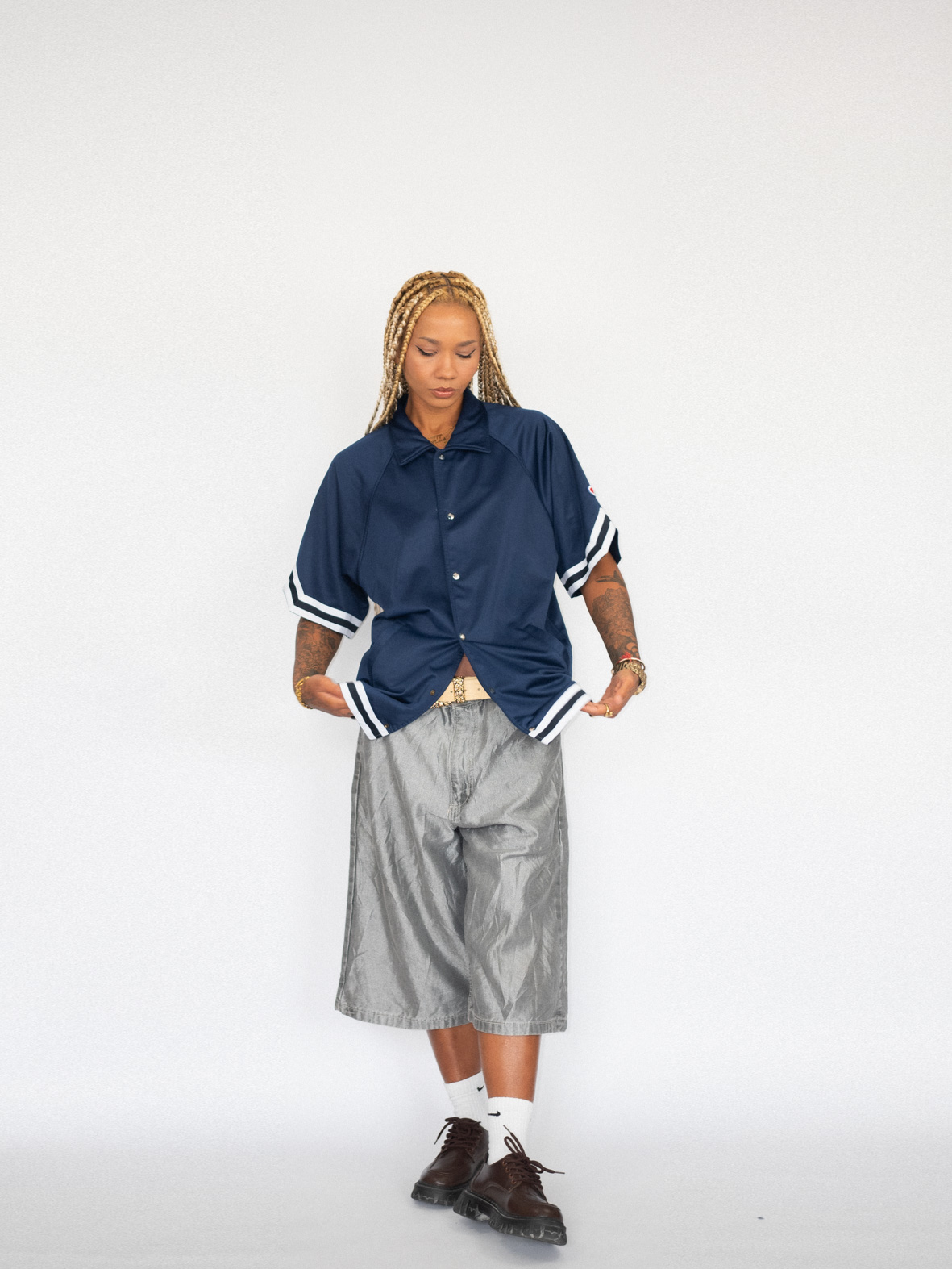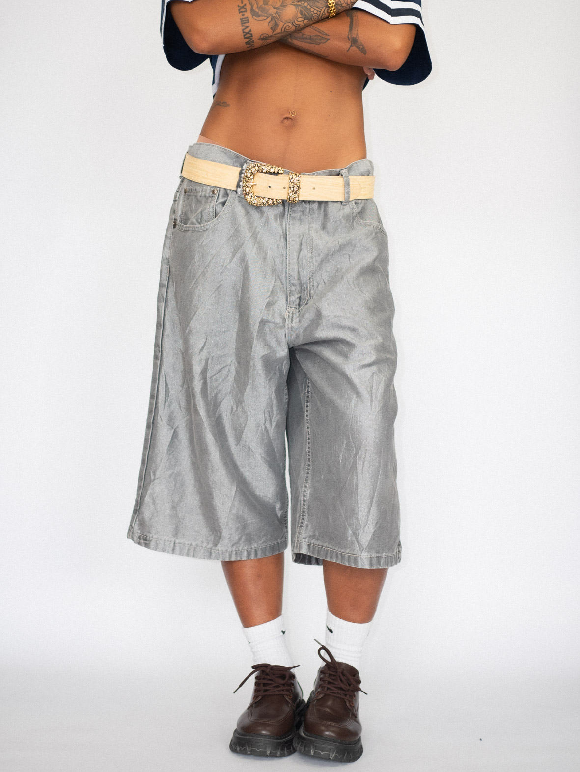 Metallic shimmer meets oversized 90s skate cut. These jorts elevate any streetwear look. Style with cropped tanks, baby tees or varsity pullovers.