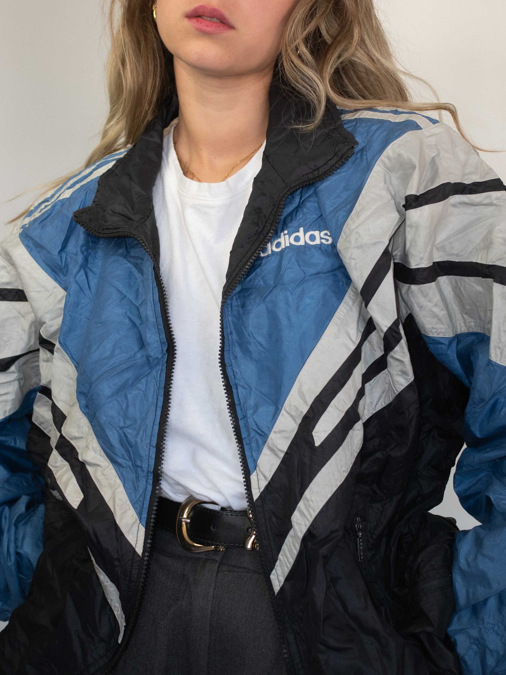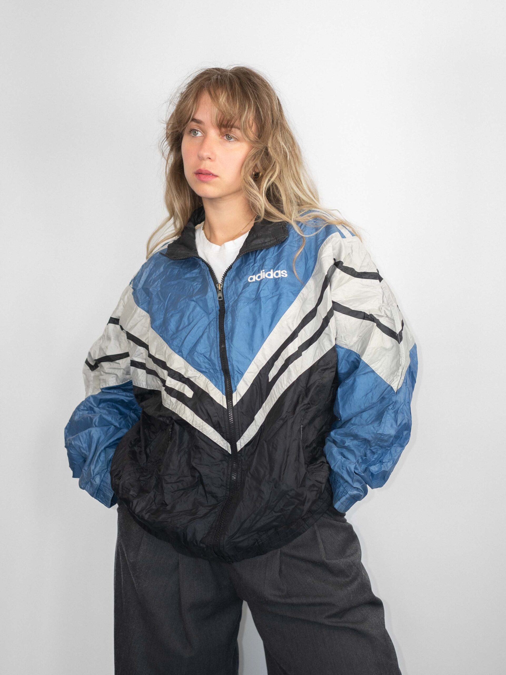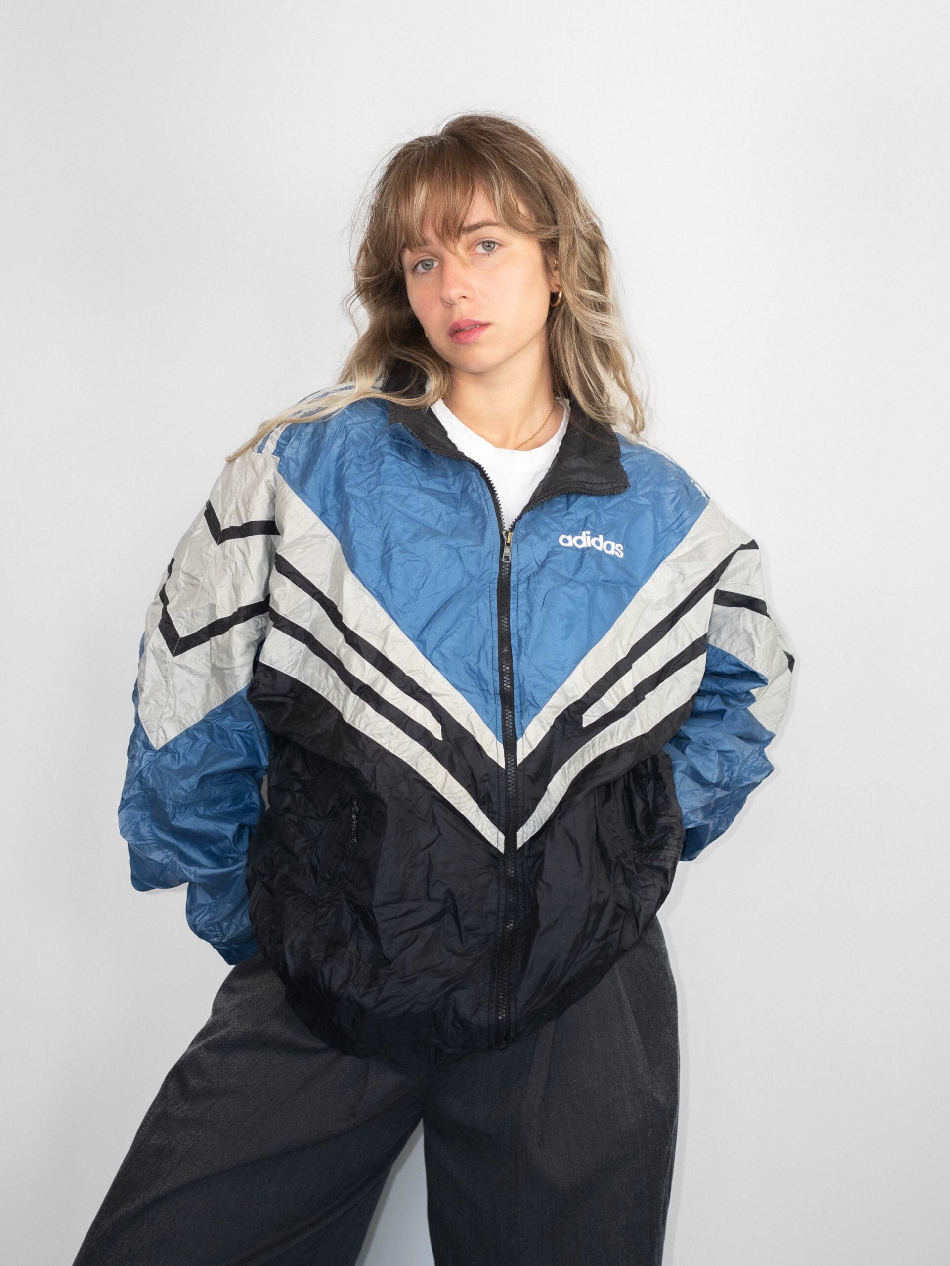 1990s Formula One but make it streetwear. Cool-toned grey, black and steel blue chevrons give this Adidas windbreaker a bold edge. Perfect layered over a hoodie or worn solo with cargos. True vintage, handpicked by Evita. Pre-loved. Ships free.