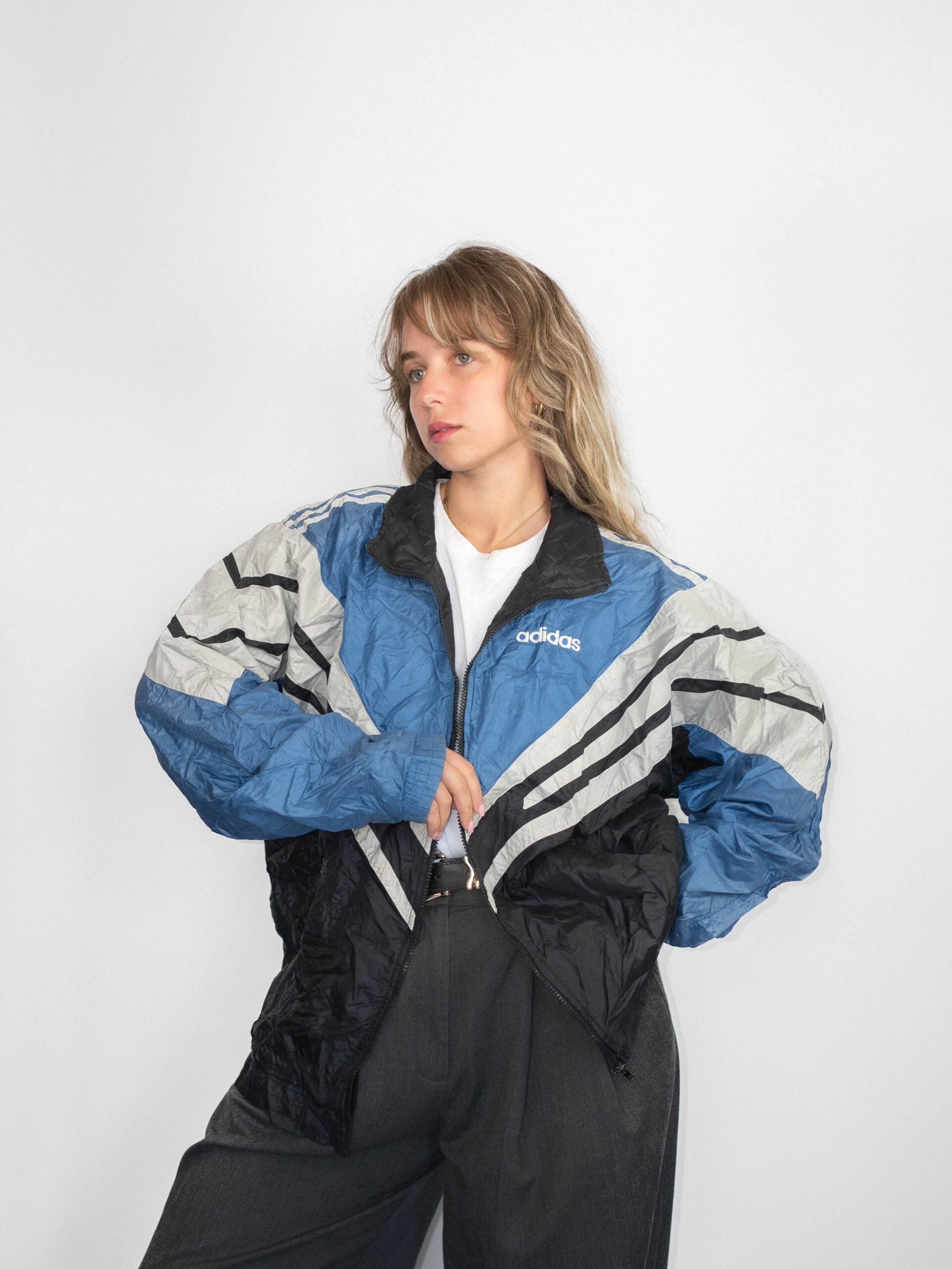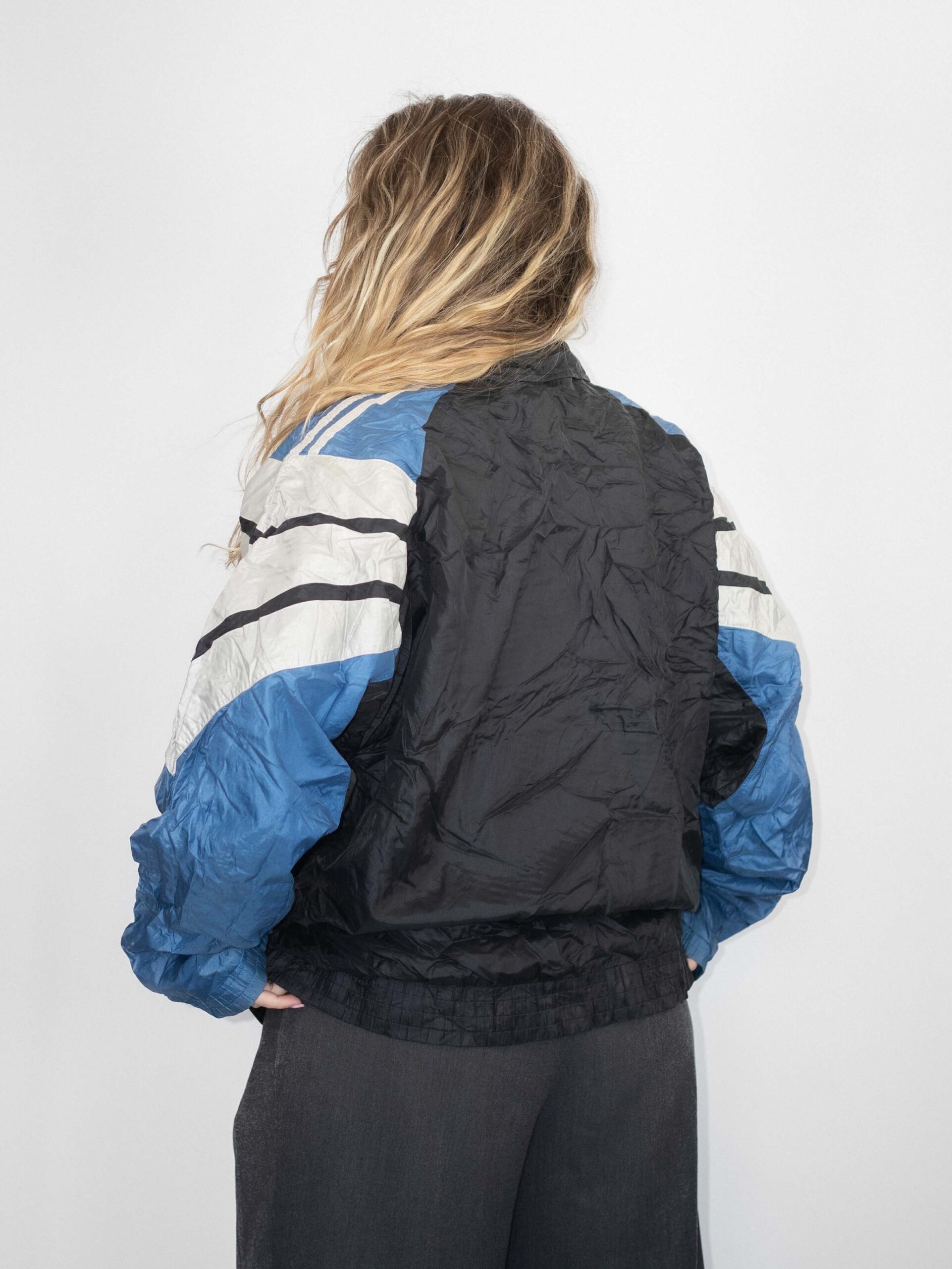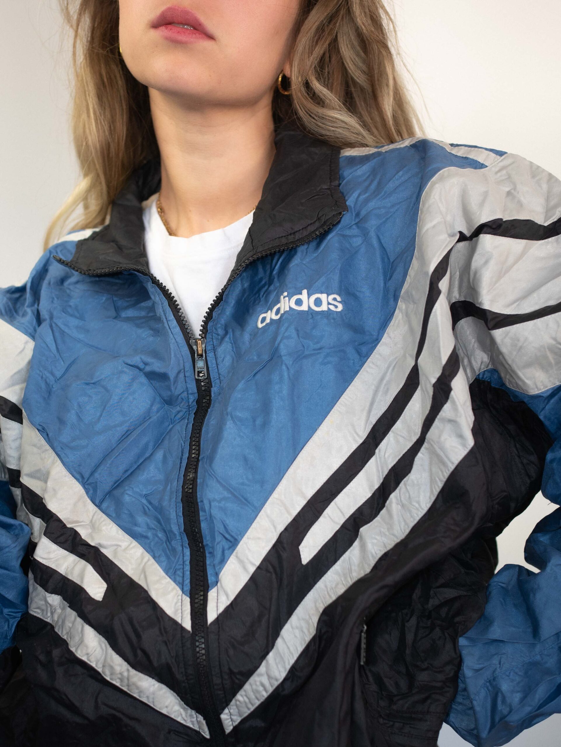 1990s Formula One but make it streetwear. Cool-toned grey, black and steel blue chevrons give this Adidas windbreaker a bold edge. Perfect layered over a hoodie or worn solo with cargos. True vintage, handpicked by Evita. Pre-loved. Ships free.