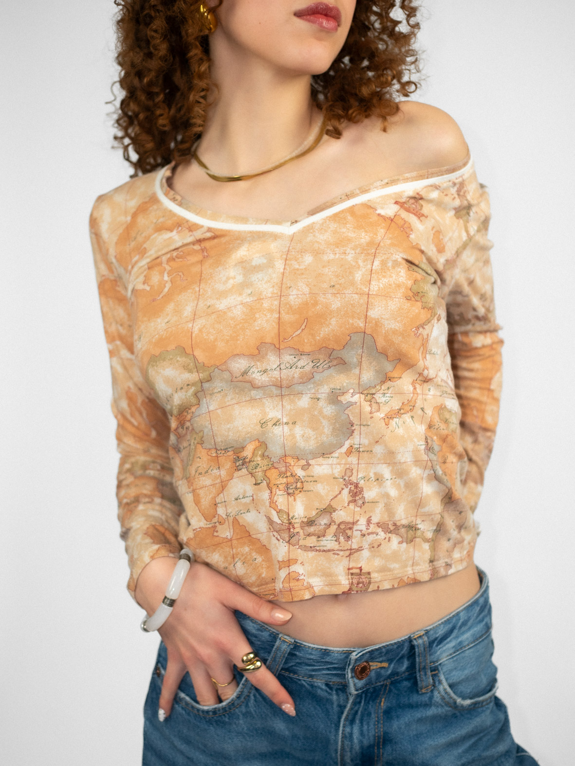Comfortable vintage long sleeve top made from soft, stretchy fabric with an all-over graphic print in warm beige and earth tones. Cropped length and body-hugging fit make it perfect for layering or wearing on its own.