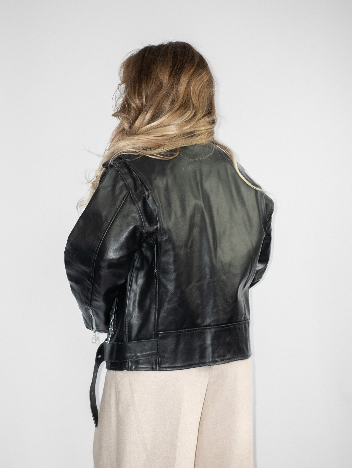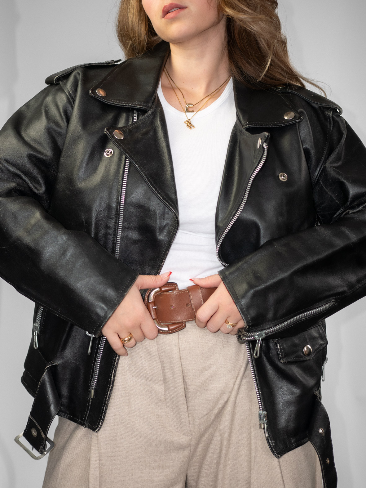 An exceptional, very heavy vintage biker jacket with a striking red inner lining. Finished with a belt, multiple pockets and a strong silhouette — this is a true statement piece.