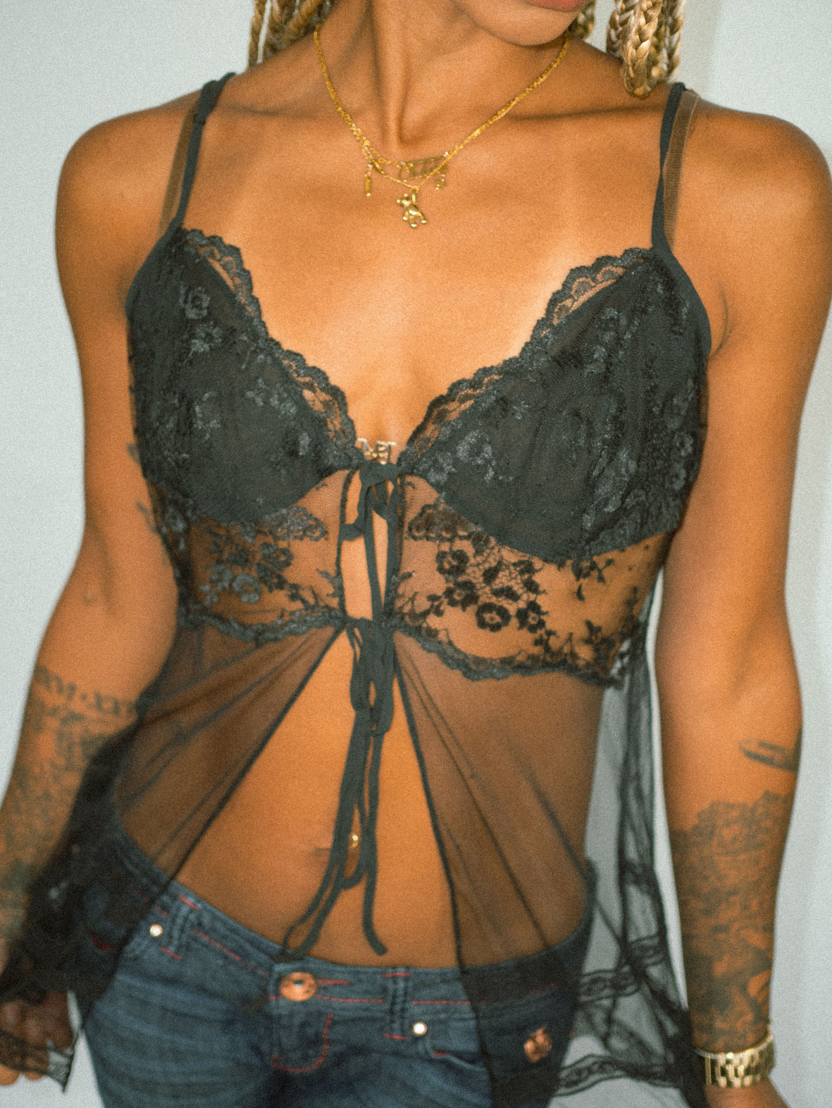 Barely-there and everything. Black mesh cami with floral lace cups and flirty front-tie. Hugging all the right curves, ultra flattering.