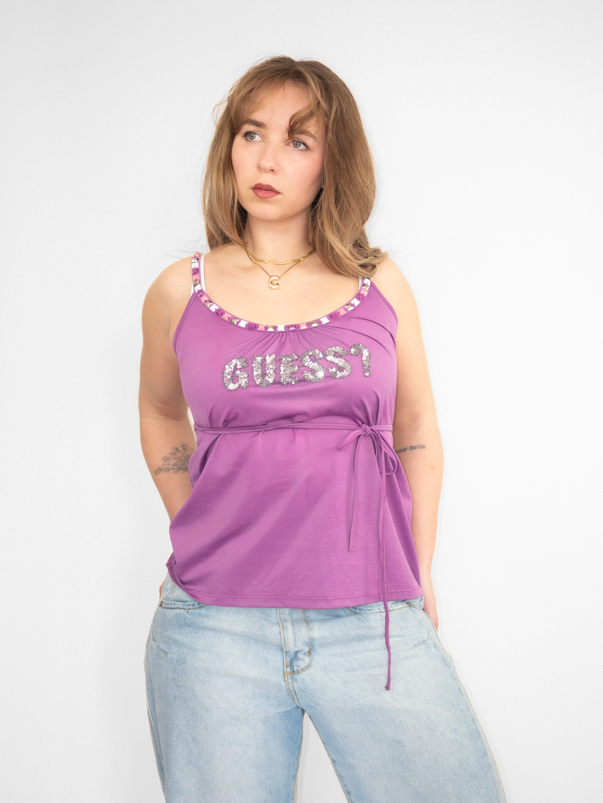 Authentic Guess Y2K cami in a vibrant purple shade with sparkling sequin “GUESS” lettering across the chest. Soft stretch fabric with flattering gathered waist detail.