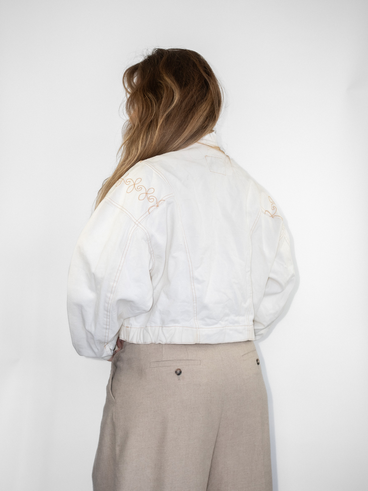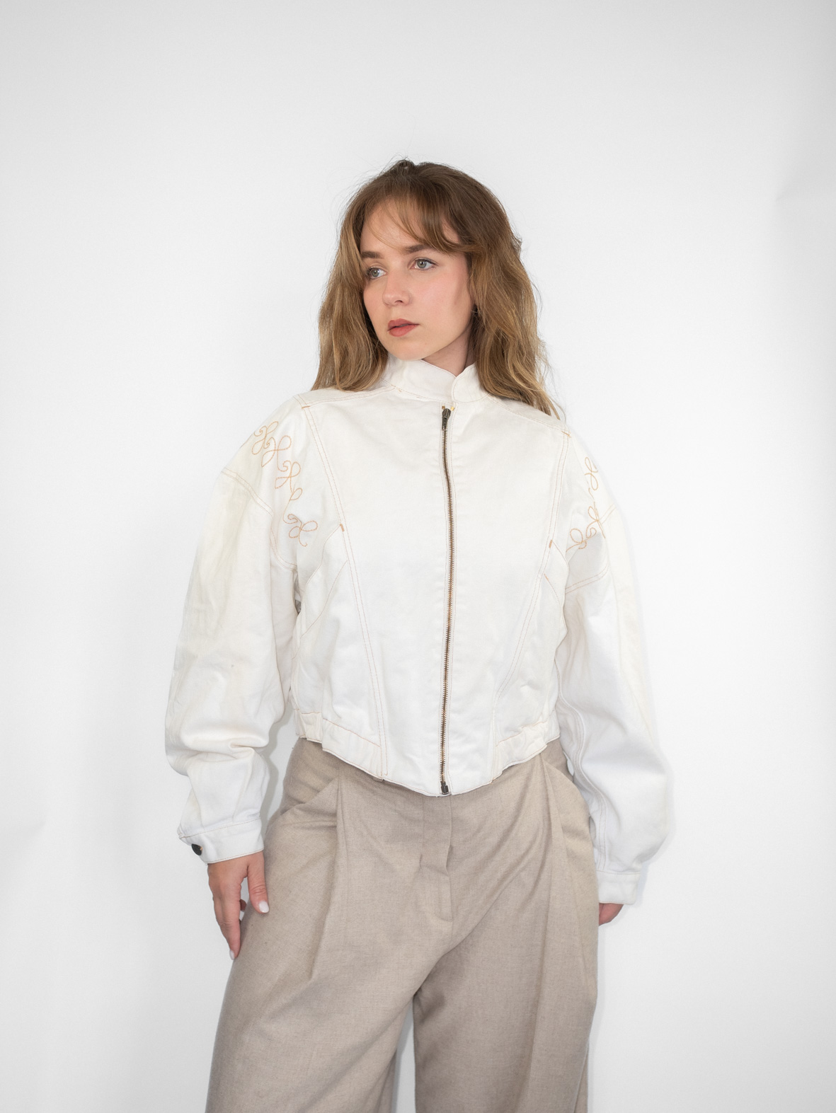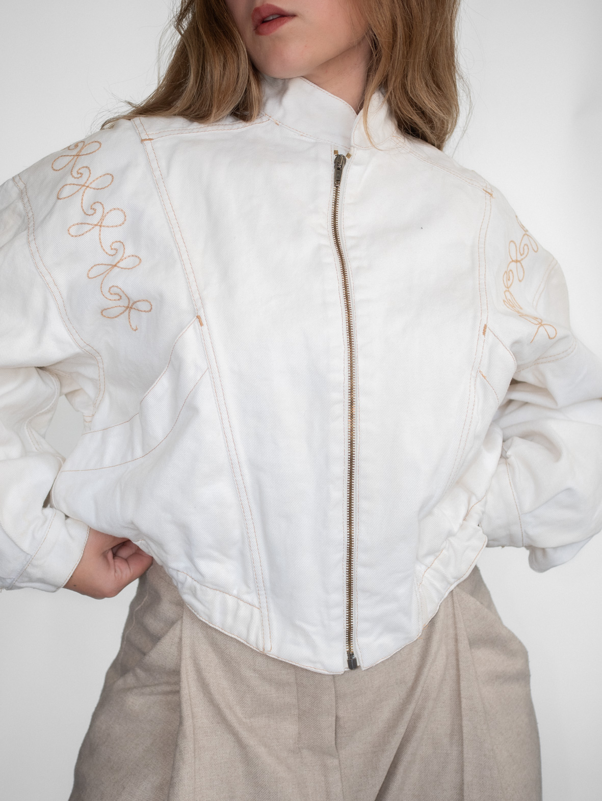Stunning eggshell white denim jacket featuring delicate embroidery details and a front zip closure. Slightly cropped fit that flatters the waist beautifully.