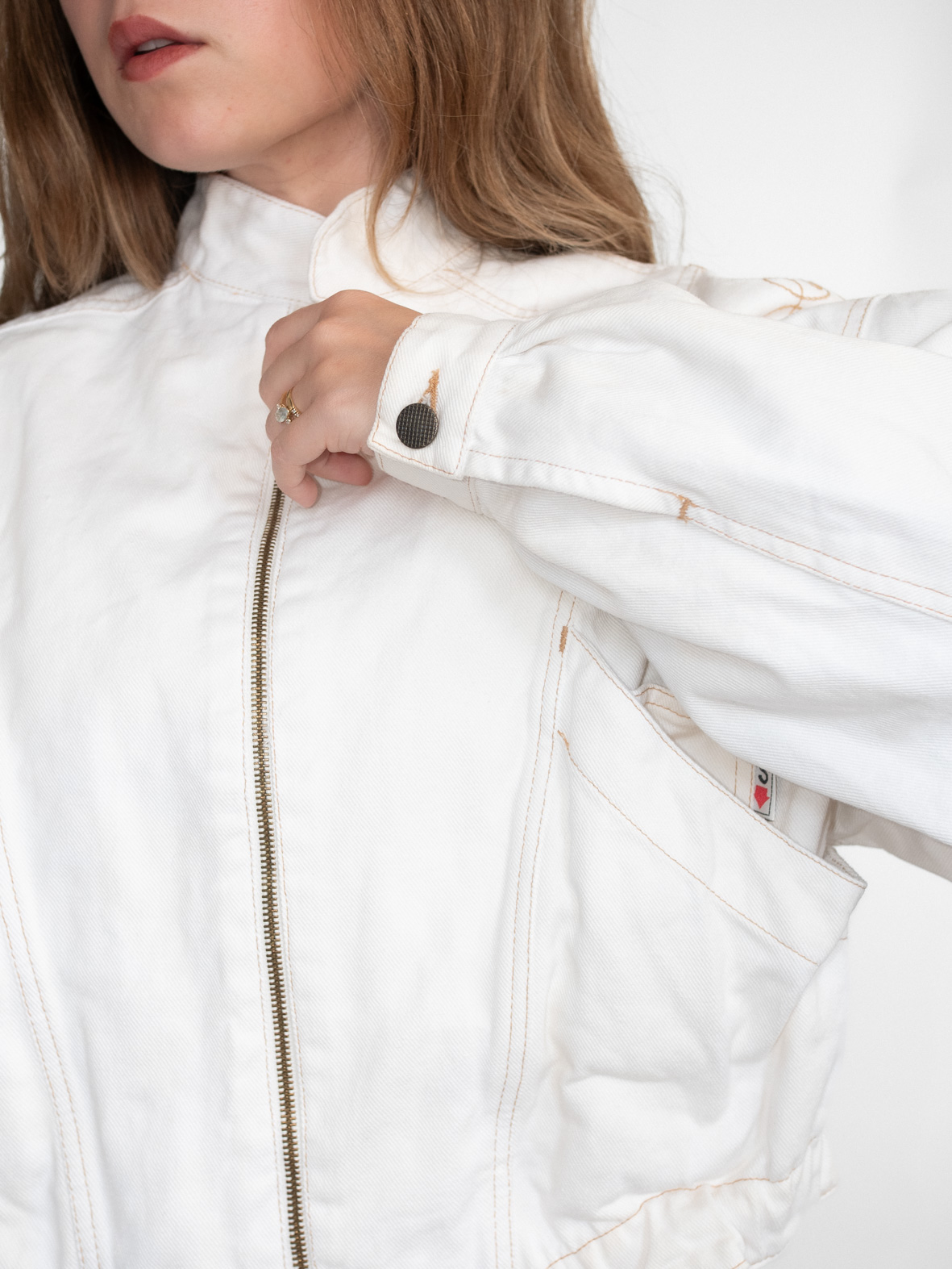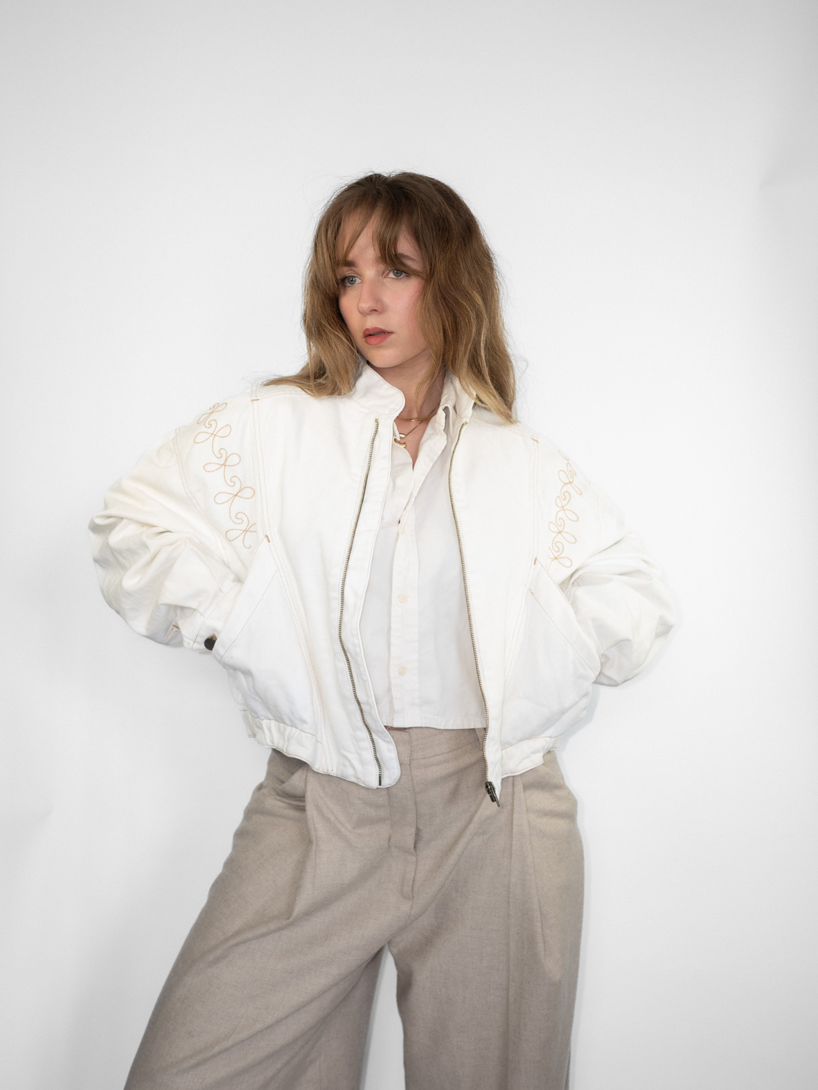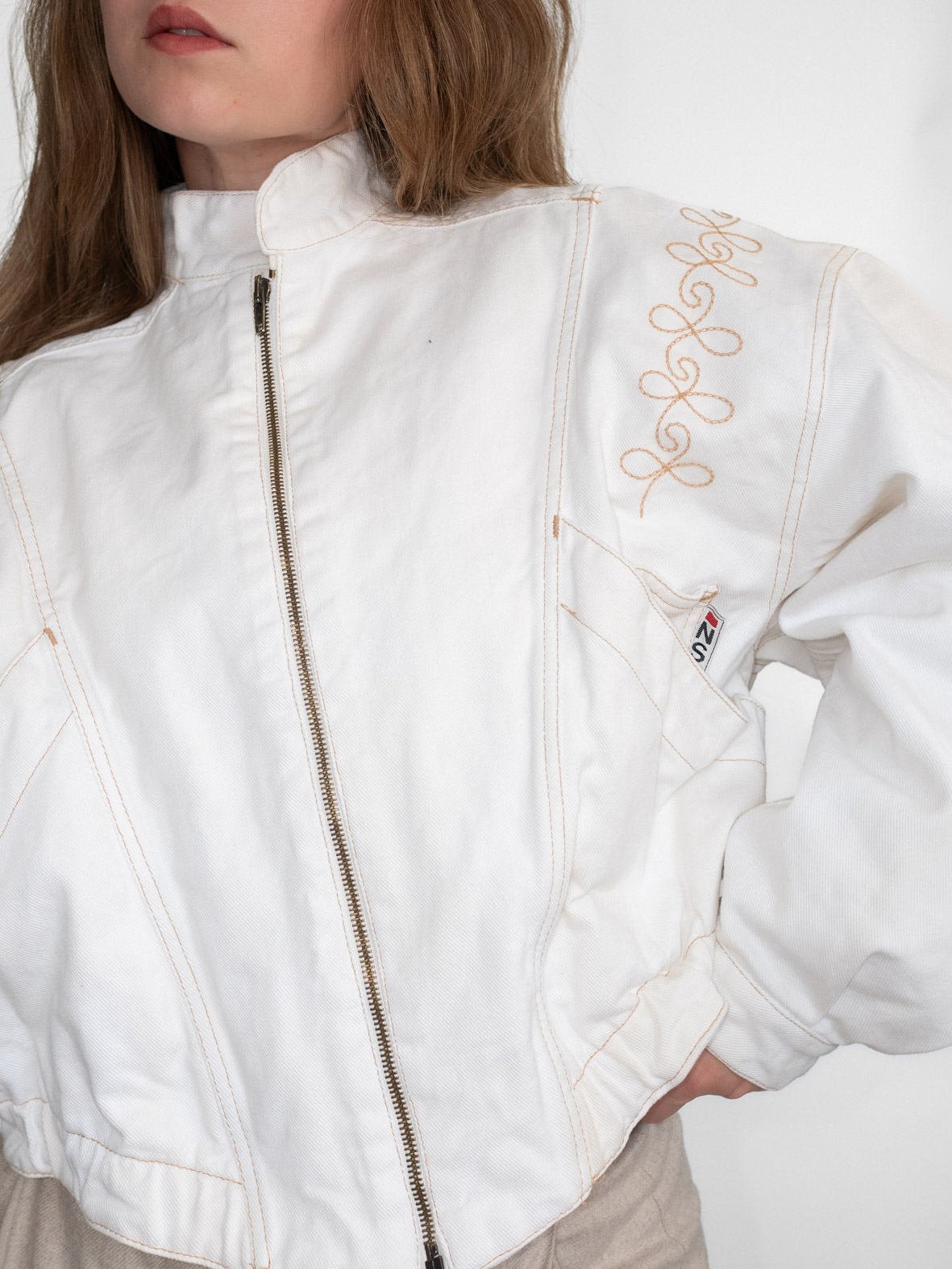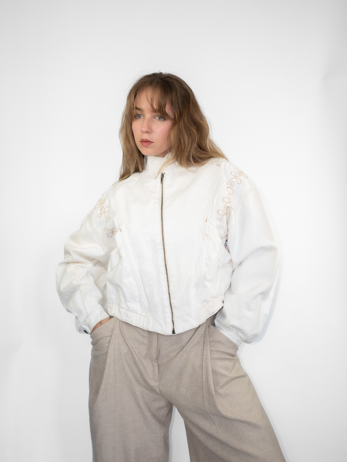 Stunning eggshell white denim jacket featuring delicate embroidery details and a front zip closure. Slightly cropped fit that flatters the waist beautifully.