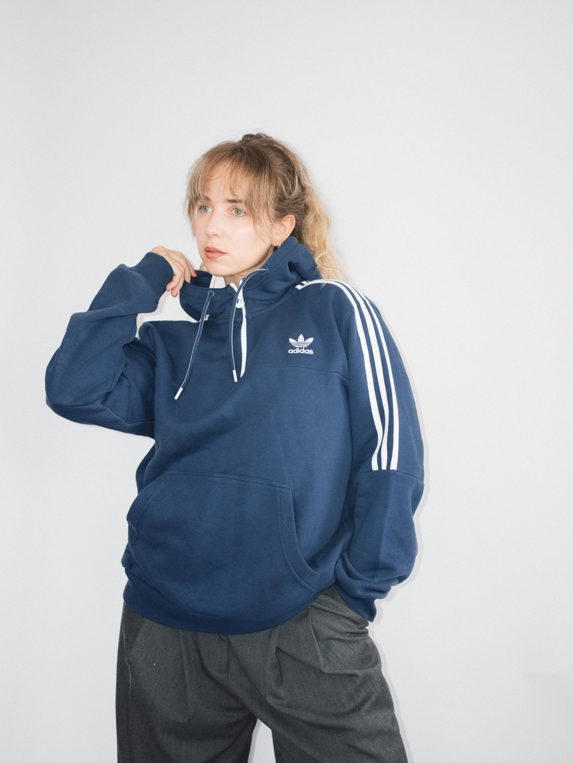 Elevate your athleisure game with this vintage Adidas hoodie, complete with iconic stripes and a front pocket. Curated by Evita, this piece works perfectly with oversized jeans or leggings. A sustainable and unique find for streetwear enthusiasts.