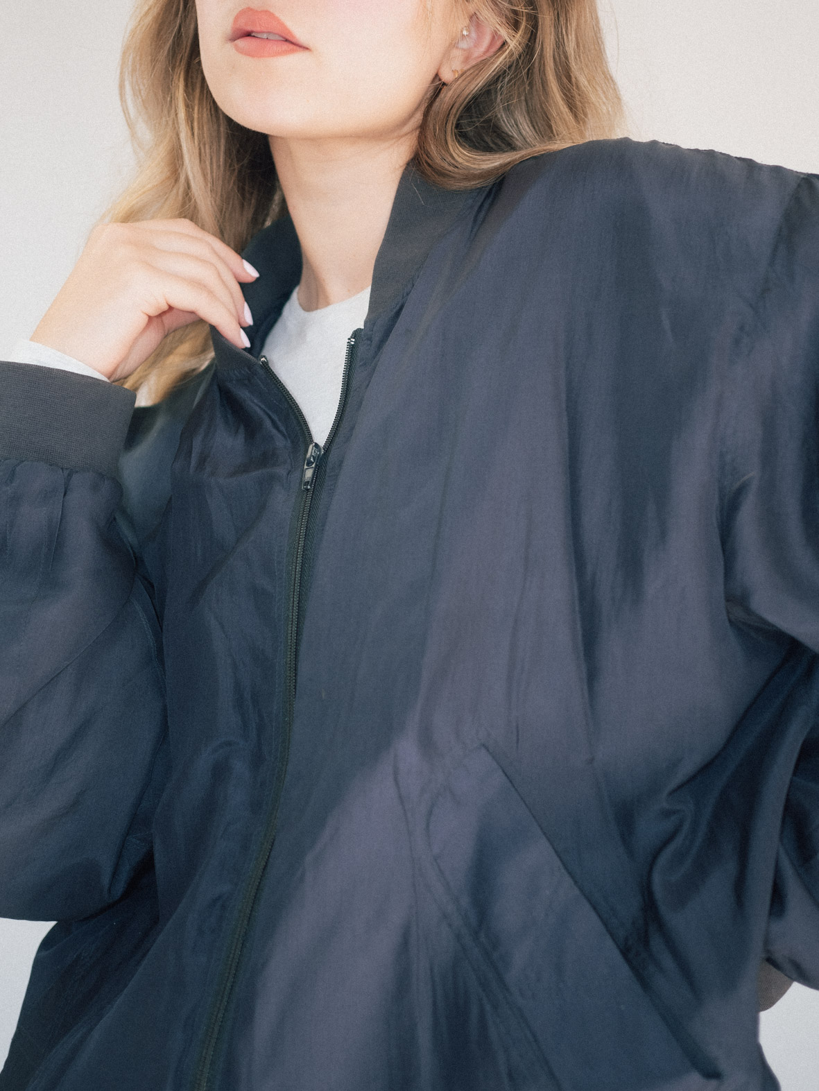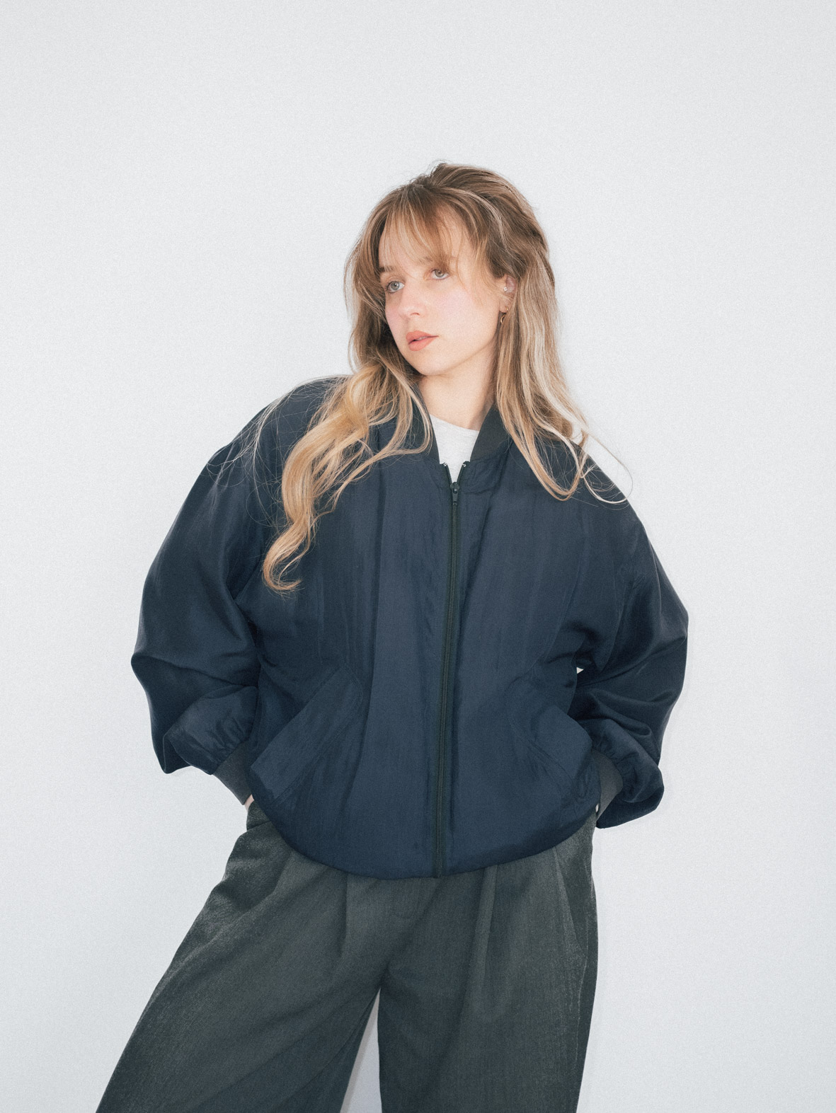 A minimalist black bomber jacket with a cropped fit and voluminous sleeves, giving a structured yet effortless silhouette.