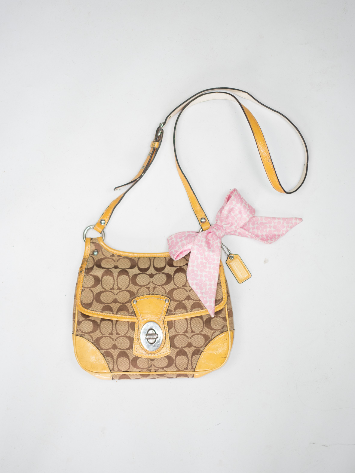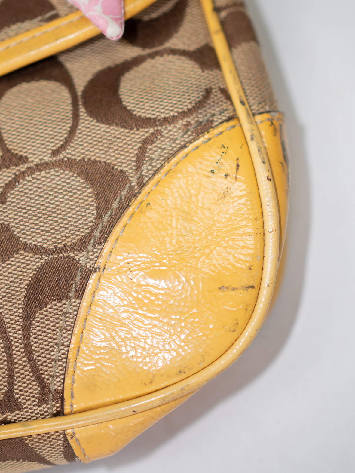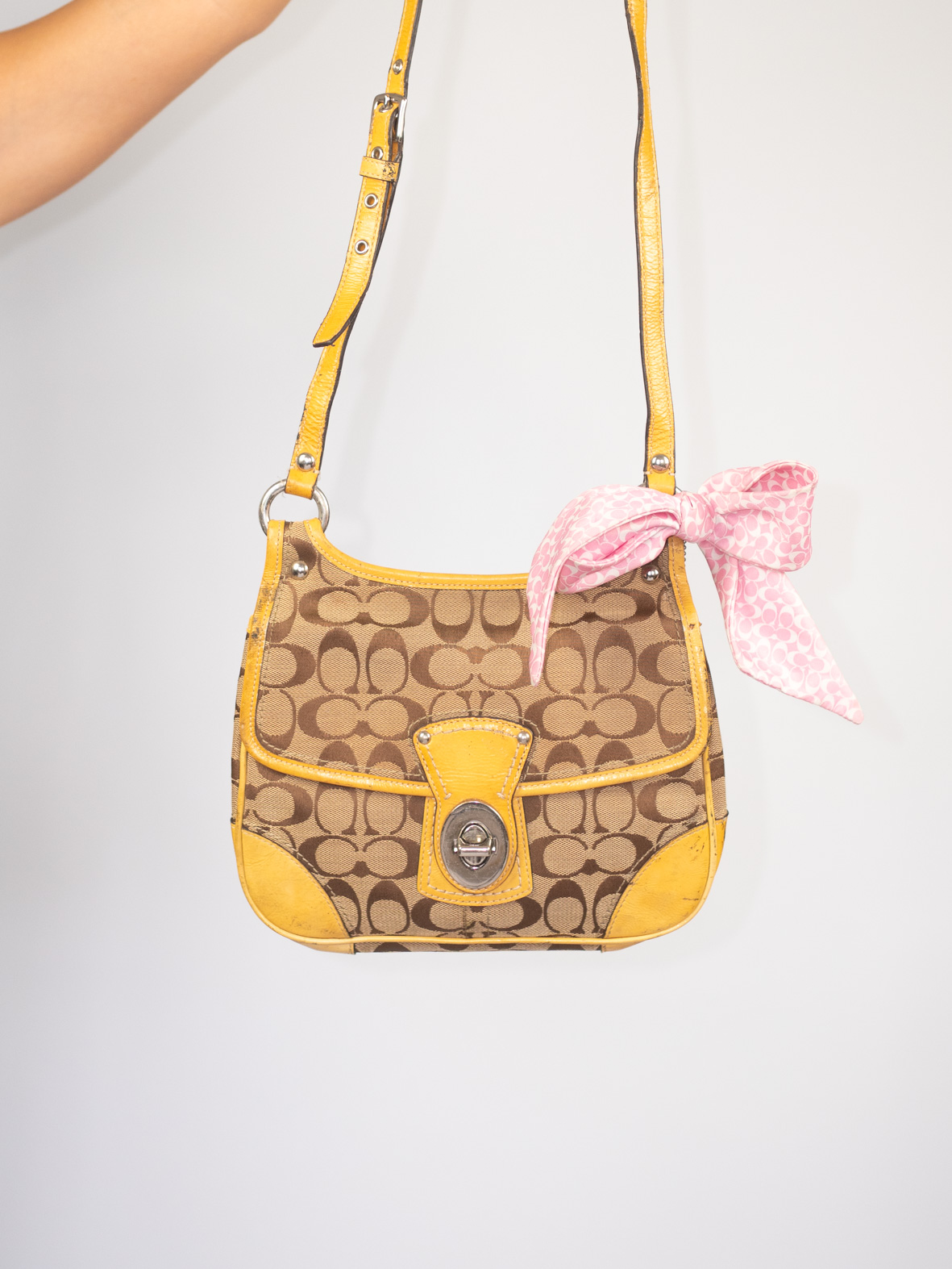 The iconic Coach “C” monogram with bold yellow leather trim. Crossbody comfort, easy to wear. Shows signs of wear = even more authentic vintage charm.