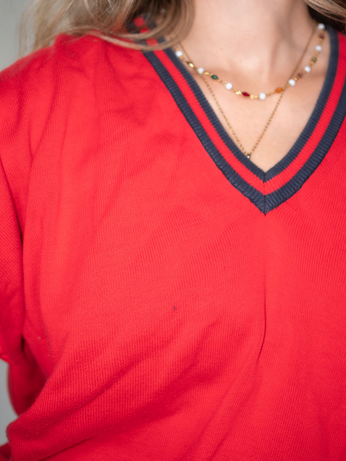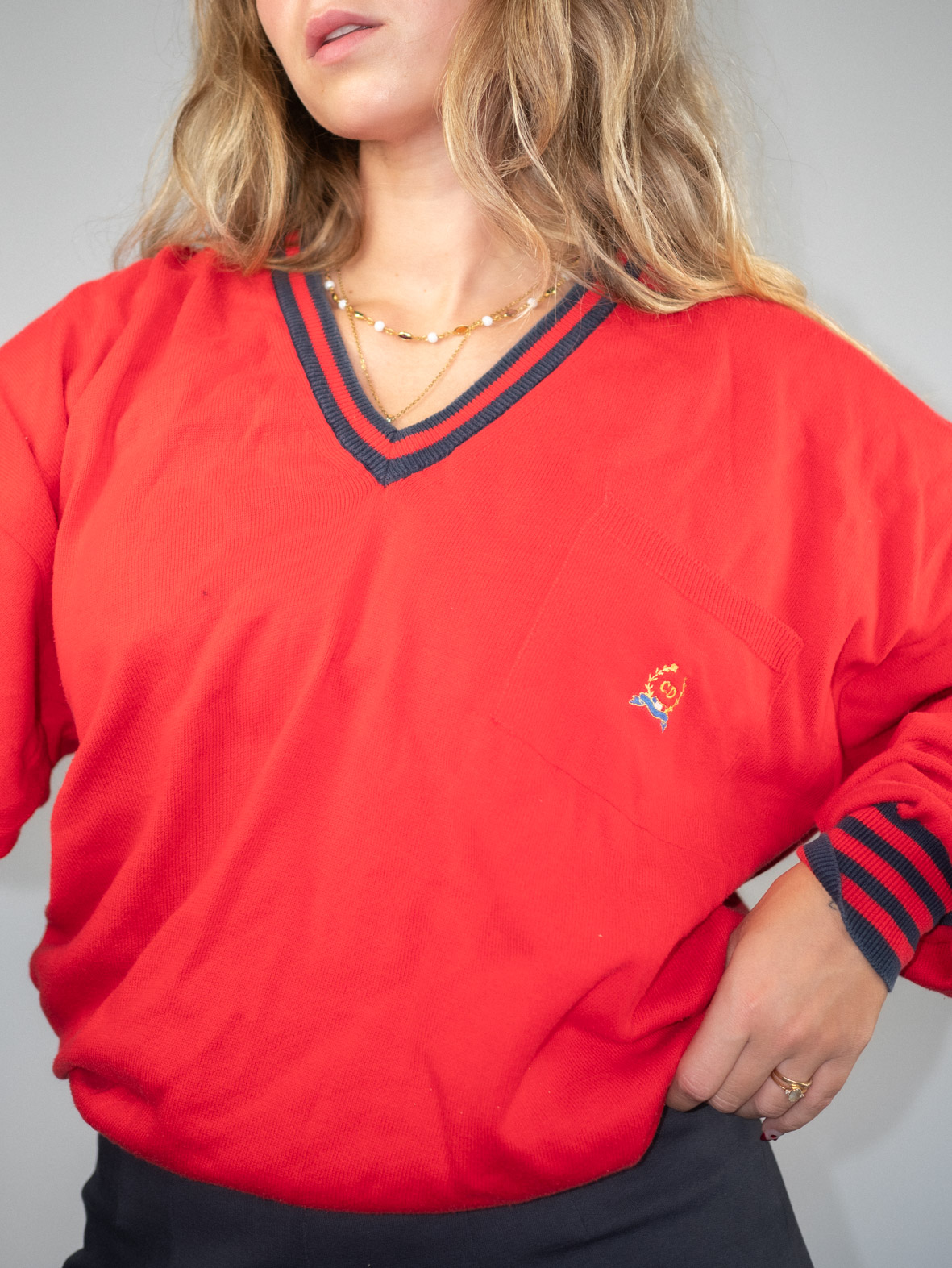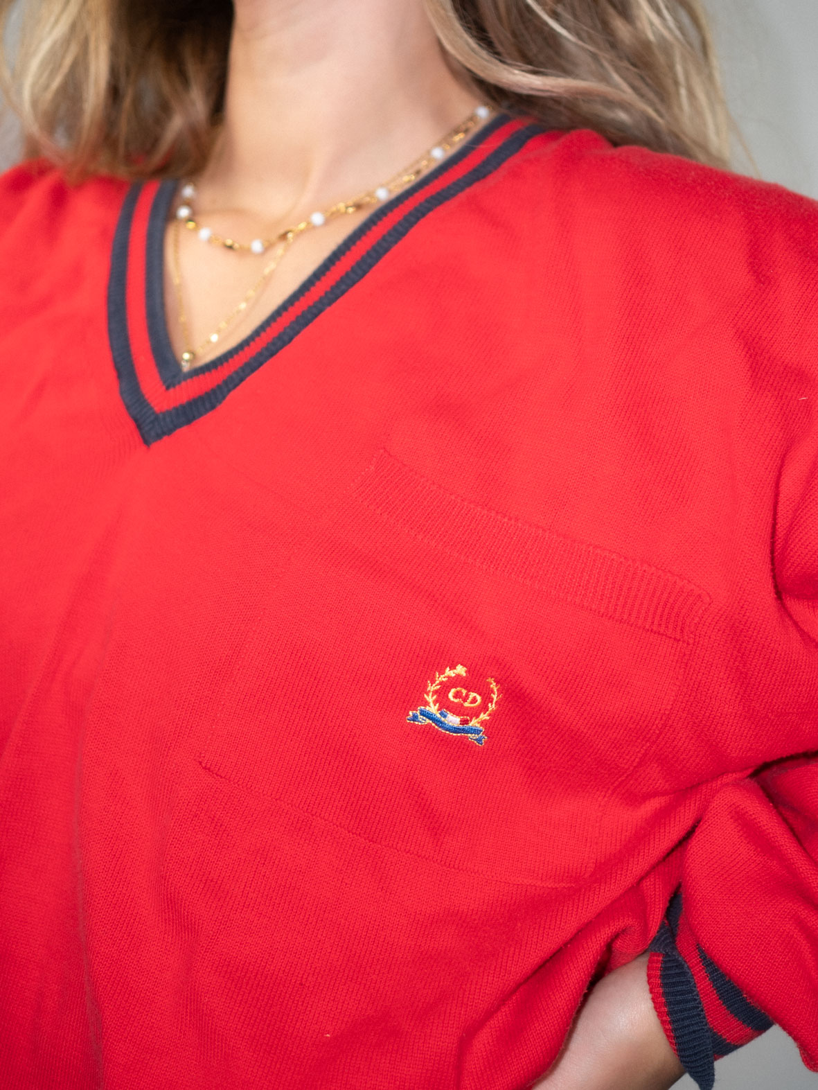 A rare vintage gem by Christian Dior — this deep red V-neck knit blends effortless elegance with that sporty retro vibe. The striped neckline and cuffs give it a playful preppy twist while keeping it chic and wearable.