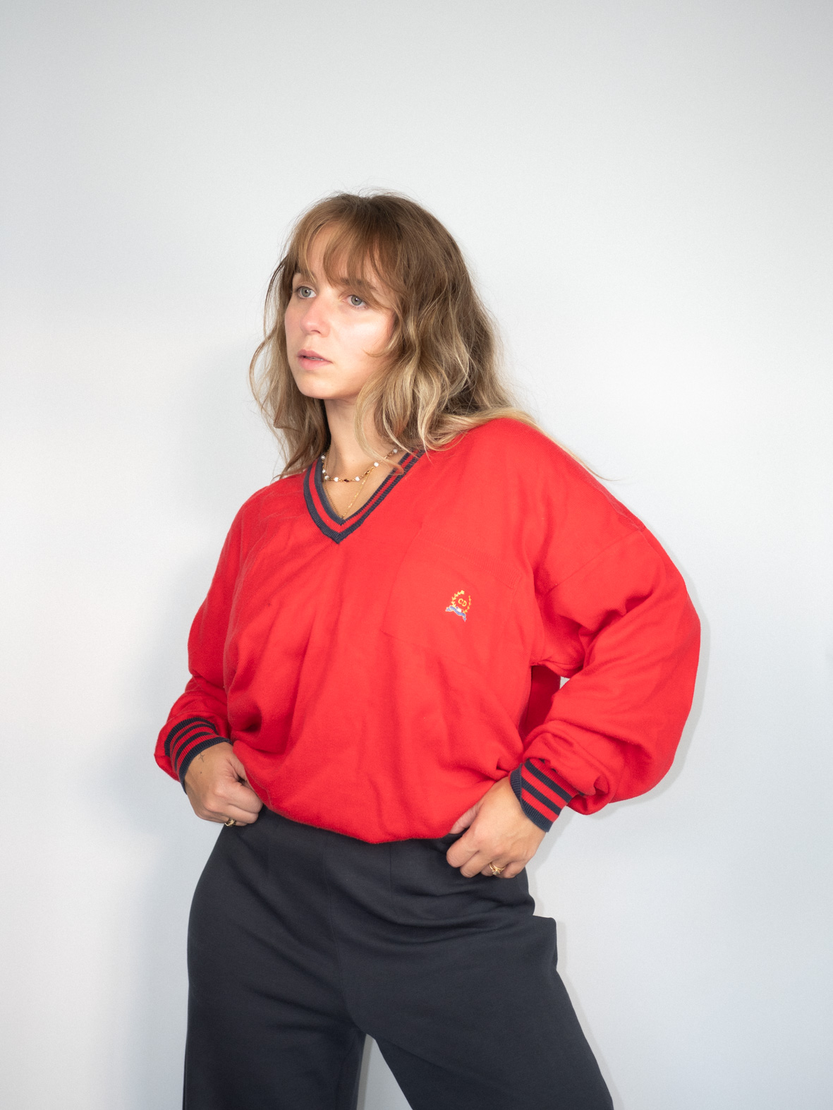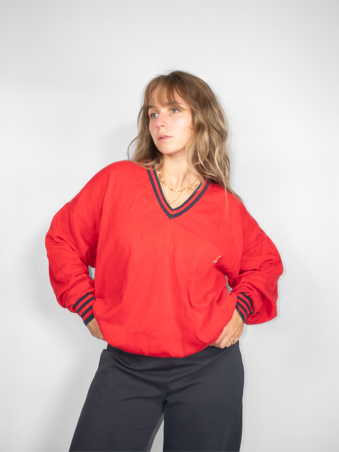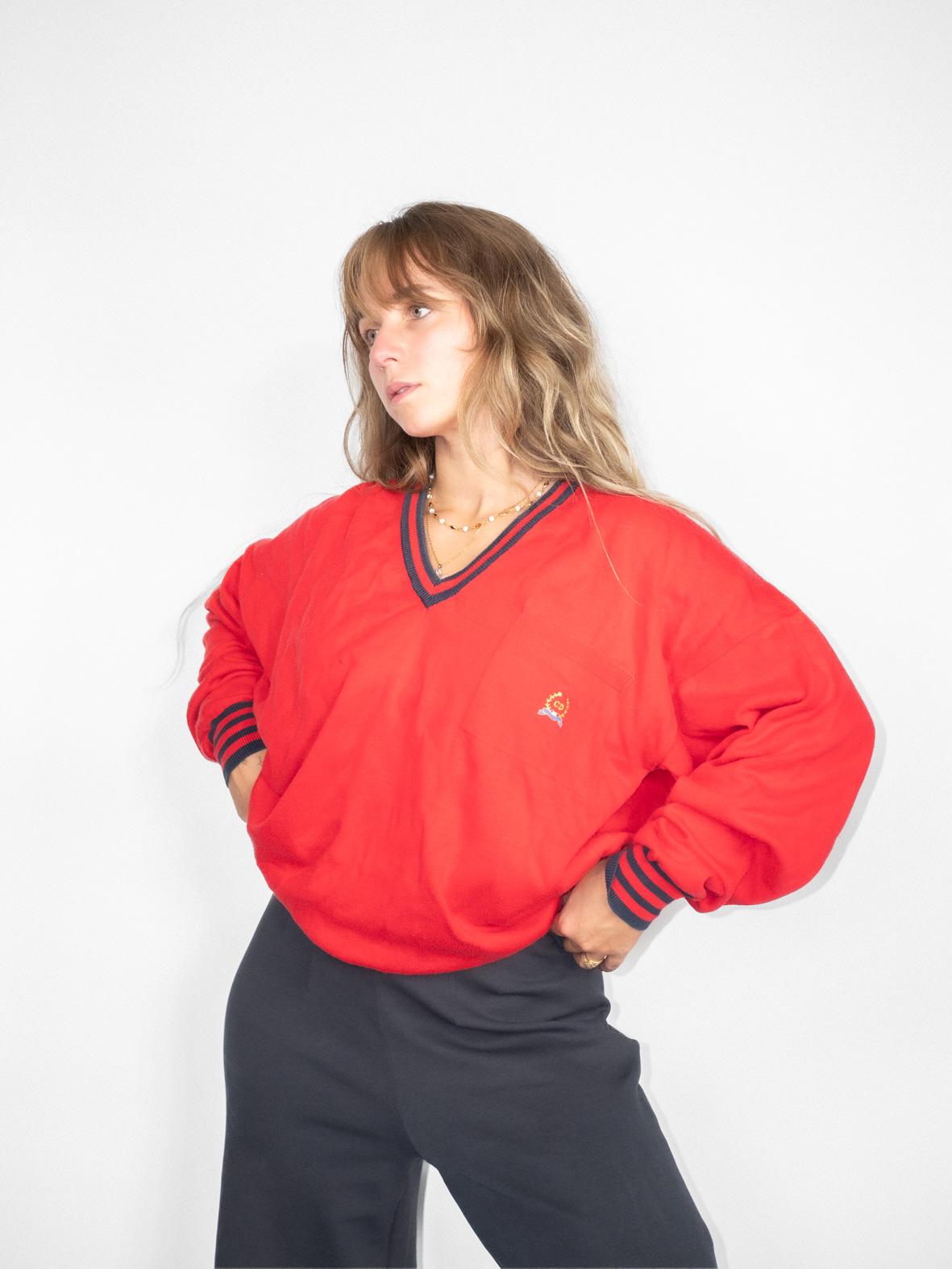 A rare vintage gem by Christian Dior — this deep red V-neck knit blends effortless elegance with that sporty retro vibe. The striped neckline and cuffs give it a playful preppy twist while keeping it chic and wearable.