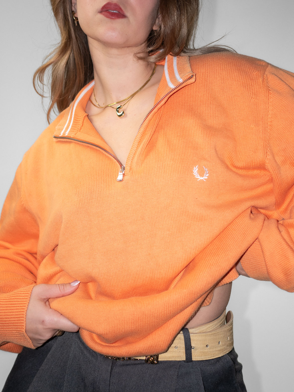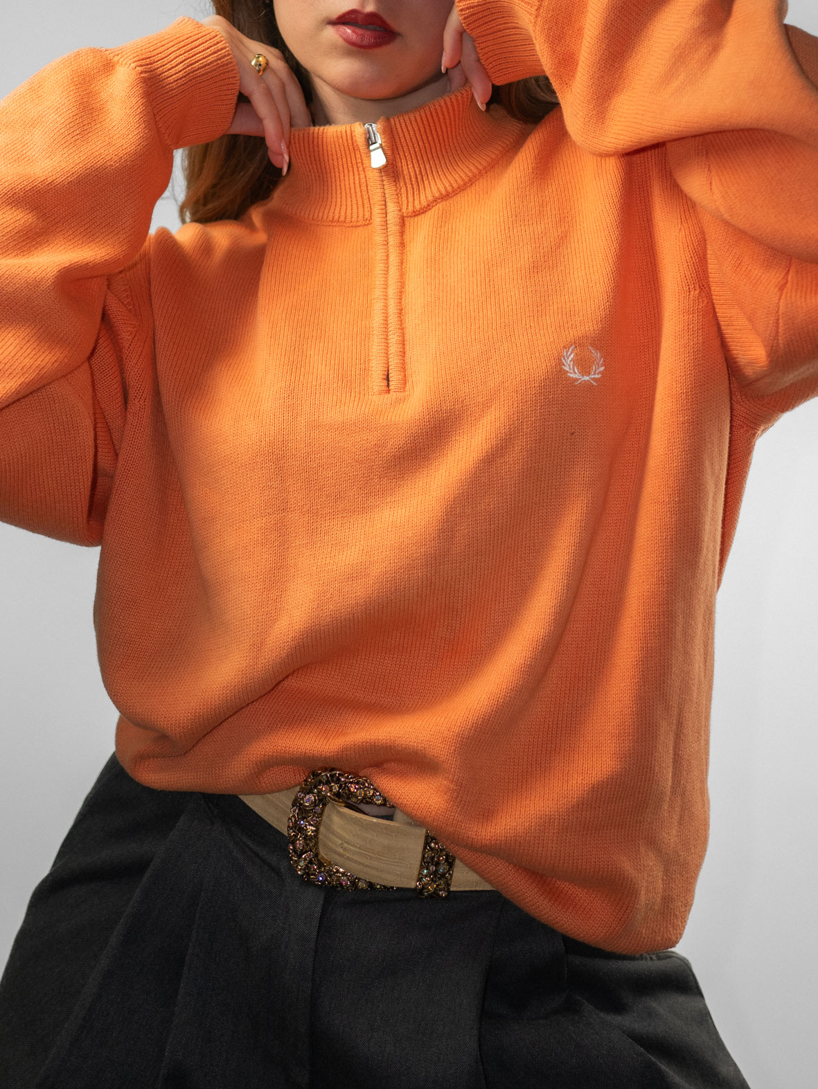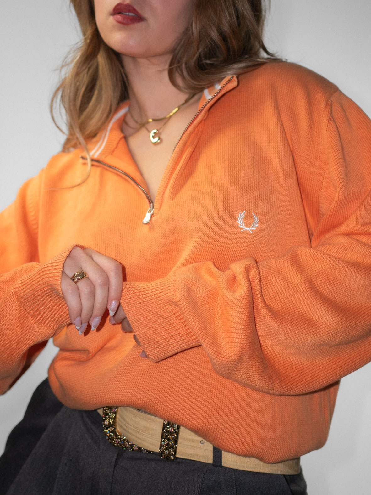 Soft orange oversized knit with ribbed hems and embroidered Fred Perry logo detail. Minimal fading due to age (barely visible).