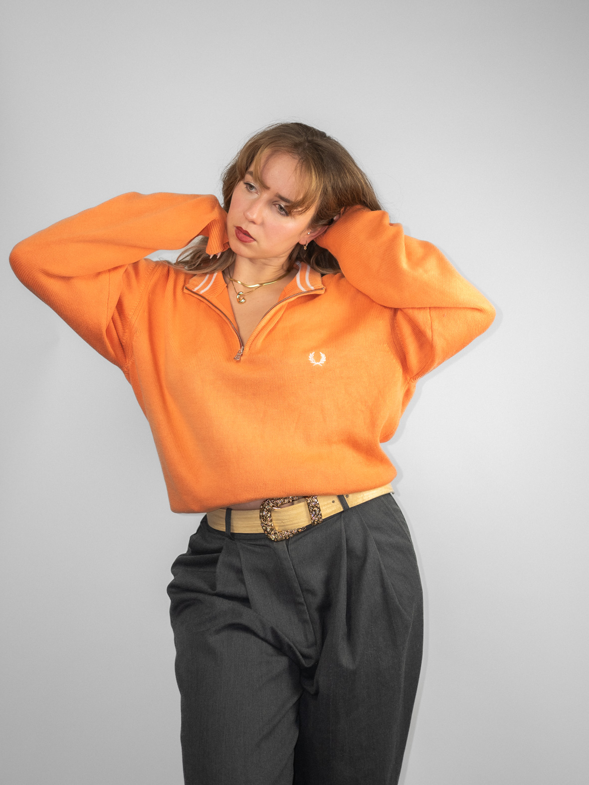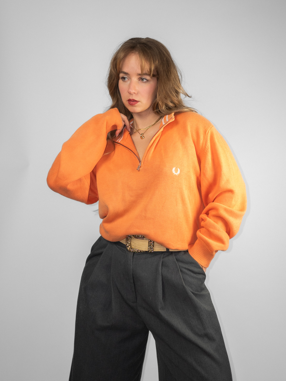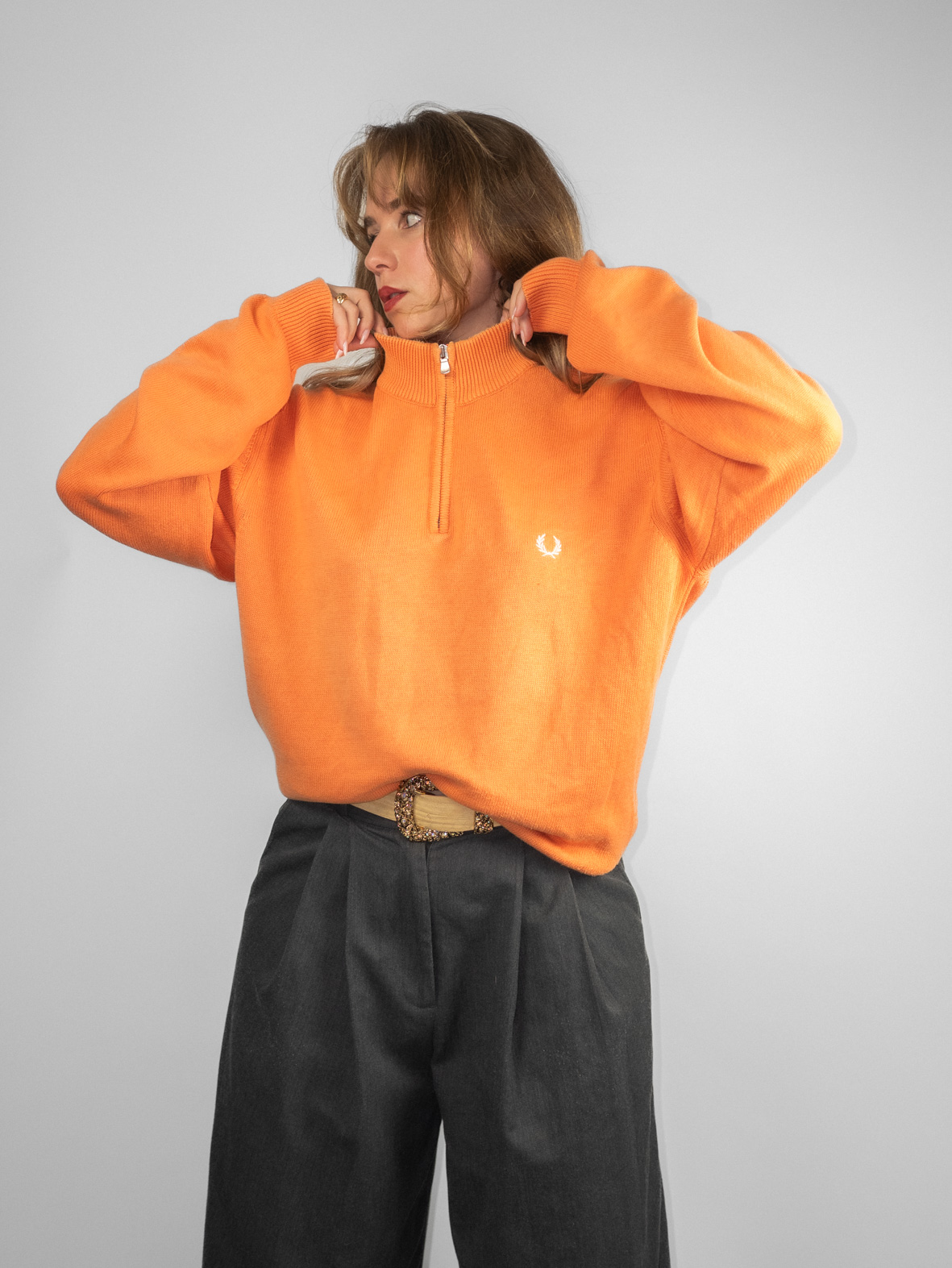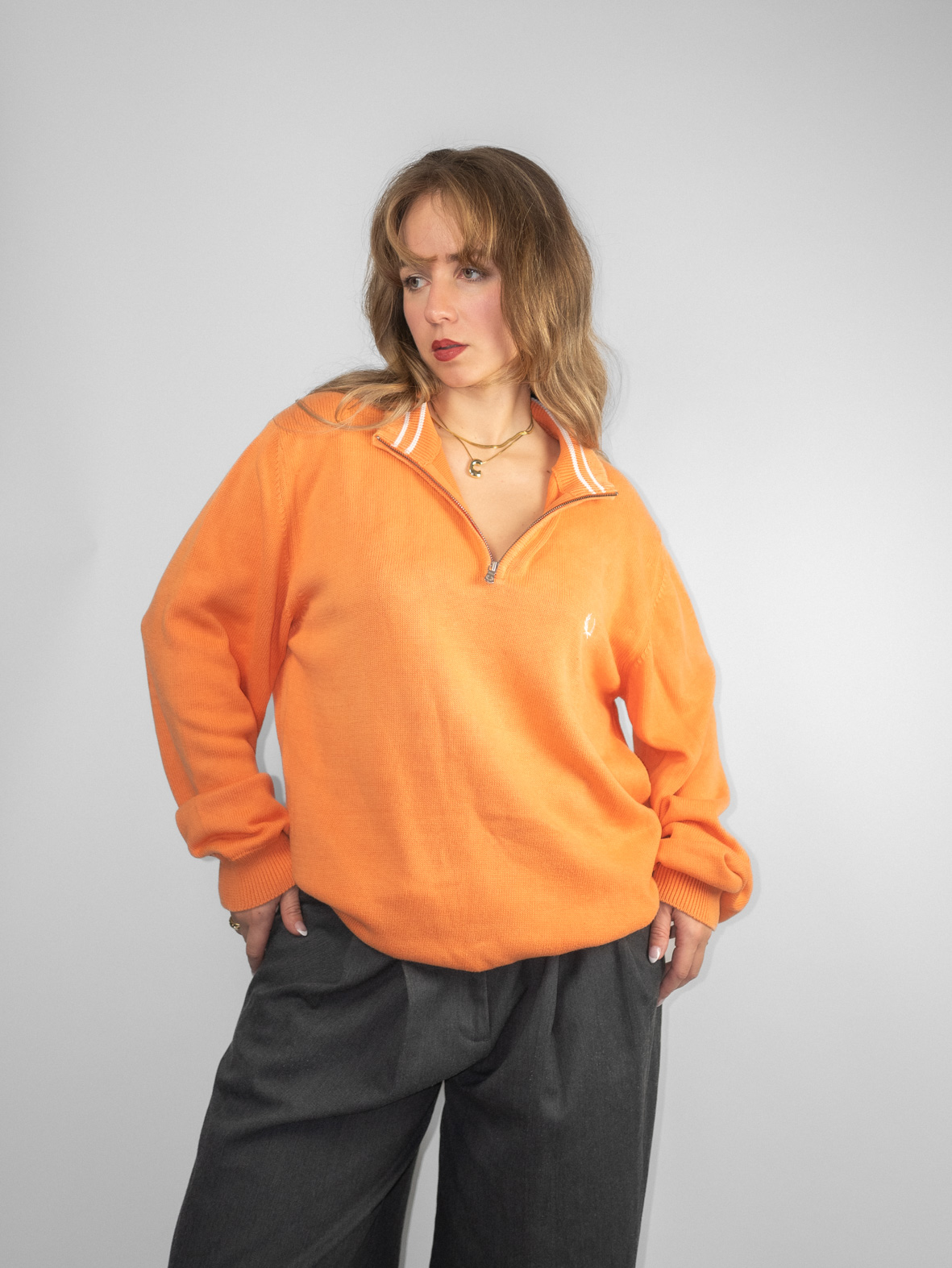 Soft orange oversized knit with ribbed hems and embroidered Fred Perry logo detail. Minimal fading due to age (barely visible).
