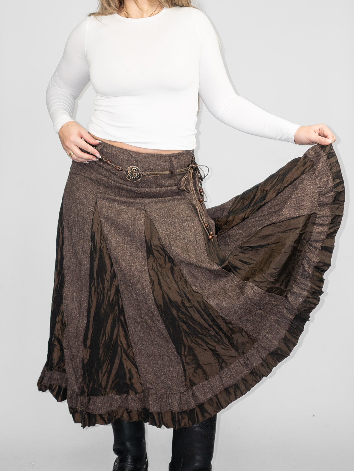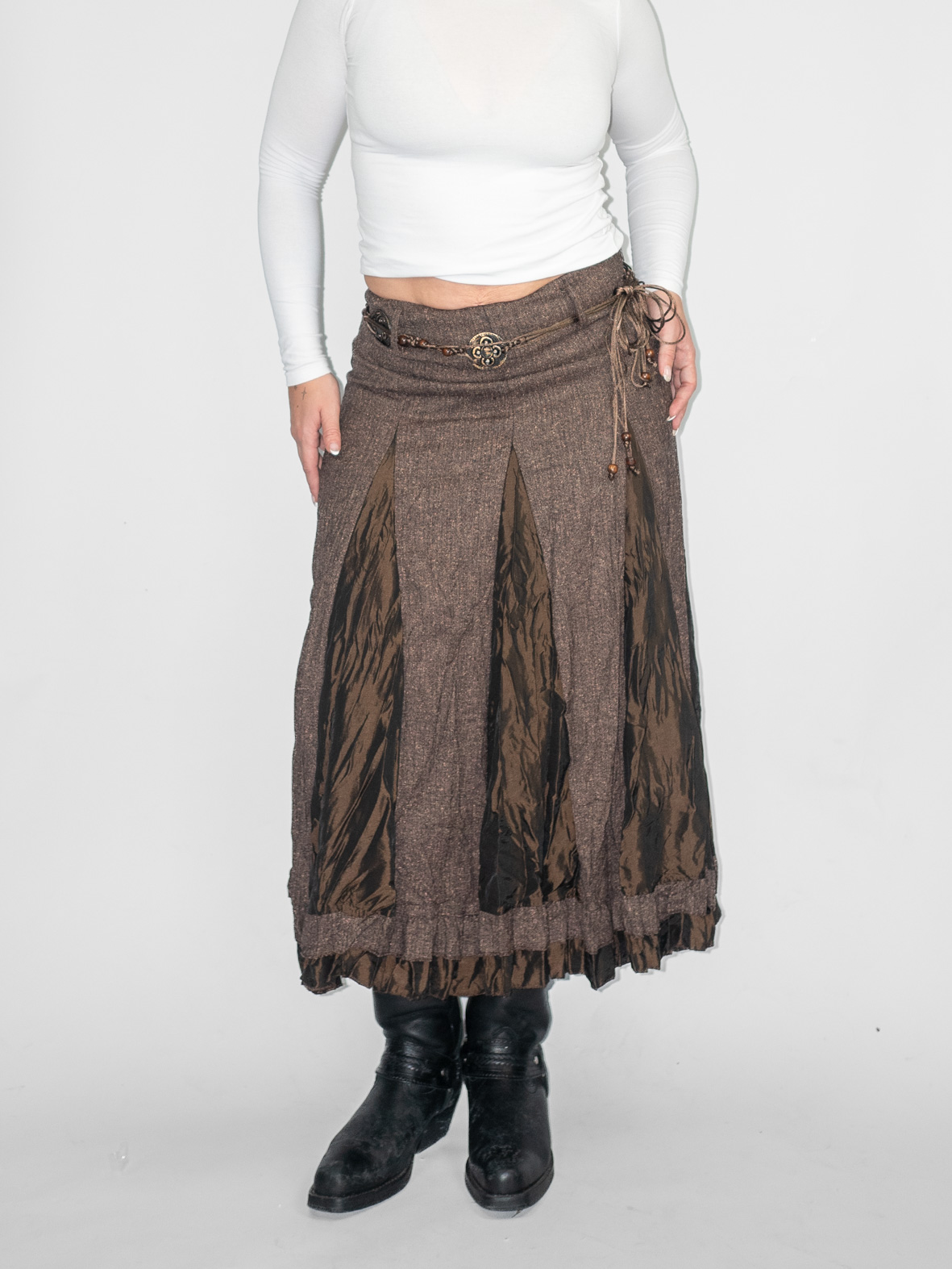 A beautifully cut vintage skirt made from breathable linen. The included belt and generous fabric give it a relaxed yet refined silhouette.