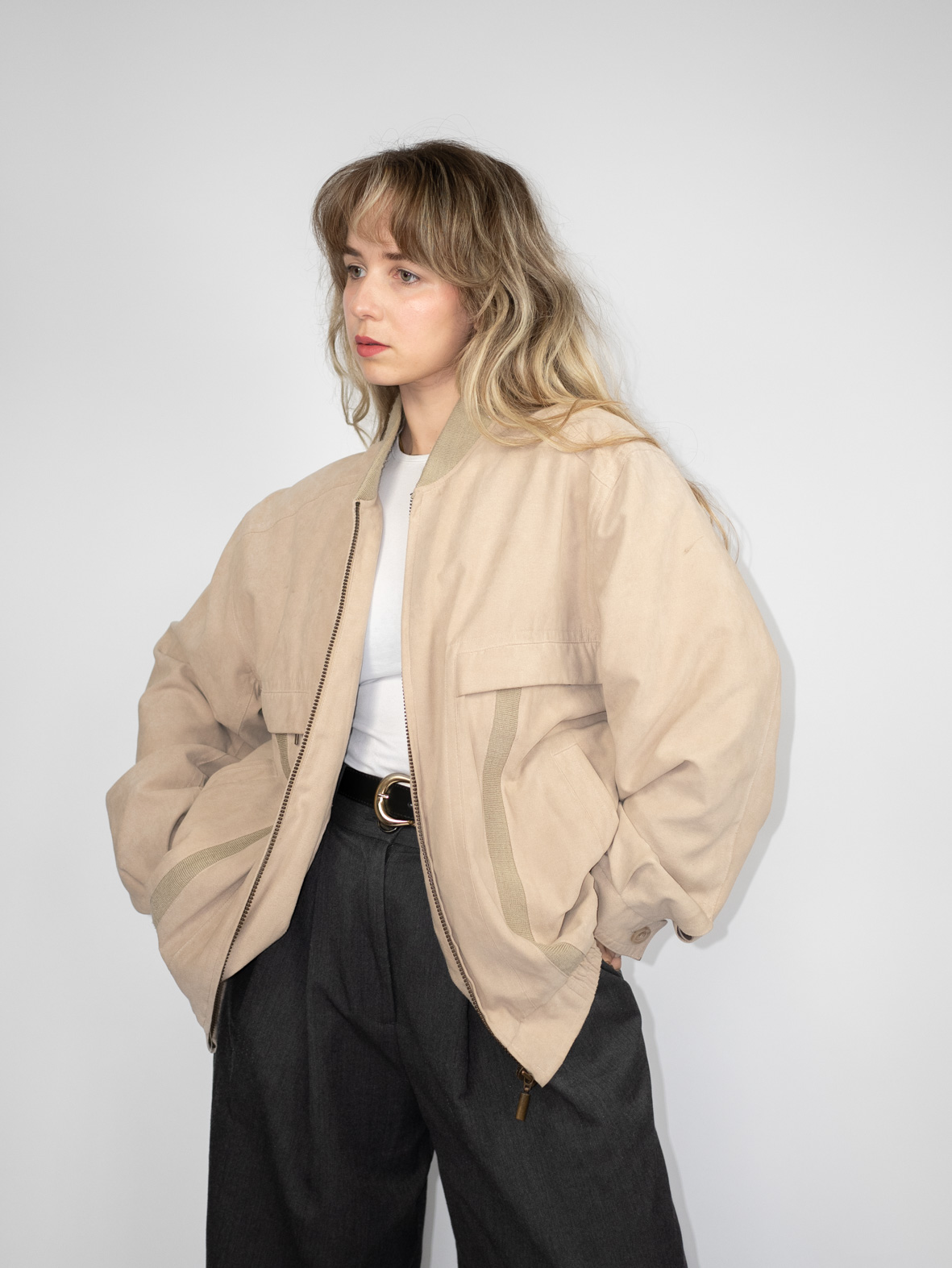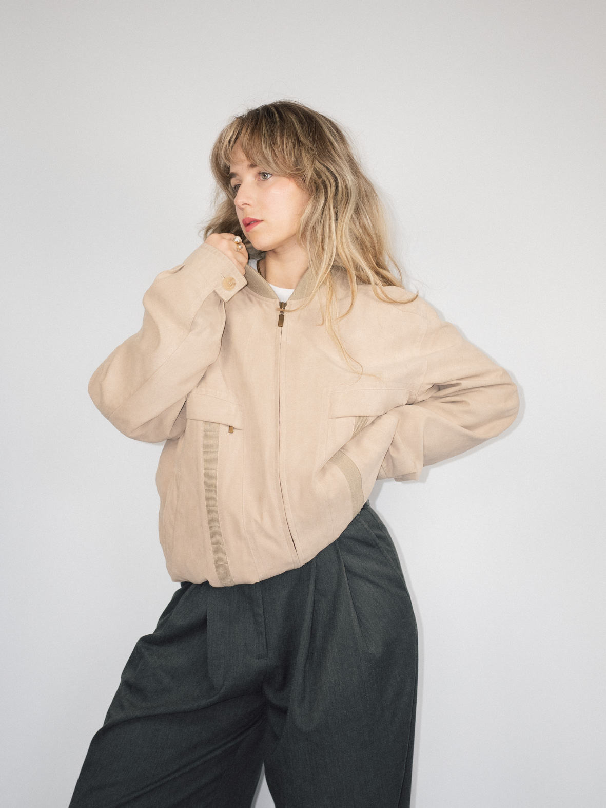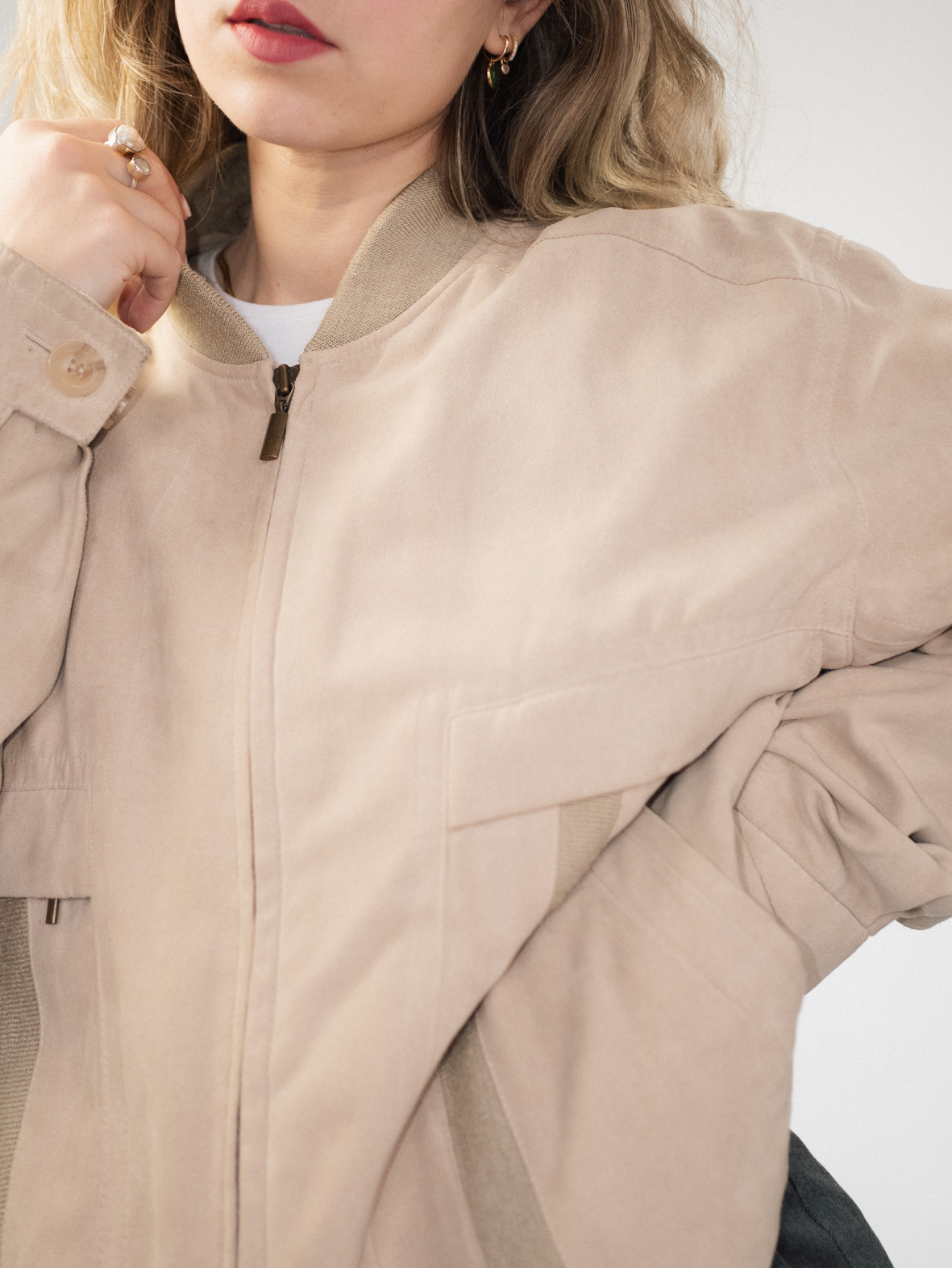 A lightweight, versatile bomber jacket in a soft beige shade. The relaxed fit and structured details make it perfect for layering over casual or tailored looks. Pair with straight-leg jeans and a simple tee for an effortless, minimalist aesthetic.