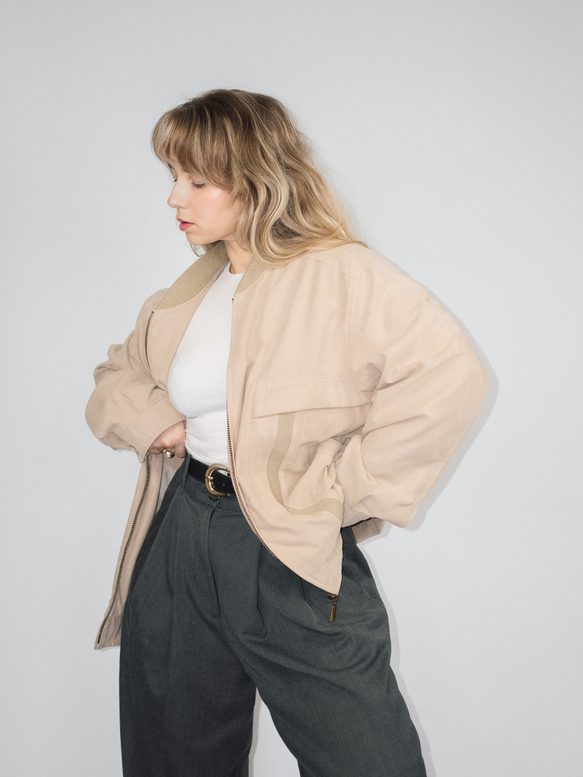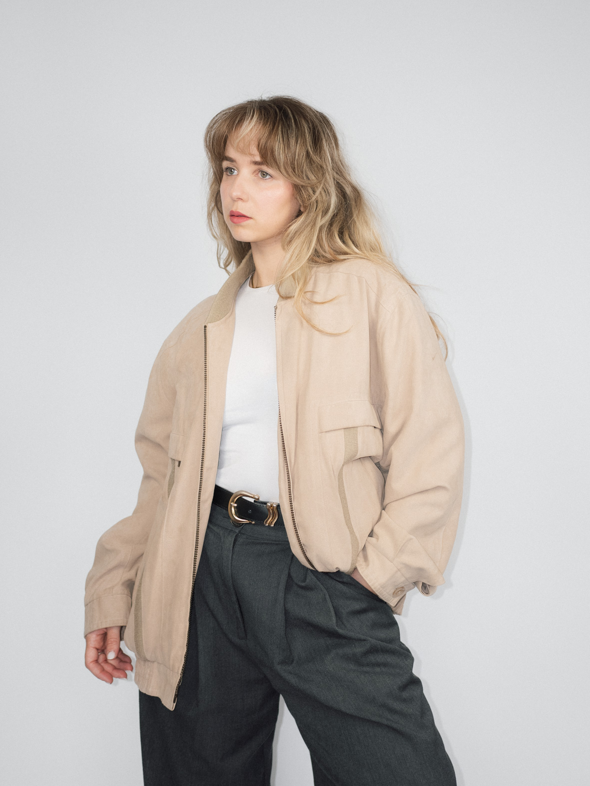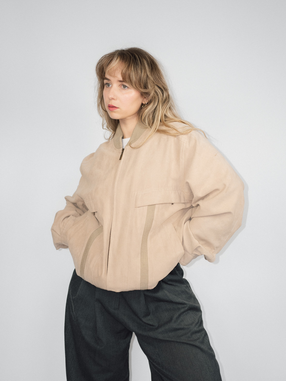 A lightweight, versatile bomber jacket in a soft beige shade. The relaxed fit and structured details make it perfect for layering over casual or tailored looks. Pair with straight-leg jeans and a simple tee for an effortless, minimalist aesthetic.