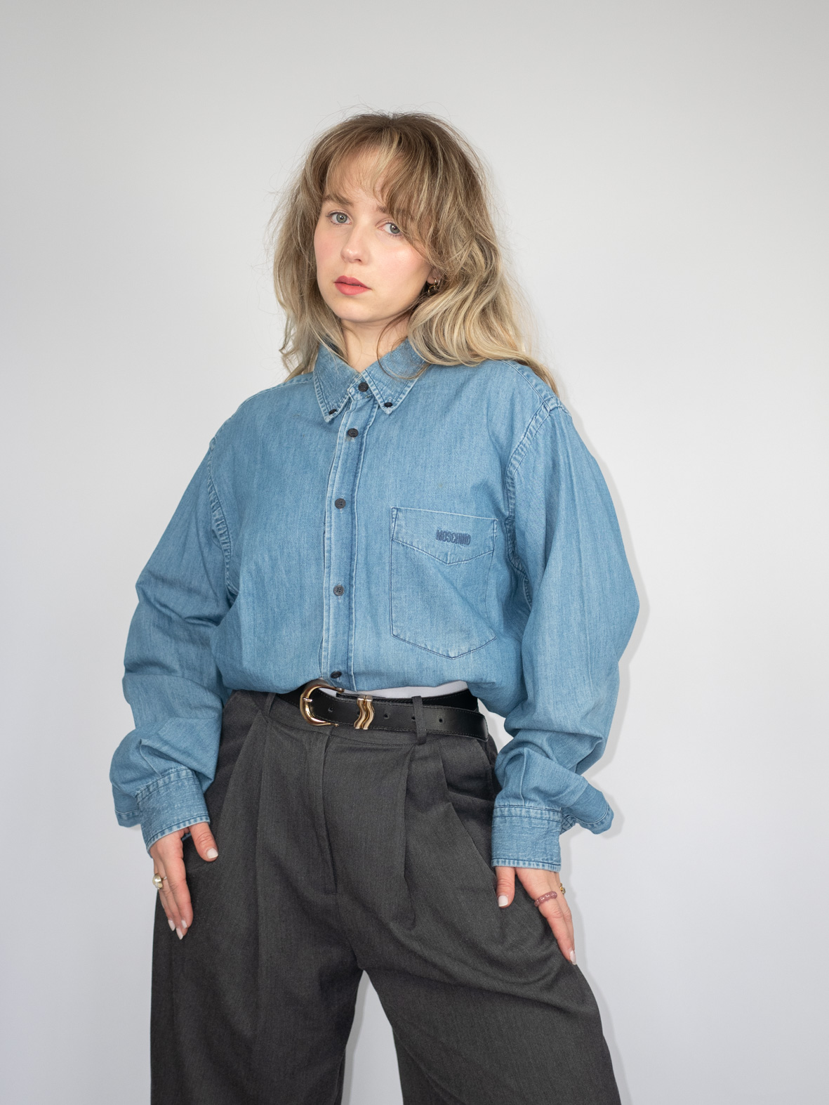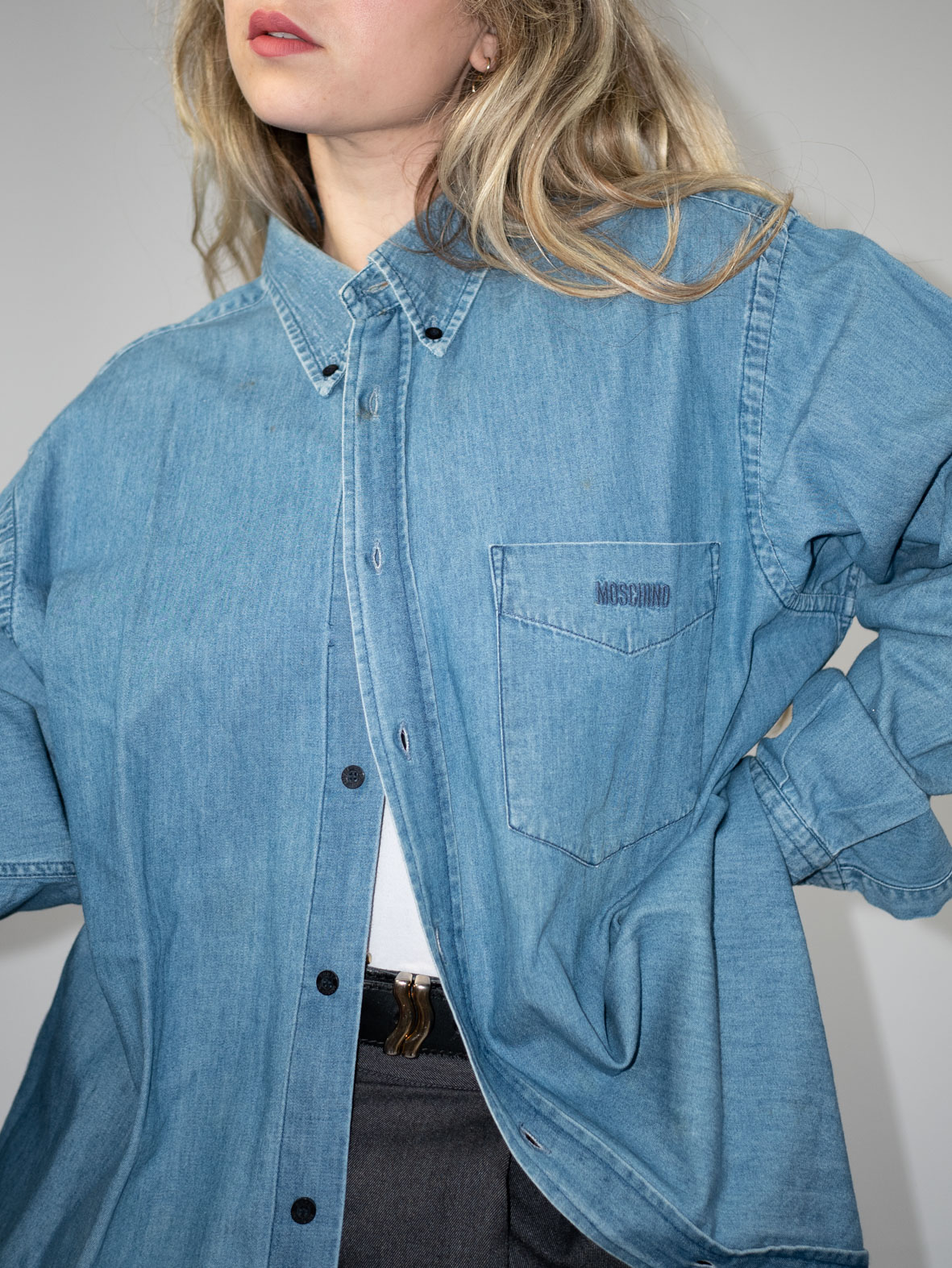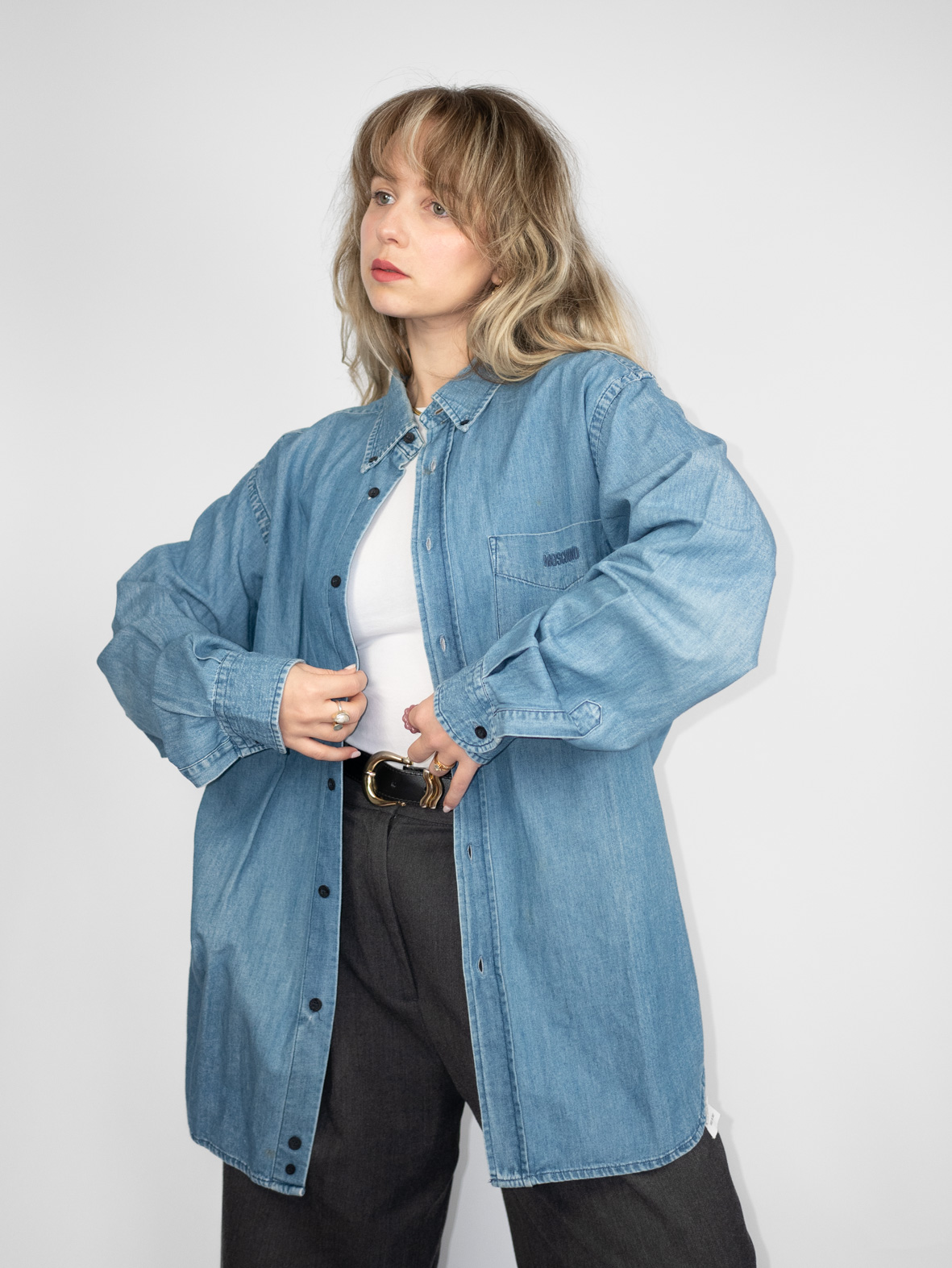 A classic, oversized designer denim shirt from Moschino. The soft blue wash and relaxed fit make it a staple piece for a cool, off-duty look. Layer it over a white tank and leather pants for a modern, streetwear-inspired aesthetic.