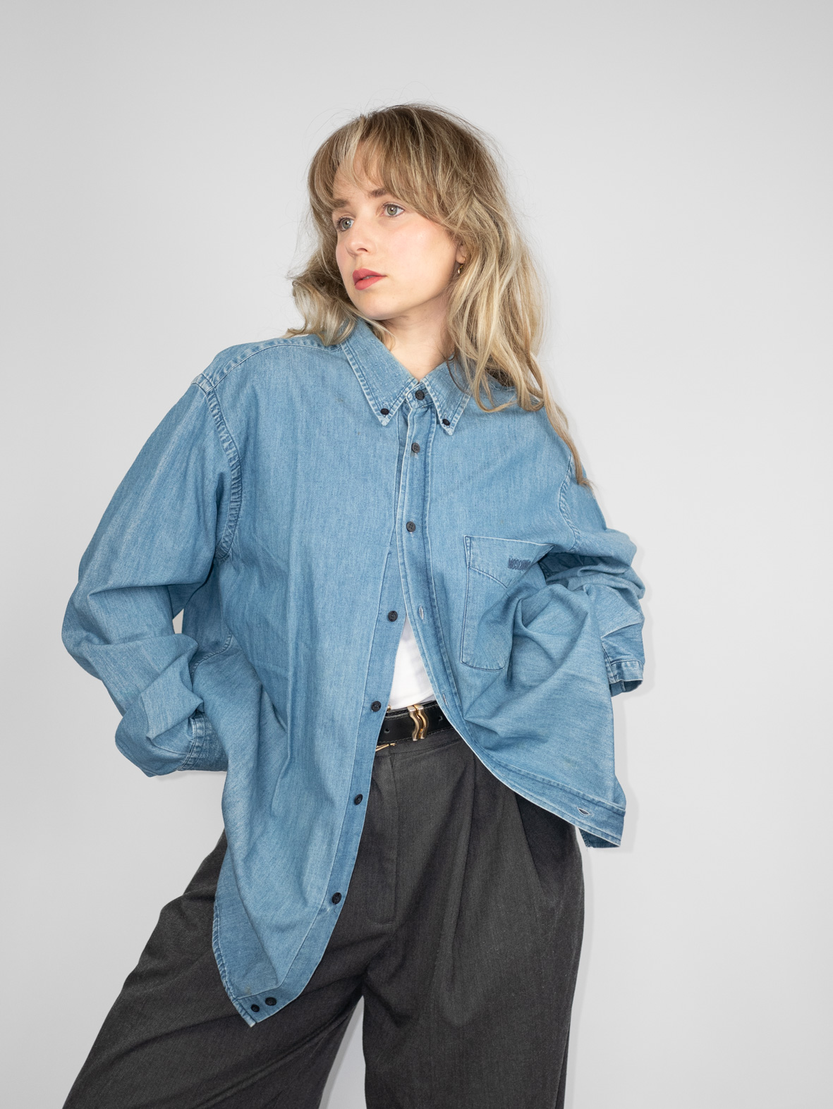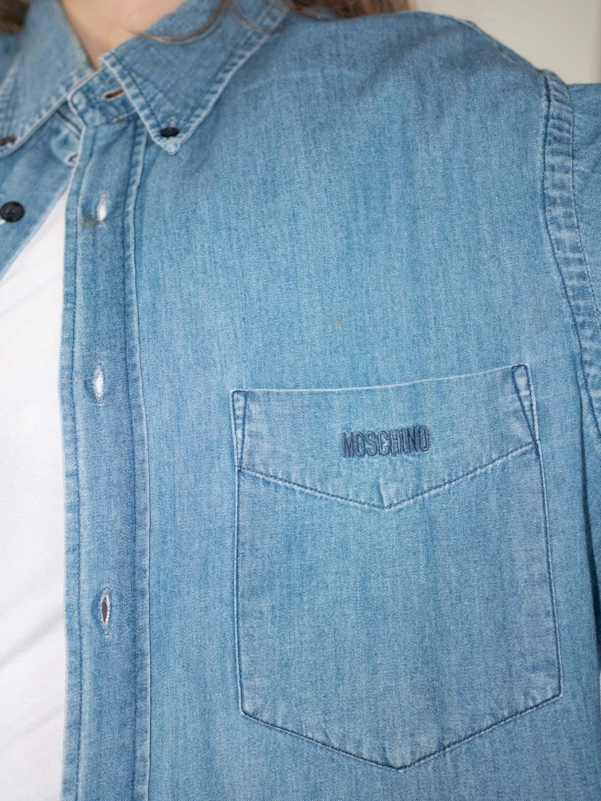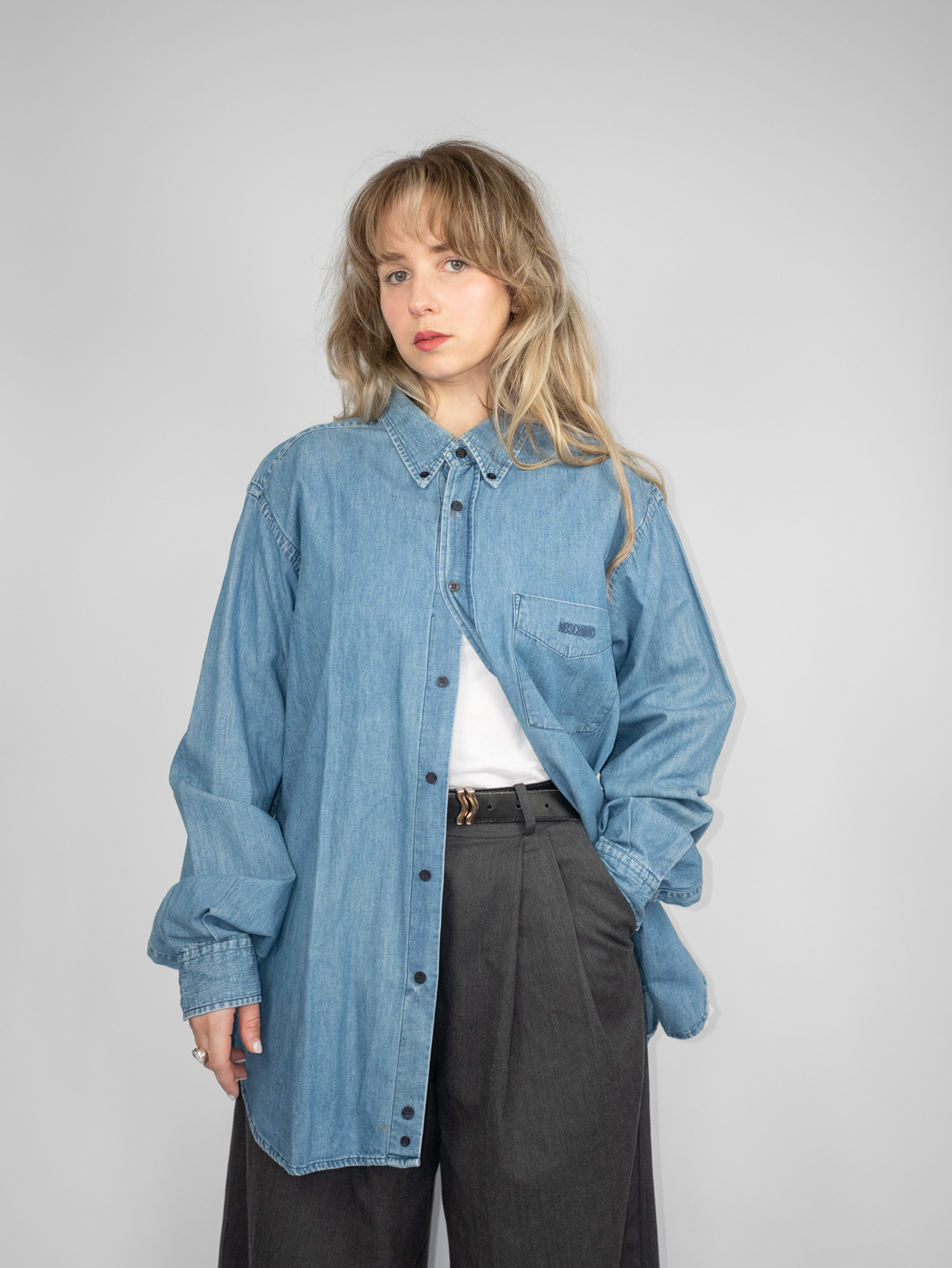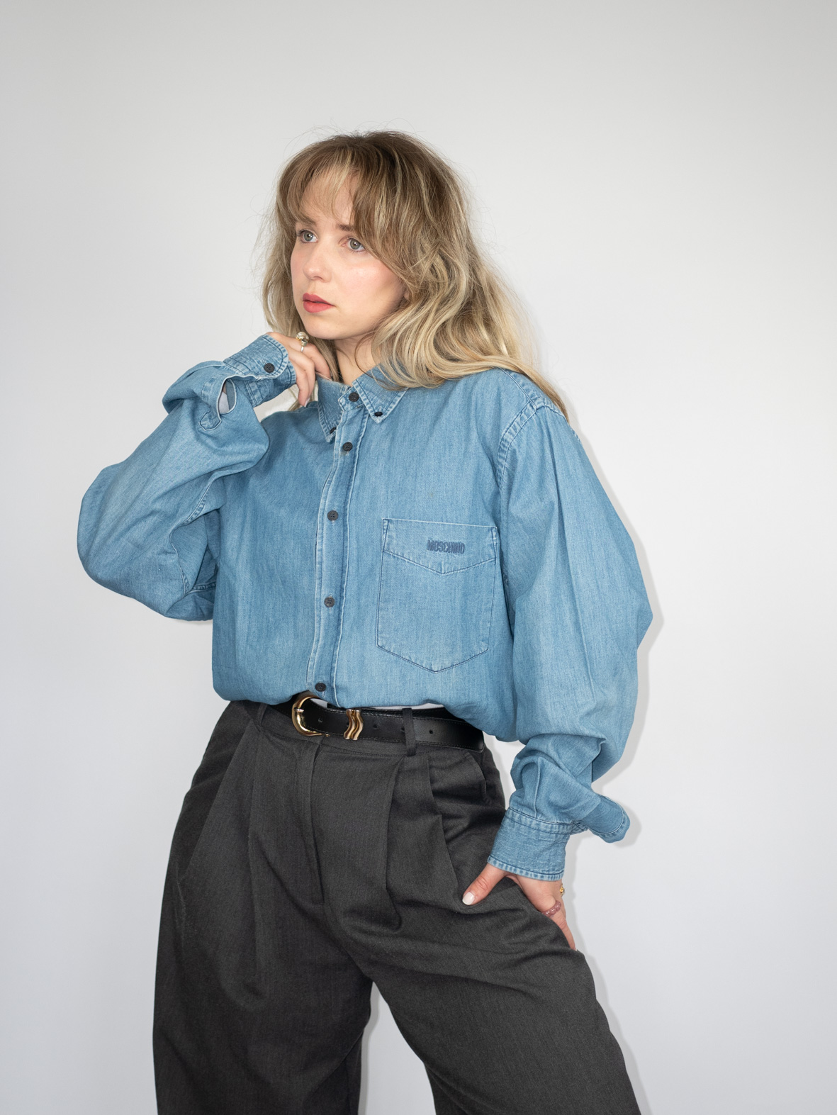 A classic, oversized designer denim shirt from Moschino. The soft blue wash and relaxed fit make it a staple piece for a cool, off-duty look. Layer it over a white tank and leather pants for a modern, streetwear-inspired aesthetic.